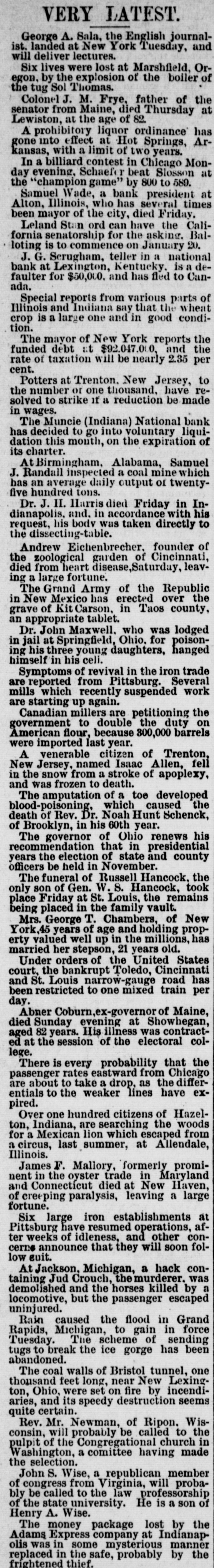 VERY LATEST. George A. Sala, the English journalist. landed at New York Tuesday, and will deliver lectures. Six lives were lost at Marshfield, Oregon, by the explosion of the boiler of Thomas [0S Sm the Colonel J. M. Frye, father of the senator from Maine, died Thursday at Lewiston, at the age of 82. A prohibitory liquor ordinance has gone into effect at Hot Springs, Arkansas, with a limit of two years. In a billiard contest in Chicago Monday evening. Schaefer beat Slosson at the "champion game" by 800 to 589. Samuel Wade, a bank president at Alton, Illinois, who has several times been mayor of the city, died Friday. Leland Stan ord can have the California senatorship for the asking. Bal*07 Amount uo commente 01 si lotting u u! teller 'D 'f bank at Lexington, Kentucky. is a de-uno 01 pay sey pue *000'09$ JOJ 'upe Special reports from various parts of Illinois and Indiana say that the wheat condition pood u! pue euo Inter e s! dose tion. The mayor of New York reports the funded debt at $92.047,000, and the rate of taxation will be nearly 2.35 per cent. Potters at Trenton. New Jersey, to the number or one thousand, have remade by reduction R II strike 01 solved sagas u! The Muncie (Indiana) National bank has decided to go into voluntary liquidation this month, on the expiration of chanter.ru she At Birmingham, Alabama, Samuel J. Randall inspected a coal mine which has an average daily output of twentyfive hundred tons. Dr. J. H. Harris died Friday in Indianapolis, and, in accordance with his request, his body was taken directly to em Andrew Eichenbrecher. founder of the zoological garden of Cincinnati, died from heart disease,Saturday, leaving a large fortune. The Grand Army of the Republic in New Mexico has erected over the county SORL up Carron JO STATE an appropriate tablet. Dr. John Maxwell. who was lodged in jail at Springfield, Ohio. for poisoning his three young daughters, hanged celling siy u! himesly Symptoms of revival in the iron trade are reported from Pittsburg. Several mills which recently suspended work are starting up again. Canadian millers are petitioning the government to double the duty on American flour, because 300,000 barrels were imported last year. A venerable citizen of Trenton, New Jersey, named Isaac Allen, fell 'Axeldode JO stroke e more MOUS the u! and was frozen to death. The amputation of a toe developed blood-poisoning, which caused the death of Rev. Dr. Noah Hunt Schenck, of Brooklyn, in his 60th year. The governor of Ohio renews his recommendation that in presidential years the election of state and county officers be held in November. The funeral of Russell Hancock, the only son of Gen. W.S. Hancock, took place Friday at St. Louis, the remains being placed in the family vault. Mrs. George T. Chambers, of New York,45 years of age and holding property valued well up in the millions, has married her stepson, 21 years old. Under orders of the United States court, the bankrupt Toledo, Cincinnati and St. Louis narrow-gauge road has been restricted to one mixed train per day. Abner Coburn,ex-governor of Maine, died Sunday evening at Showhegan, aged 82 years. His illness was contractcol- electrola the JO session the 18 pe lege. There is every probability that the passenger rates eastward from Chicago are about to take a drop, as the differentials to the weaker lines have expired. Over one hundred citizens of Hazelton, Indiana, are searching the woods for a Mexican lion which escaped from a circus, last summer, at Allendale, Illinois. James F. Mallory, formerly prominent in the oyster trade in Maryland and Connecticut died at New Haven, of creeping paralysis, leaving a large fortune. Six large iron establishments at Pittsburg have resumed operations, after weeks of idleness, and other concerns announce that they will soon folauth MOI At Jackson, Michigan, a hack containing Jud Crouch, the murderer. was demolished and the horses killed by a locomotive, but the passenger escaped uninjured. Rain caused the flood in Grand Rapids, Michigan, to gain in force Tuesday. The scheme of sending tugs to break the ice gorge has been abandoned. The coal walls of Bristol tunnel, one thousand feet long, near New Lexington, Ohio, were set on fire by incendiaries, and its speedy destruction seems quite certain. Rev. Mr. Newman, of Ripon. Wisconsin, will probably be called to the pulpit of the Congregational church in Washington, a comittee having made the selection. John S. Wise, a republican member of congress from Virginia, will probably be called to the law professorship JO uos B SI eH new state the JO Henry A. Wise. The money package lost by the Adams Express company at Indianap-