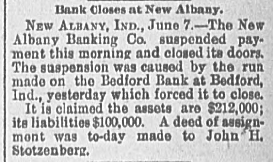 The New Albany Banking Company suspended payment on 1893-06-07 caused by a run on the Bedford Bank (same principal stockholders). A deed of assignment to John H. Stotzenberg was executed the same day, indicating permanent closure/receivership rather than a temporary suspension. Bank type inferred as 'state' from the name 'Banking Company' but not explicitly stated in the articles.