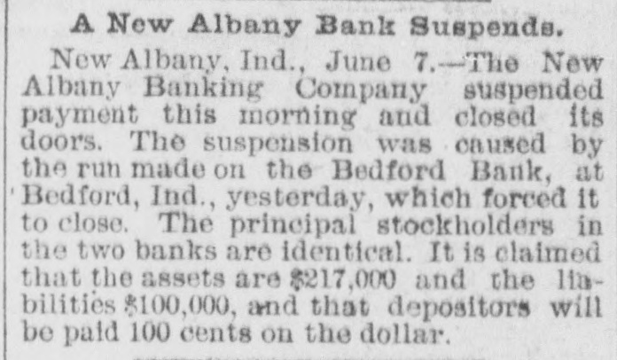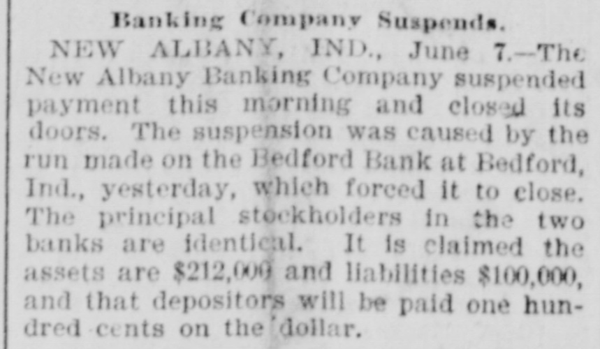 Another Indiana Bank Suspends. NEW ALBANY, Ind., June 7.-The New Albany Banking company has suspended payment as a result of a run on the Bedford, Ind., bank yesterday, both having substantially the same stockholders. Claimed assets are $212,000; liabilities, $100,000. W. L. Greyfogle, one of the principal stockholders in the two banks, executed a deed of trust for $300,000 for the benefit of depositors in the two banks. It is claimed depositors will be paid in full.