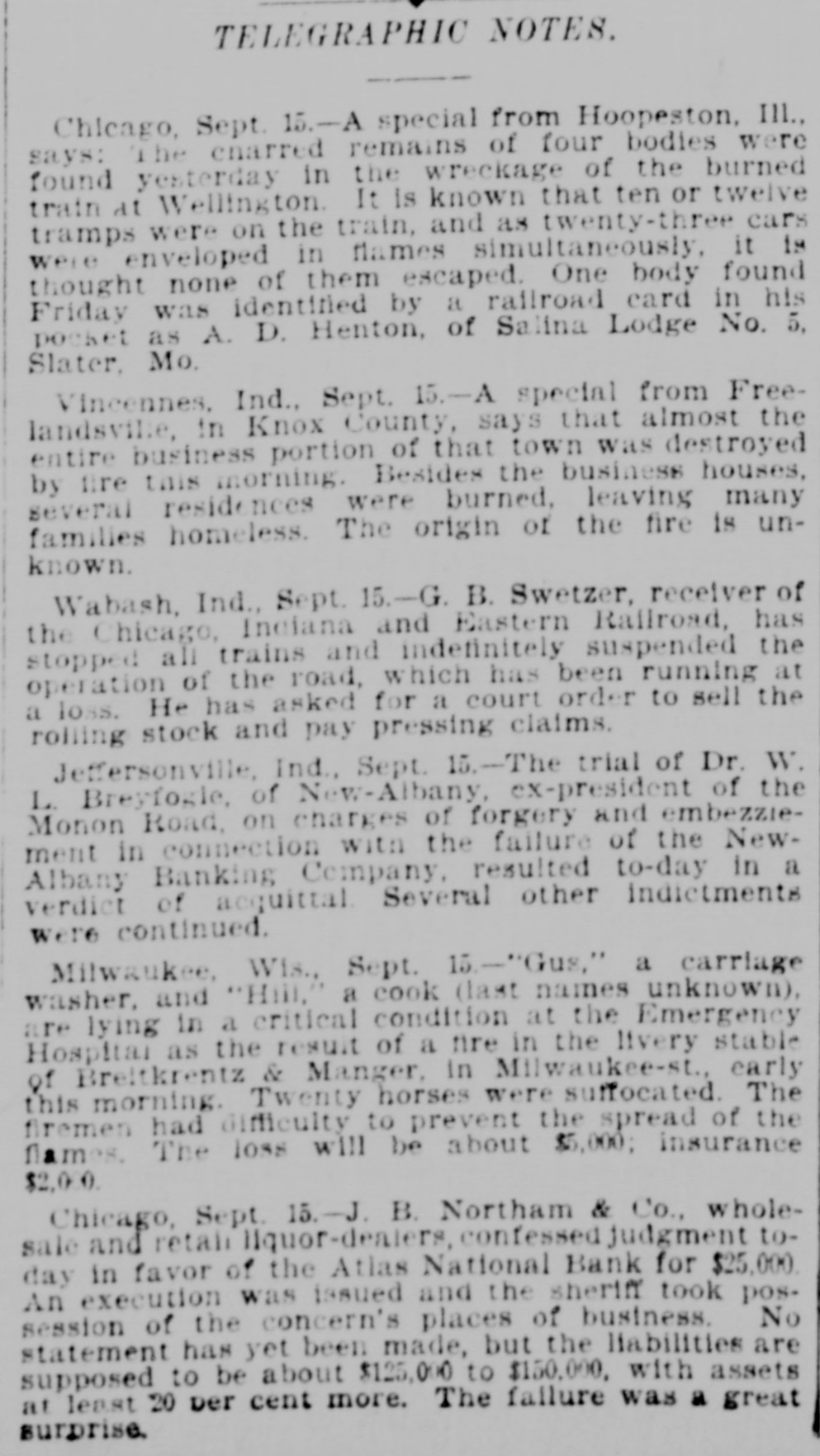 TELEGRAPHIC NOTES. Chicago, Sept. 15.-A special from Hoopeston, III., says: The charred remains of four bodies were found yesterday in the wreckage of the burned train at Wellington. It is known that ten or twelve tramps were on the train, and as twenty-three cars were enveloped in flames simultaneously, it is thought none of them escaped. One body found Friday was identified by a railroad card in his pocket as A. D. Henton, of Salina Lodge No. 5, Slater, Mo. Vincennes, Ind., Sept. 15.-A special from Freelandsville, in Knox County, says that almost the entire business portion of that town was destroyed by fire this morning. Besides the business houses, several residences were burned, leaving many families homeless. The origin of the fire is unknown. Wabash, Ind., Sept. 15.-G. B. Swetzer, receiver of the Chicago, Indiana and Eastern Railroad, has stopped all trains and indefinitely suspended the operation of the road, which has been running at a loss. He has asked for a court order to sell the rolling stock and pay pressing claims. Jeffersonville, Ind., Sept. 15.-The trial of Dr. W. L. Breyfogle, of New-Albany, ex-president of the Monon Road, on charges of forgery and embezziement in connection with the failure of the NewAlbany Banking Company, resulted to-day in a verdict of acquittal. Several other indictments were continued. Milwaukee, Wis., Sept. 15.-"Gus," a carriage washer, and "Hill," a cook (last names unknown), are lying in a critical condition at the Emergency Hospital as the result of a fire in the livery stable of Breitkrentz & Manger, in Milwaukee-st., early this morning. Twenty horses were suffocated. The firemen had difficulty to prevent the spread of the flames. The loss will be about $5,000; insurance $2,000. Chicago, Sept. 15.-J. B. Northam & Co., wholesale and retail Hquor-dealers, confessed judgment today in favor of the Atlas National Bank for $25,000. An execution was issued and the sheriff took possession of the concern's places of business. No statement has yet been made, but the Habilities are supposed to be about $125,000 to $150,000. with assets at least 20 per cent more. The failure was a great surprise.