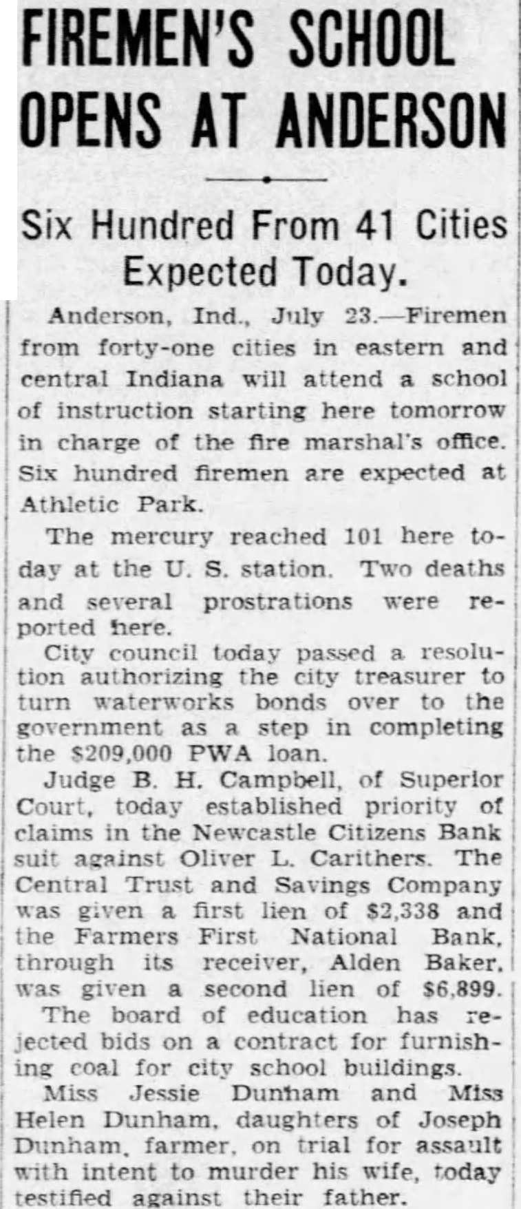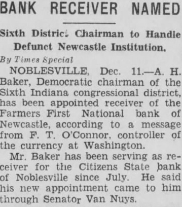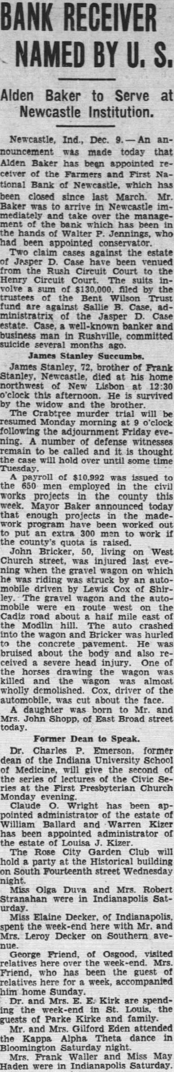 Newcastle, Ind., Dec. nouncement was made today that Alden Baker has been appointed ceiver of the Farmers and First National Bank of which has been closed since last March. Mr. was arrive in Newcastle and take over the managethe bank which has been hands Walter Jennings, who been appointed conservator. Two claim cases against the estate Jasper Case have been venued the Rush Circuit Court to the Henry Circuit Court The suits sum of $130,000. filed the trustees the Bent Wilson Trust are against Sallie Case, administratrix of Jasper D. Case Case, well-known banker business man in Rushville, committed suicide several months ago. James Stanley Succumbs. James Stanley, 72, brother of Frank Stanley, Newcastle, died his home northwest of New Lisbon at this afternoon. He survived widow and the brother. Crabtree murder trial will be resumed Monday morning following the adjournment Friday evenumber of defense witnesses remain to be called and it thought will hold over until some time Tuesday. of was issued the men employed the civil works projects in county this week. Mayor Baker announced today that enough projects in the madeprogram been worked an extra 300 men to work quota raised. John Bricker, 50, living on West Church street, was injured last ning when the wagon on which he riding struck by mobile driven Lewis Cox ShirThe gravel wagon and automobile west the Cadiz road about haif mile east the Modlin The crashed the wagon and Bricker was hurled the concrete He was bruised about the body and also ceived severe head injury. One of the the wagon was killed the was almost wholly Cox, driver of the cut about the face. daughter was born to and John Shopp, of East Broad street today.