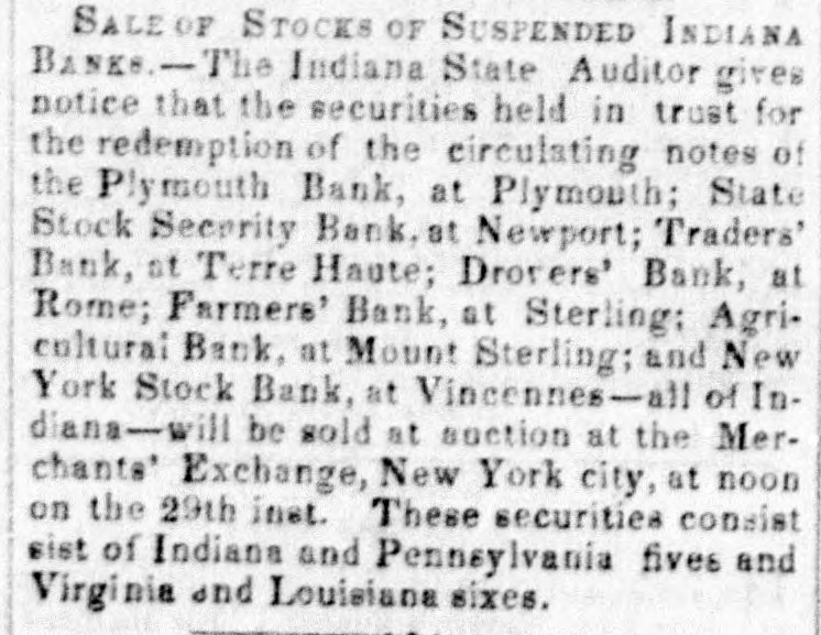 SALE OF STOCKS OF SUSPENDED INDIANA BANKS.-The Indiana State Auditor gives notice that the securities held in trust for the redemption of the circulating notes of the Plymouth Bank, at Plymouth; State Stock Security Bank, at Newport; ... will be sold at auction at the Merchants' Exchange, New York city, at noon on the 29th inst.