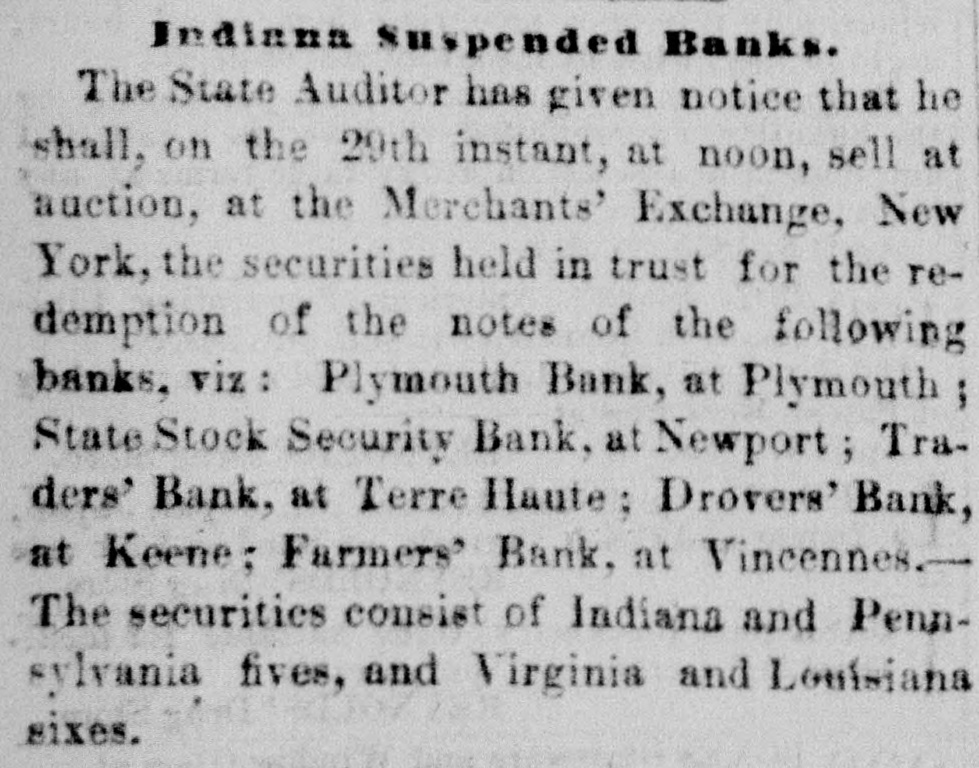 Indiana Suspended Banks. The State Auditor has given notice that he shall, on the 29th instant, at noon, sell at auction, at the Merchants' Exchange, New York, the securities held in trust for the redemption of the notes of the following banks, viz: Plymouth Bank, at Plymouth ; State Stock Security Bank, at Newport; Traders' Bank, at Terre Haute : Drovers' Bank, at Keene; Farmers' Bank, at Vincennes.— The securities consist of Indiana and Pennsylvania fives, and Virginia and Louisiana sixes.