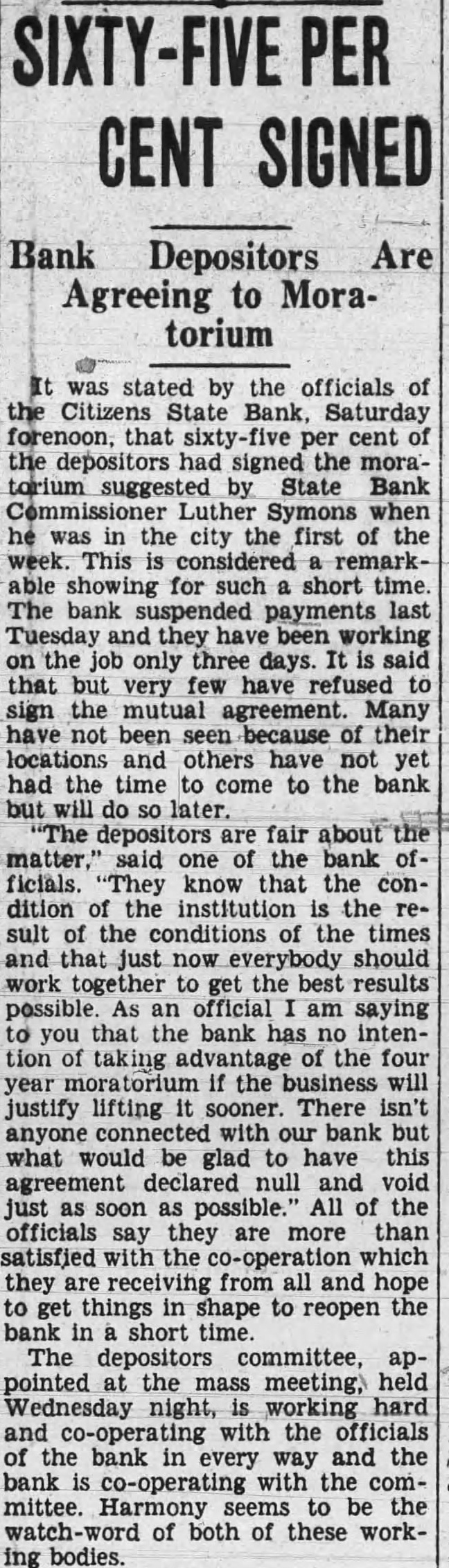 CENT SIGNED Bank Depositors Are Agreeing to Moratorium stated by the officials of Citizens State Bank, Saturday that per cent signed the moratorium suggested by State Bank Symons when city the first of the This considered showing for such short bank suspended payments Tuesday they have been working only three days. said that but very have refused the mutual Many been because their locations and others have not yet had the time to come to the bank will later. depositors are fair the bank know that the condition institution the of the conditions of the times just should work to the results possible an official am saying bank has tion of the if the business will justify lifting sooner. There isn't connected with our bank what would be glad have this agreement declared and void as soon possible." All of the officials say they more than satisfied which they from all and hope things shape to reopen bank in short The depositors committee, appointed the mass meeting, Wednesday night, hard and with the officials the bank in way and the bank with the mittee. Harmony the of both of these bodies.