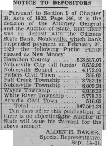 NOTICE TO DEPOSITORS Pursuant to Section 9 of Chapter 33. Acts of 1932. Page 146. it decision of the Attorney General and the Auditor State, there was on deposit with the Citizens State Bank Noblesville which bank suspended payment on February 27. 1933 following Public Funds classed as New Money Hamilton County $13,537.07 Noblesville City all funds) 8,552.92 Noblesville School 4,172.93 Fishers Civil Town 355.62 Fall Creek Township 3,782.15 Noblesville Township 6,809.24 Wayne Township 4,036.39 White River Township 5,778.30 Arcadia Civil Town 516.62 Total $47,591.24 Ten days after this publication if there is no Auditor State will issue his warrant for the above amount. ALDEN' H. BAKER Special Sept. 14-1t.