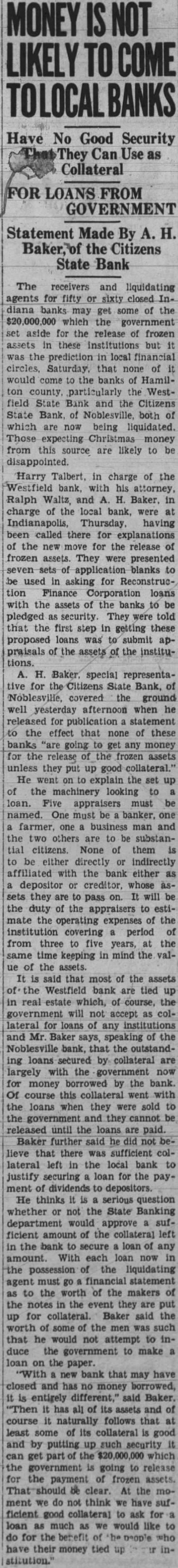 Have No Good Security Can Use Collateral LOANS FROM Statement Made By the Citizens State Bank The receivers and liquidating agents for fifty or closed diana banks may get some of the which the government aside for the release of frozen assets in these institutions but the prediction in local financial circles, Saturday, that none of would come to the banks of Hamilton county particularly the Westfield State Bank and the Citizens State Bank. of Noblesville, both of which are now being liquidated. Those expecting Christmas money from this source are likely to be disappointed. Harry Talbert, in charge of the Westfield bank, with his attorney, Ralph Waltz, and H. Baker, in charge of the local bank, were at Indianapolis, Thursday, having been called there for explanations of the new move for the release of frozen assets. They were presented seven sets of application blanks to be used in asking for tion Finance Corporation loans with the assets of the banks to be pledged security. They were told that the first step in getting these proposed loans was submit praisals of assets the institutions. H. Baker. special representative for the Citizens State Bank, of Noblesville, covered the ground well yesterday afternoon when he released for publication statement to the effect that none of these banks "are going get any money for the release of the frozen assets unless they put up good collateral. He went on to explain the set up of the machinery looking to loan. Five appraisers must be named. One must be banker, one farmer, one business man and the two others are to be substantial citizens. None of them to be either directly or indirectly affiliated with the bank either depositor or creditor, whose assets they are to pass on. will be the duty of the appraisers to estimate the operating expenses of the institution covering period of from three to five years, at the same time keeping in mind the value of the assets. said that most of the assets Westfield bank are tied in which, of course, the government will not accept collateral for loans of any institutions and Mr. Baker says, speaking of the Noblesville bank, that the outstanding loans secured by collateral are largely with the government now for money borrowed by the bank. Of course this collateral went with the loans when they were sold to the government and they cannot released until the loans are paid. Baker further said he did not lieve that there was sufficient collateral left in the local bank justify securing loan for the payment of dividends to depositors. He thinks a serious question whether or not the State Banking department would approve sufficient amount of the collateral left in the bank to secure loan of any amount. With each loan now in the possession the liquidating agent must financial statement as to the worth of the makers of the notes in the event they are put for collateral. Baker said the worth of some the men was such that he would not attempt to induce the government to make loan on the paper. "With new bank that may have closed and has no money borrowed, is entirely different," said Baker. "Then it has all of its assets and course it naturally follows that at least some of its collateral is good and by putting up such security can the which government going to release for the payment of frozen assets. clear. At the ment we do think we have ficient good collateral ask loan much as would like for the have their money tied