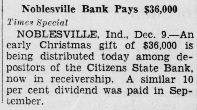Noblesville Bank Pays $36,000 Times Special NOBLESVILLE, Ind., Dec. 9.-An early Christmas gift of $36,000 is being distributed today among depositors of the Citizens State Bank, now in receivership. A similar 10 per cent dividend was paid in September.