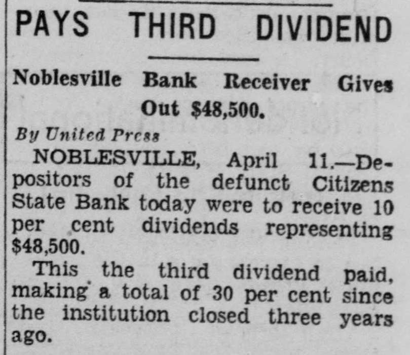 PAYS THIRD DIVIDEND Noblesville Bank Receiver Gives Out $48,500. By United Press NOBLESVILLE, April 11.-Depositors of the defunct Citizens State Bank today were to receive 10 per cent dividends representing $48,500. This / the third dividend paid, making a total of 30 per cent since the institution closed three years ago.