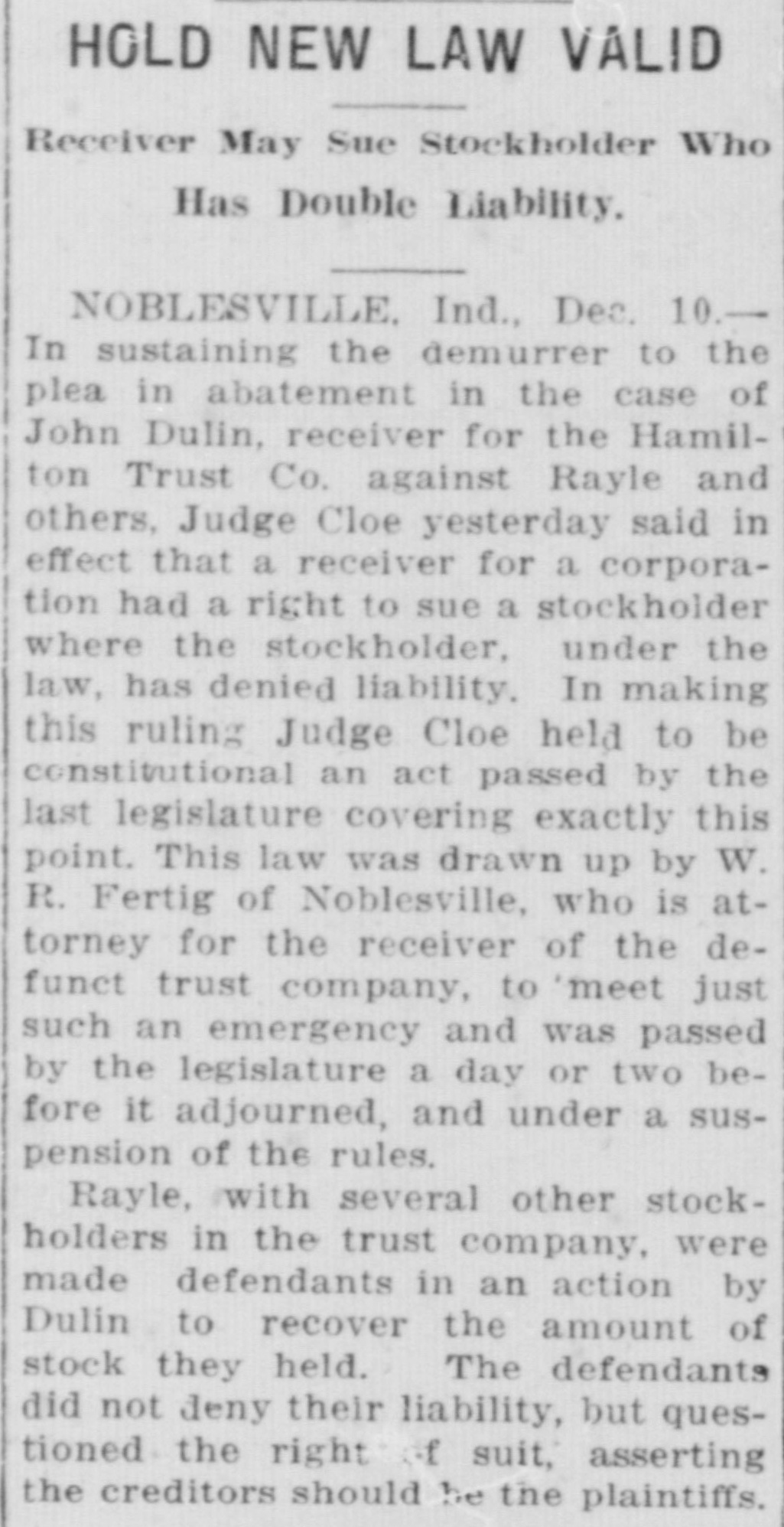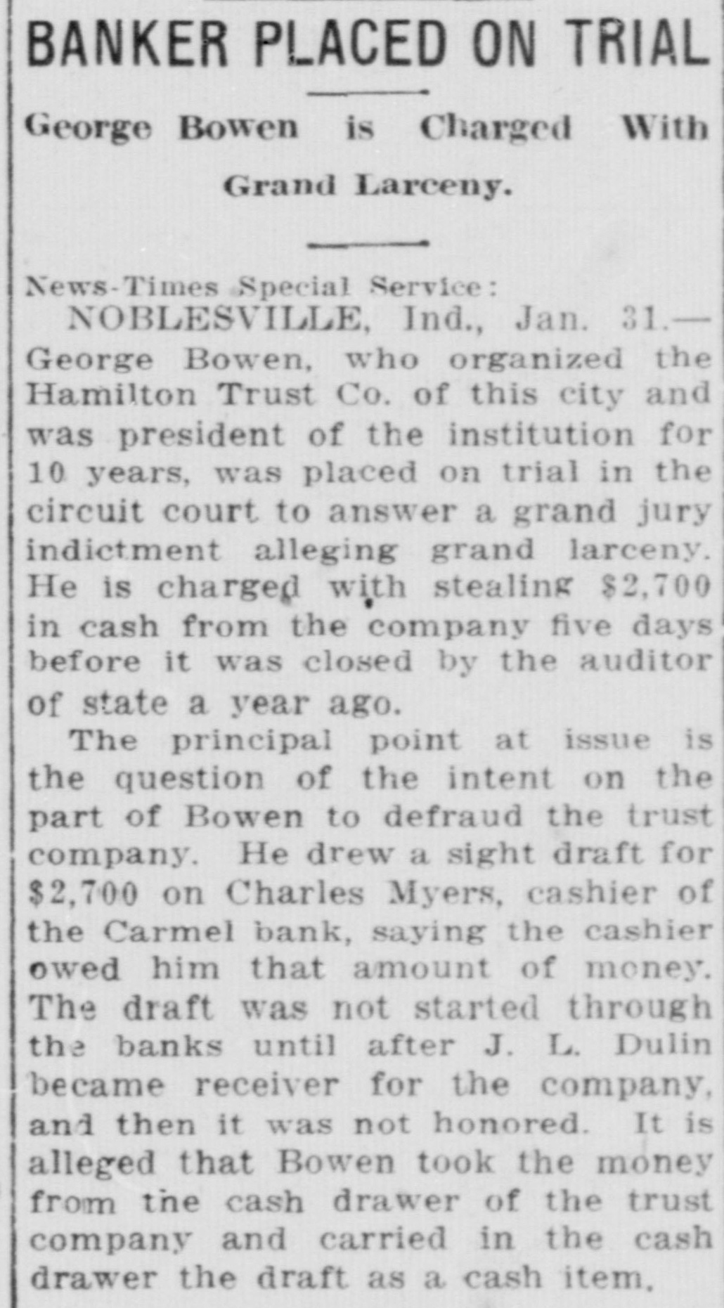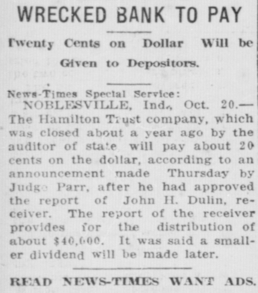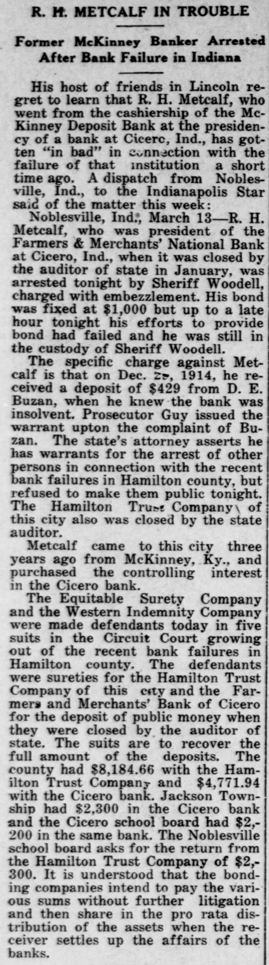 R. H. METCALF IN TROUBLE Former McKinney Banker Arrested After Bank Failure in Indiana His host of friends in Lincoln regret to learn that R. H. Metcalf, who went from the cashiership of the McKinney Deposit Bank at the presidency of a bank at Cicerc, Ind., has gotten "in bad" in connection with the failure of that institution a short time ago. A dispatch from Noblesville, Ind., to the Indianapolis Star said of the matter this week: Noblesville, Ind., March 13-R. H. Metcalf, who was president of the Farmers & Merchants' National Bank at Cicero, Ind., when it was closed by the auditor of state in January, was arrested tonight by Sheriff Woodell, charged with embezzlement. His bond was fixed at $1,000 but up to a late hour tonight his efforts to provide bond had failed and he was still in the custody of Sheriff Woodell. The specific charge against Metcalf is that on Dec. 25, 1914, he received a deposit of $429 from D. E. Buzan, when he knew the bank was insolvent. Prosecutor Guy issued the warrant upton the complaint of Buzan. The state's attorney asserts he has warrants for the arrest of other persons in connection with the recent bank failures in Hamilton county, but refused to make them public tonight. The Hamilton Trust Company\ of this city also was closed by the state auditor. Metcalf came to this city three years ago from McKinney, Ky., and purchased the controlling interest in the Cicero bank. The Equitable Surety Company and the Western Indemnity Company were made defendants today in five suits in the Circuit Court growing out of the recent bank failures in Hamilton county. The defendants were sureties for the Hamilton Trust Company of this city and the Farmers and Merchants' Bank of Cicero for the deposit of public money when they were closed by the auditor of state. The suits are to recover the full amount of the deposits. The county had $8,184.66 with the Hamilton Trust Company and $4,771.94 with the Cicero bank. Jackson Township had $2,300 in the Cicero bank and the Cicero school board had $2,200 in the same bank. The Noblesville school board asks for the return from the Hamilton Trust Company of $2,300. It is understood that the bonding companies intend to pay the various sums without further litigation and then share in the pro rata distribution of the assets when the receiver settles up the affairs of the banks.