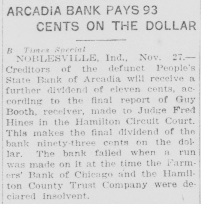 ARCADIA BANK PAYS 93 CENTS ON THE DOLLAR B Times Special NOBLESVILLE, Ind., Nov. 27.Creditors of the defunct People's State Bank of Arcadia will receive a further dividend of eleven. cents, according to the final report of Guy Booth, receiver, made to Judge Fred Hines in the Hamilton Circuit Court. This makes the final dividend of the bank ninety-three cents on the dollar. The bank failed when a run was made on it at the time the Farmers' Bank of Chicago and the Hamilton County Trust Company were declared insolvent.