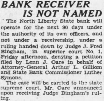 BANK RECEIVER IS NOT NAMED The North Liberty State bank will operate for the next 90 days under the authority its own officers, and under receivership, under ruling handed down by Judge Fred superior court No. Friday afternoon, denying petition filed Lenn Oare in behalf Arthur Gilliom and State Bank Commissioner Luther Symons. The will be carried to the state Mr. upon receiving Judge Bingham's rul-