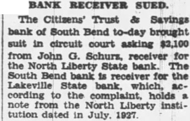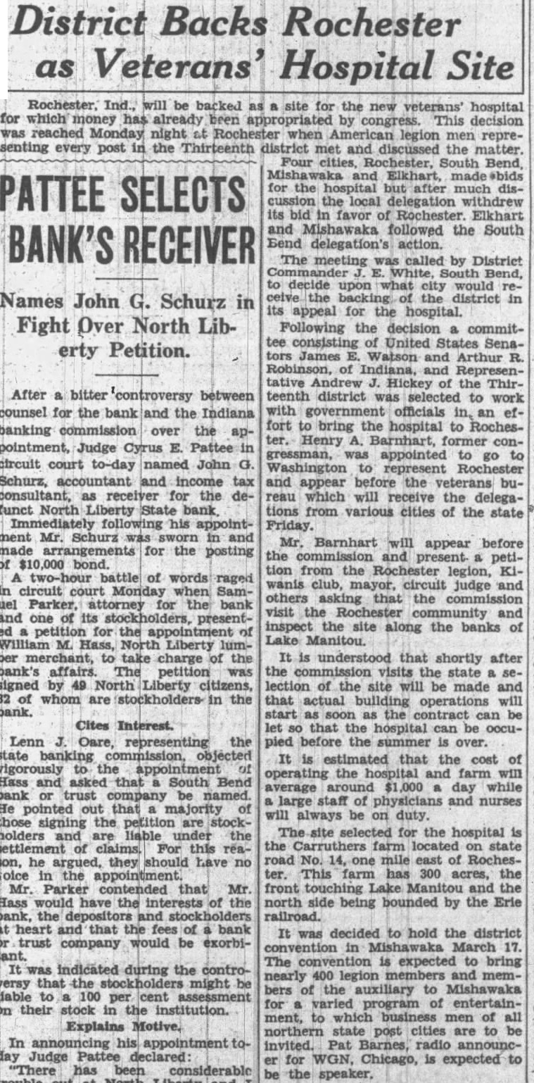 District Backs Rochester Veterans' Site as Hospital Rochester, Ind., will be backed site for the new veterans' hospital for which already been by This decision reached Monday night at when legion representing every post the Thirteenth met and discussed the matter. Four Bend, Elkhart, made #bids for the after much disPATTEE SELECTS cussion the local delegation withdrew its favor Rochester. Elkhart and Mishawaka followed the South BANK'S RECEIVER Bend delegation's action. The meeting called by District Bend, decide upon would Names John district in G. Schurz in its appeal for the hospital. Fight Over North Lib- Following the decision committee consisting of United States Senaerty Petition. James Watson and Arthur R. Robinson, Indiana, Representative Andrew Hickey the ThirAfter bitter controversy between teenth district was selected to work counsel for the the Indiana with government officials an effort to bring the hospital to Rochesbanking commission over the apHenry Barnhart, conpointment, Judge Cyrus Pattee gressman, appointed circuit court to-day named John Washington Schurz, accountant and income tax and appear before veterans buconsultant, receiver for the which receive the delegafunct North Liberty State bank, tions from various cities of the state Immediately following his appoint- Friday. ment Mr. Schurz was sworn Mr. Barnhart appear before made arrangements for the posting the and peti$10,000 bond. tion from the Rochester legion, Kitwo-hour battle of words raged wanis club, circuit judge in circuit Monday when Samothers that the attorney the bank visit Rochester and and one of its stockholders, presentinspect site along the banks for the Lake M. Hass, Liberty ber take charge the understood that shortly after bank's affairs. petition the the signed by 49 North citizens, lection of the site will be made and whom are in the that will bank. as be Cites Interest. let that the hospital can be occuLenn Oare, representing the pied before the summer over. state objected It is that the cost vigorously the operating the and farm Hass asked that South Bend day while trust company be named. large of physicians and nurses He pointed out that of will always be on duty. those signing the petition are stockThe site selected for the hospital holders liable under the settlement of claims. For this rea- the Carruthers farm state he they should have No. mile east of Rochesargued, no the appointment. ter. This farm acres, the Parker contended that Mr. front Lake the Hass would have the interests of the north side being bounded by the Erie and railroad. at heart that the bank It was decided to hold the district trust company would be exorbiconvention Mishawaka March 17. tant. The convention is expected to bring indicated during the contronearly 400 legion memmight be bers of the auxiliary to Mishawaka liable 100 cent for varied program of entertainon their stock in the institution. ment, which men of all Explains Motive. northern state post cities to In invited. Pat Barnes, radio announcday Judge for WGN, Chicago, expected to "There has be speaker, North