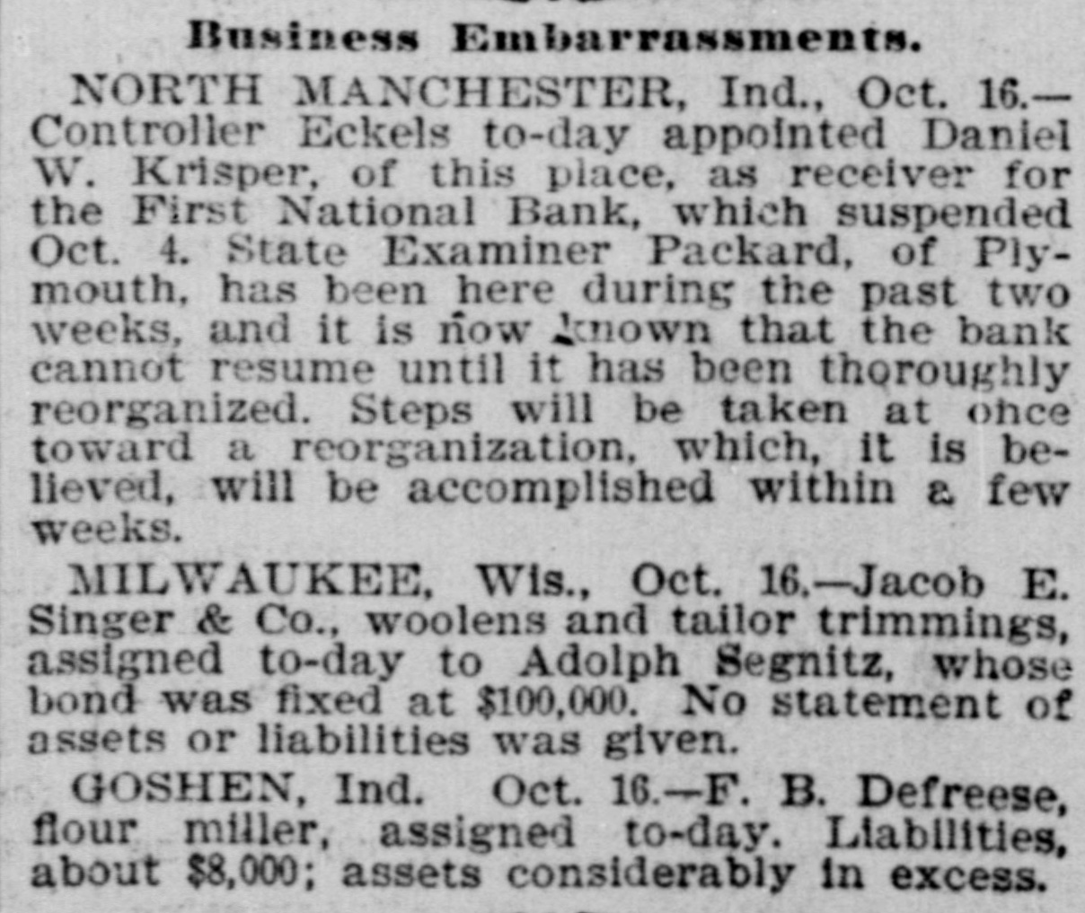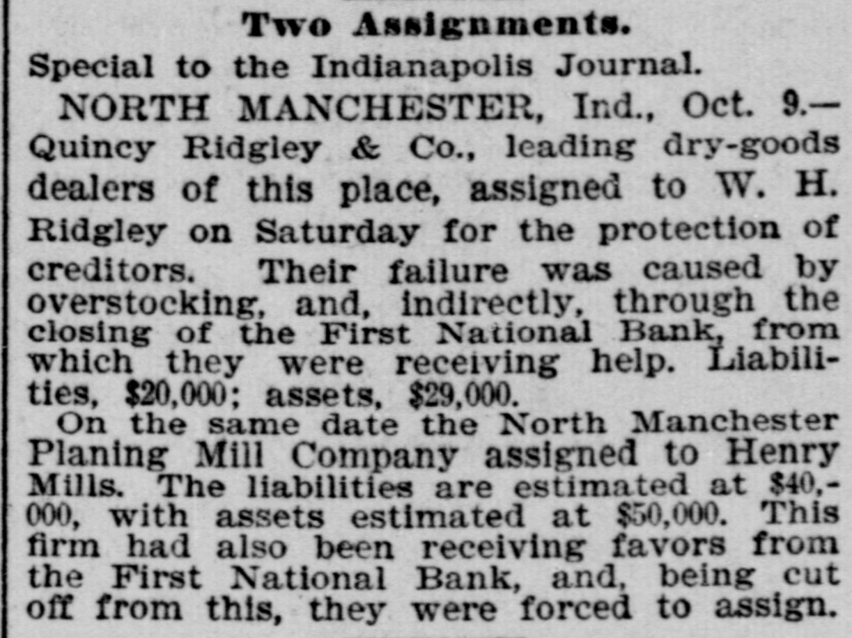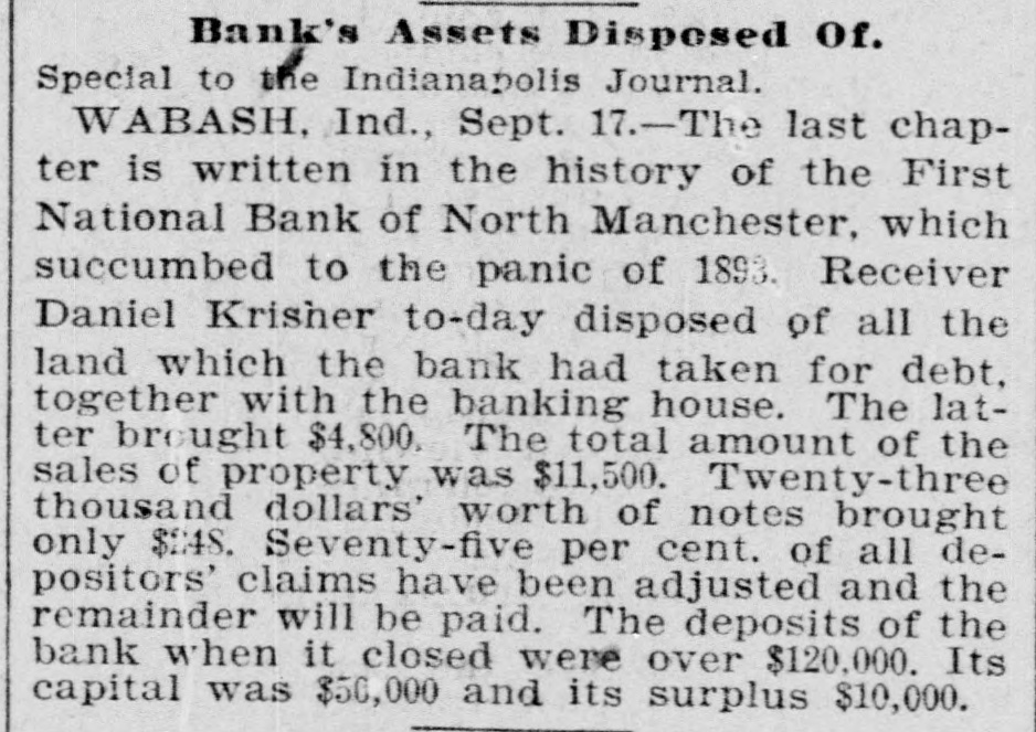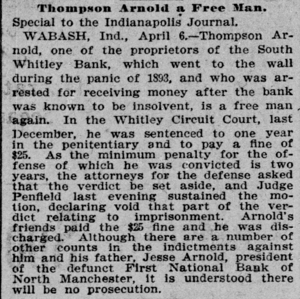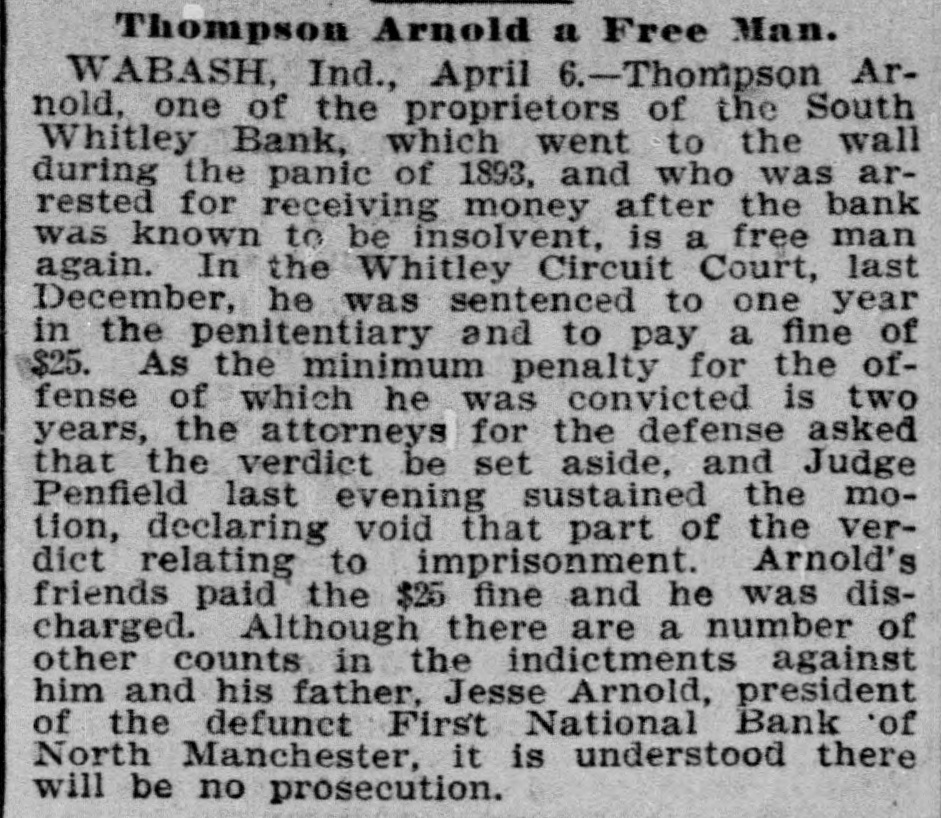 effected him keenly. Mr. Arnold, it seems, gave Mr. Boos notes for $3,000, money borrowed, and it is on these obligations the plaintiff seeks to recover. The defendant gave his evidence unhesitatingly and impressed all with his truthfulness. He said that of his 200 shares of stock in the First national bank forty of them, par value $100, had been transfered to Romeo L. DePuy of Indianapolis to satisfy a claim for $4,500 borrowed money. The other shares had been assigned to North Manchester parties from whom he had obtained loans. His real estate and every dollar's worth of personal he had in the world had been turned over to the broken bank or his creditors. When asked if he retained nothing, Mr. Arnold sadly replied, "I have nothing left whatever but the few household goods I had. Everything else is gone." Previous to the bank failure Mr. Arnold was worth from $50,000 to $60,000, half of which was in bank stock, that is not now worth 25 cents on the dollar. Though fate has been unkind to him, and some of his creditors may lose, there is no one in North Manchester who questions his integrity. He was more sinned against than sinning.-Wabash Plain Dealer.