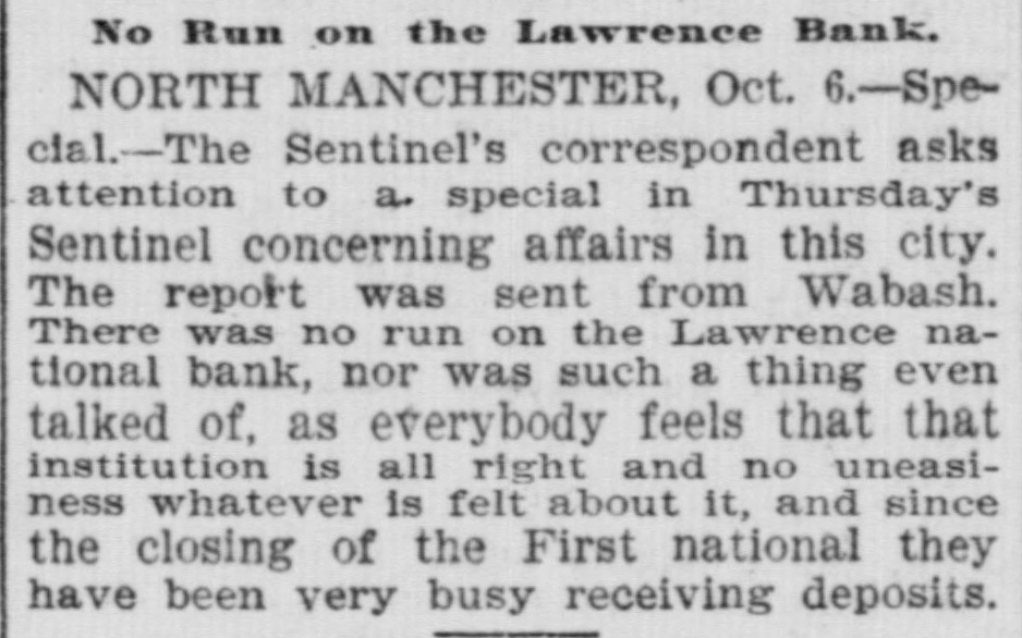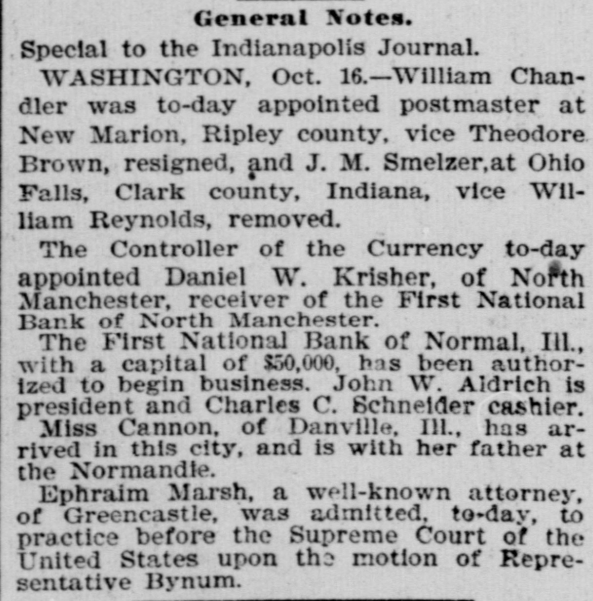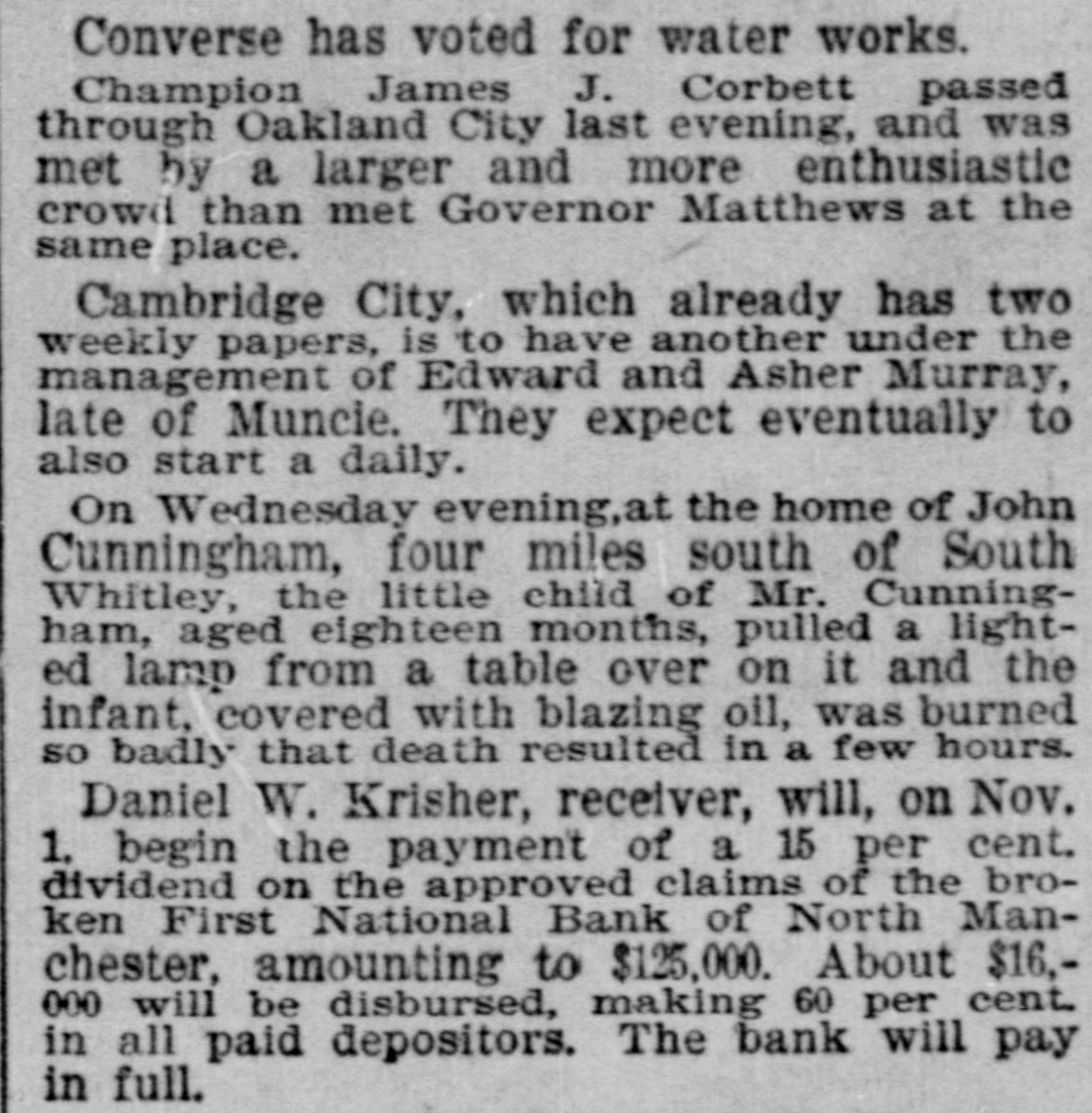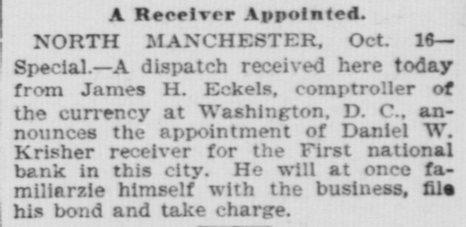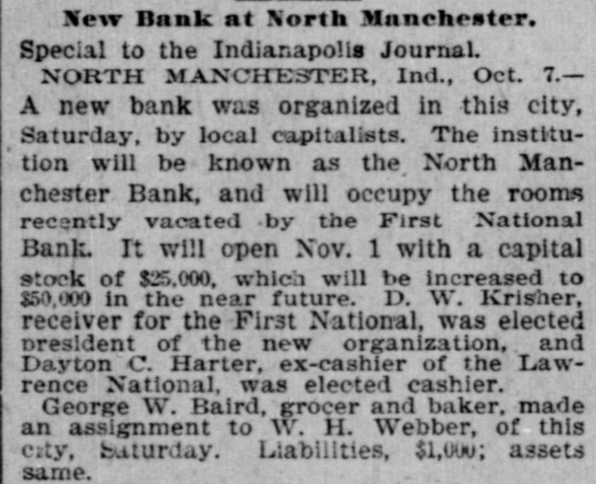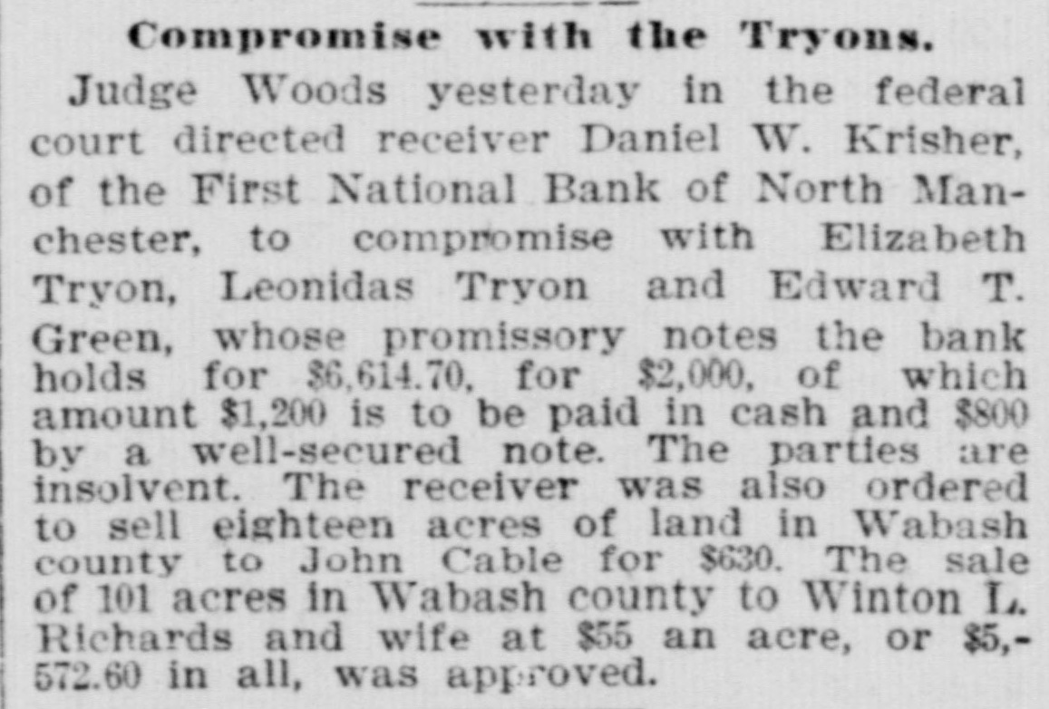 effected him keenly. Mr. Arnold, it seems, gave Mr. Boos notes for $3,000, money borrowed, and it is on these obligations the plaintiff seeks to recover. The defendant gave his evidence unhesitatingly and impressed all with his truthfulness. He said that of his 200 shares of stock in the First national bank forty of them, par value $100, had been transfered to Romeo L. DePuy of Indianapolis to satisfy a claim for $4,500 borrowed money. The other shares had been assigned to North Manchester parties from whom he had obtained loans. His real estate and every dollar's worth of personal he had in the world had been turned over to the broken bank or his creditors. When asked if he retained nothing, Mr. Arnold sadly replied, "I have nothing left whatever but the few household goods I had. Everything else is gone." Previous to the bank failure Mr. Arnold was worth from $50,000 to $60,000, half of which was in bank stock, that is not now worth 25 cents on the dollar. Though fate has been unkind to him, and some of his creditors may lose, there is no one in North Manchester who questions his integrity. He was more sinned against than sinning.-Wabash Plain Dealer.