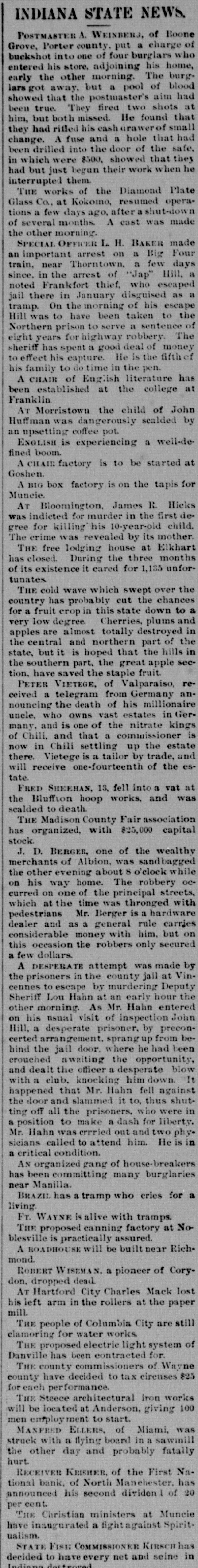 Manager Heagany was pleased to say to a Telegram man Tuesday that the glass trade is improving every day and that the number of increased orders made the outlook encouraging. This fire the Hartford City glass company has made a better quality of glass than at any time since its inception. Monday a full settlement was made with ali its employes, something like $30,000 being paid. This establishes the solidity of our glass company, which in times like these can pay dollar for dollar, when other like concerns over the belt are not even paying market money in full. Regardless of tariff regulations, Mr. Heagany states that the factory would run right along, if the orders come in as they have within the past two weeks. All the other industries in Hartford City are grinding along with as much hum and vim as ever. The paper mills find it difficult to fill orders and ship on time contracted for. Their product is as good as any mills of the country afford and the demand for it seems steadily increasing. Hubbard's spoke factory, though running but five days in a week now, will soon run full time. The stave factory of Meredith, Damon & Croninger, the plant of the National hoop company, Mercer & Brannum and other concerns are all operating and in excellent condition.-Hartford City Telegram.