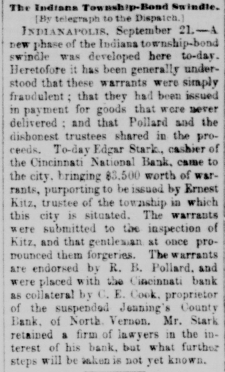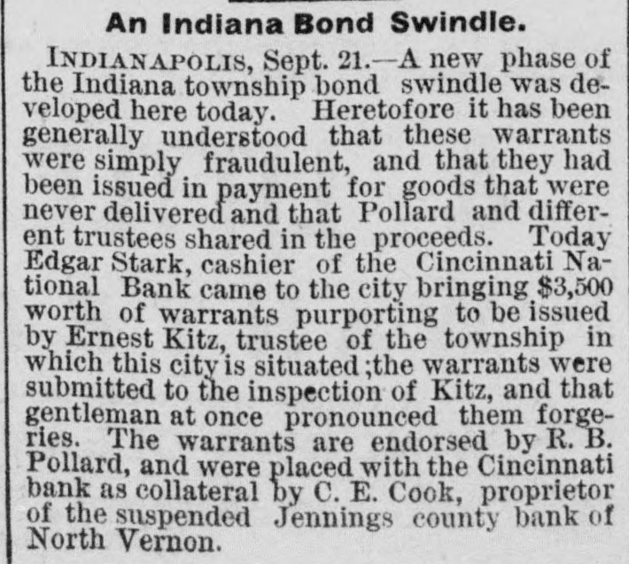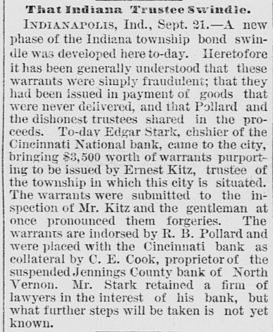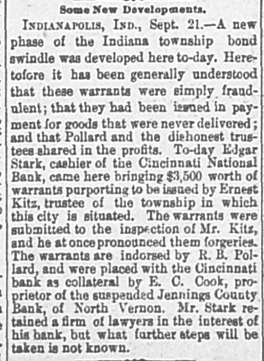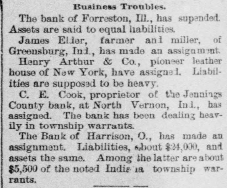NEWS IN BRIEF. Mrs. Emma Shanabrook was run over by a switch engine at Mansfield, O., and killed. r William Finley, an aged farmer, living t near Carmi, Ills, brutally murdered his a wife, aged 60 years. 8 The boiler of a steam threaher explod1 ed near Bryan, O., killing C.G. Paster and Wesley Henner. t Mrs. Orilla M. Andrews has med W.J. e 5 Elliott, of the Columbus (0.) Capital, for $5,000 damages for libel. r Henry Arthur & Co., pioneer leather e house of New York, have assigned. Lid abilities are supposed to be heavy. t The contributions received for the ree lief of the sufferers by the tornado at 8 Washington Court House, O., amount to ₺ $5,000. Pitkin & Vaughn, theatrical printers, 1 Chicago, suffer a heavyloss by fire. Other firms in the building incur lesser losses. All the counties of Ohio except Fayette, Hamilton and Harden have made their a semi-annual settlement with the Auditor of State. b Rev. Dr. Famuel W. Duncan has de3 clined the Vassar Presidency, and Rev. J. 1 Ryland Kendrick, of New York, will officid ate pro tem. Dr. W. C. Bennett is under arrest at Lafayette, Ind., charged by Miss Jennie Moore, who has been in his employ, with e violating her person. e Mike Donehour, of Fremont, 0., has deserted his wife and three children, and eloped with the seventeen-year-olddaughter of John Stockboner. t Jacob Wickerham, who attempted to kill his son-in-law at Winchester, O., some y time ago, has been adjadged insine, and n will be sent to the asylum. 0 O. E. Cook, proprietor of the Jennings s County Bank, at North Vernon, Ind., has e assigned. The bank has been dealing y heavily in township warrants. a Among the fourth class postmasters appointed yesterday were. Chas. M. Payne, o at Murraysville, and James M. Hanley, at Winfield, all of West Virginia. Fred Moore, of Logansport, Ind., and W. T. Murray, of Chicago, are in jail at . Frankfort, Ky., charged with attempting to rob the postoffice at Lawrenceburg, Ky. E Miners employed in the coal mines about Silver Creek, in the Akron district, 7. struck against a reduction from seventy3, five to sixty-five cents per ton in the price of mining. The Bank of Harrison, 0., has made an t. assignment. Liabilities, about $24,000, and 3, assets the same. Among the latter are 4. about $5 500 of the noted Indiana township warrants. 4, The Springfield, 0, School Board has resolved to admit colored pupils to the 1. general school buildings where their homes are so remote as to render it im3, possible to attend the colored school. The management of the Ohio Penit, tentiary. notwithstanding promises to the Typographical Union to the contrary, have entered into competition with the Colum9, . bus printing houses, and are soliciting k orders for convict work. Frederick L. Clayton, of the ship brokeri, age firm of F. L. Clayton & Co., Baltimore, 3. Captain Alfred Brotherton and mate 9. George W. Brown are arrested, charged 4 with conspiring against insurance companies by attempting to wreck a vessel. )Manly W. Mason, a Newark, O., attorney serving a term in the Ohio Peniteny tiary for perjury, has been disbarred from practice by Circuit Judges Clarke, Bradberry and Cherrington, at Newark, on :charges that he had altered certain records and papers of the Court.