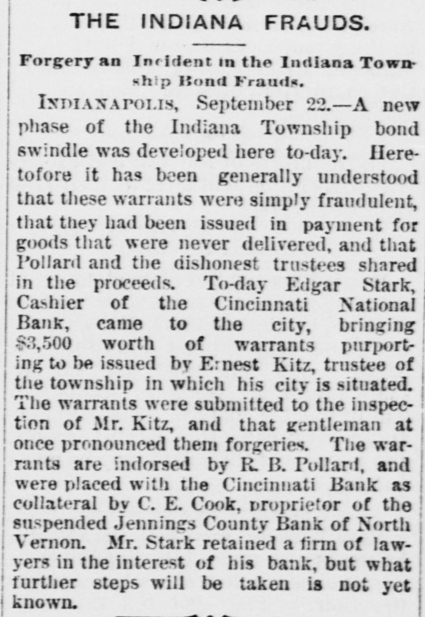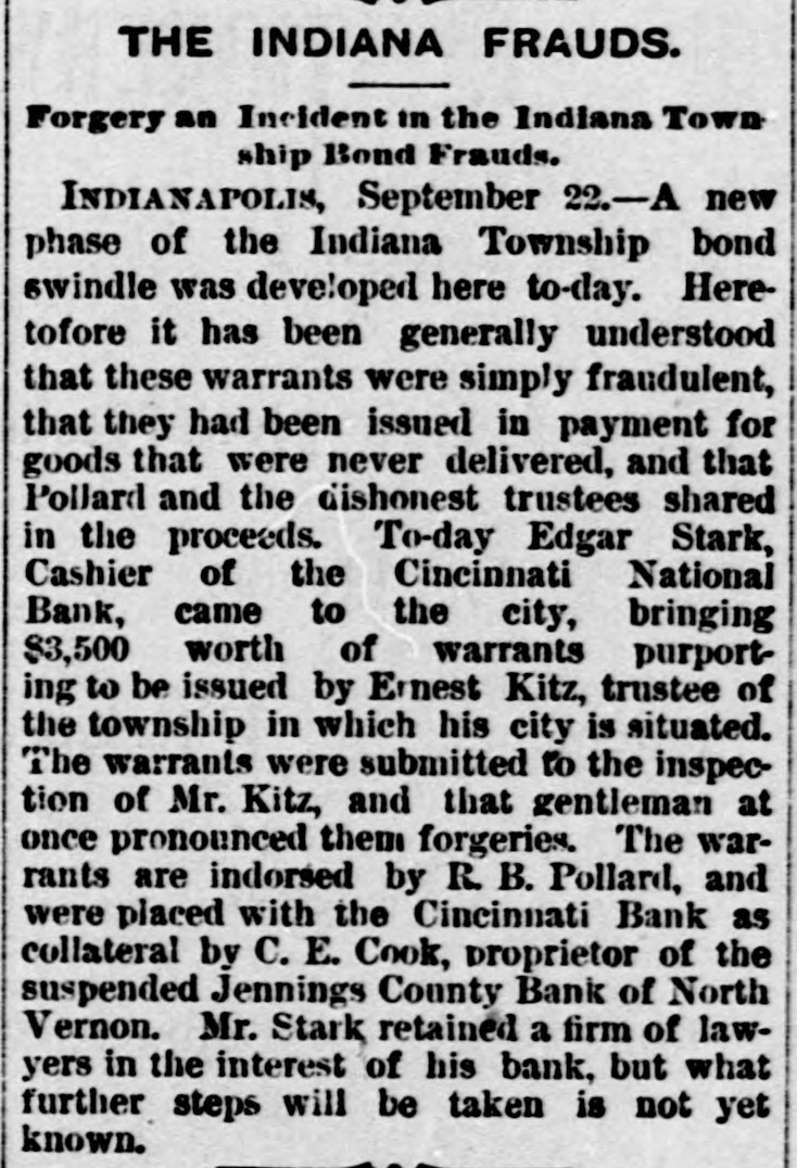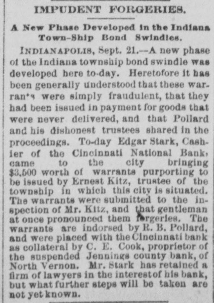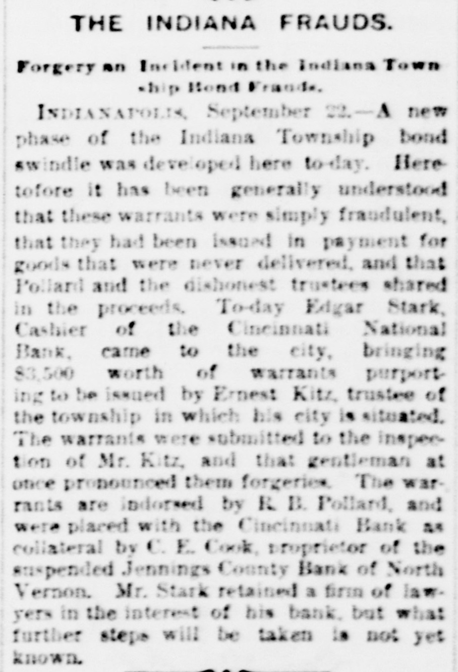 NEWS IN BRIEF. Mrs. Emma Shanabrook was run over by a switch engine at Mansfield, O., and killed. r William Finley, an aged farmer, living t near Carmi, Ills, brutally murdered his a wife, aged 60 years. 8 The boiler of a steam threaher explod1 ed near Bryan, O., killing C.G. Paster and Wesley Henner. t Mrs. Orilla M. Andrews has med W.J. e 5 Elliott, of the Columbus (0.) Capital, for $5,000 damages for libel. r Henry Arthur & Co., pioneer leather e house of New York, have assigned. Lid abilities are supposed to be heavy. t The contributions received for the ree lief of the sufferers by the tornado at 8 Washington Court House, O., amount to ₺ $5,000. Pitkin & Vaughn, theatrical printers, 1 Chicago, suffer a heavyloss by fire. Other firms in the building incur lesser losses. All the counties of Ohio except Fayette, Hamilton and Harden have made their a semi-annual settlement with the Auditor of State. b Rev. Dr. Famuel W. Duncan has de3 clined the Vassar Presidency, and Rev. J. 1 Ryland Kendrick, of New York, will officid ate pro tem. Dr. W. C. Bennett is under arrest at Lafayette, Ind., charged by Miss Jennie Moore, who has been in his employ, with e violating her person. e Mike Donehour, of Fremont, 0., has deserted his wife and three children, and eloped with the seventeen-year-olddaughter of John Stockboner. t Jacob Wickerham, who attempted to kill his son-in-law at Winchester, O., some y time ago, has been adjadged insine, and n will be sent to the asylum. 0 O. E. Cook, proprietor of the Jennings s County Bank, at North Vernon, Ind., has e assigned. The bank has been dealing y heavily in township warrants. a Among the fourth class postmasters appointed yesterday were. Chas. M. Payne, o at Murraysville, and James M. Hanley, at Winfield, all of West Virginia. Fred Moore, of Logansport, Ind., and W. T. Murray, of Chicago, are in jail at . Frankfort, Ky., charged with attempting to rob the postoffice at Lawrenceburg, Ky. E Miners employed in the coal mines about Silver Creek, in the Akron district, 7. struck against a reduction from seventy3, five to sixty-five cents per ton in the price of mining. The Bank of Harrison, 0., has made an t. assignment. Liabilities, about $24,000, and 3, assets the same. Among the latter are 4. about $5 500 of the noted Indiana township warrants. 4, The Springfield, 0, School Board has resolved to admit colored pupils to the 1. general school buildings where their homes are so remote as to render it im3, possible to attend the colored school. The management of the Ohio Penit, tentiary. notwithstanding promises to the Typographical Union to the contrary, have entered into competition with the Colum9, . bus printing houses, and are soliciting k orders for convict work. Frederick L. Clayton, of the ship brokeri, age firm of F. L. Clayton & Co., Baltimore, 3. Captain Alfred Brotherton and mate 9. George W. Brown are arrested, charged 4 with conspiring against insurance companies by attempting to wreck a vessel. )Manly W. Mason, a Newark, O., attorney serving a term in the Ohio Peniteny tiary for perjury, has been disbarred from practice by Circuit Judges Clarke, Bradberry and Cherrington, at Newark, on :charges that he had altered certain records and papers of the Court.
