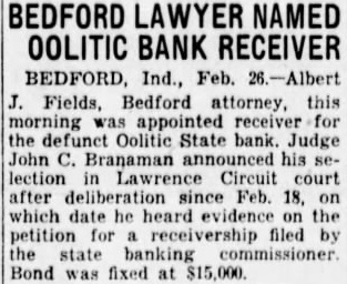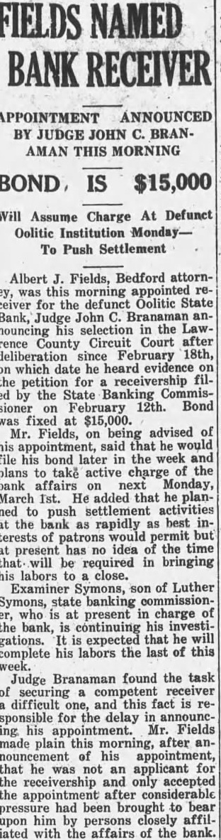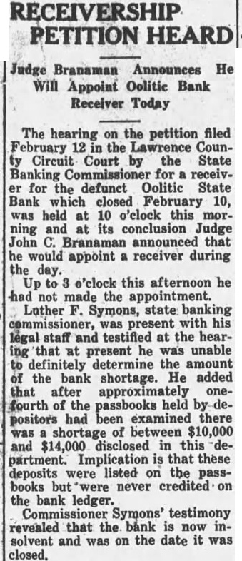 RECEIVERSHIP PETITION HEARD Judge Branaman Announces He Will Appoint Oolitic Bank Receiver Today The hearing on the petition filed February the Lawrence CounCircuit Court the State for receivfor the defunct Oolitic State Bank which closed February 10, was held 10 o'clock this ning its conclusion Judge John Branaman announced that he would appoint receiver during the day. o'clock this afternoon he not made the Lather Symons, state banking with his testified the hearthat present unable definitely determine the the bank shortage. He added that after approximately onefourth the passbooks held dehad examined there positors shortage of between $10,000 and disclosed in this partment. Implication that these deposits were listed on the passbooks never credited the bank ledger. Symons' testimony revealed that the bank is insolvent and was on the date closed.