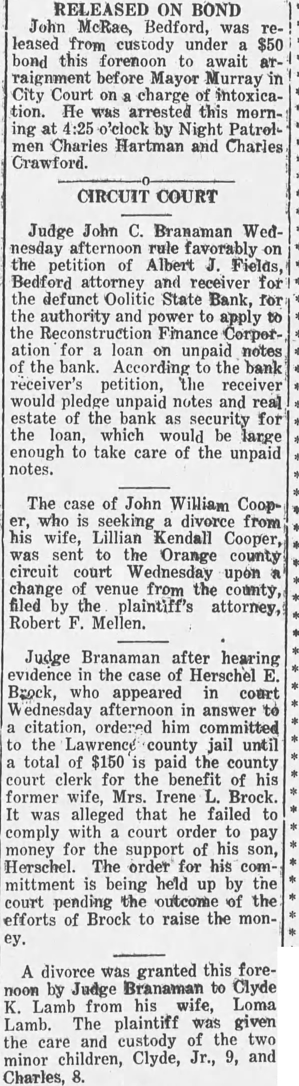 RELEASED ON BOND John McRae, Bedford, was leased from custody under $50 bond this foremoon to await before Mayor Murray City Court on charge tion. He was arrested this ing at 4:25 o'clock by Night Patrolmen Charles Hartman and Charles Crawford. CIRCUIT COURT Judge John C. Branaman rule favorably on the petition of Albert Fields, Bedford and for the defunct Oolitic State Bank, for the authority and power to apply to the Finance Corporation for loan unpaid notes the bank. According the bank petition, the receiver would pledge unpaid notes and real estate of the bank for the loan, which would be large enough take care of the unpaid notes. The case of John William Coopwho seeking divorce from his wife, Lillian Kendall Cooper, was sent the Orange county circuit court Wednesday upon change venue from the county, filed the plaintiff's attorney, Robert Mellen. Judge Branaman after hearing evidence case of Herschel Brock, who appeared in court ednesday in answer citation, ordered him committed the Lawrence county jail until total of $150 paid the county court clerk for the benefit of his former wife, Mrs. Irene Brock. It alleged that he failed comply with court order pay money for the support of his son, Herschel. The order for his being held up by the court pending the outcome the efforts of Brock to raise the money. A divorce was granted this foreby Judge to Clyde Lamb from his wife, Loma Lamb. The plaintiff was given and custody of the two the care minor children, Clyde, Jr., 9, Charles,