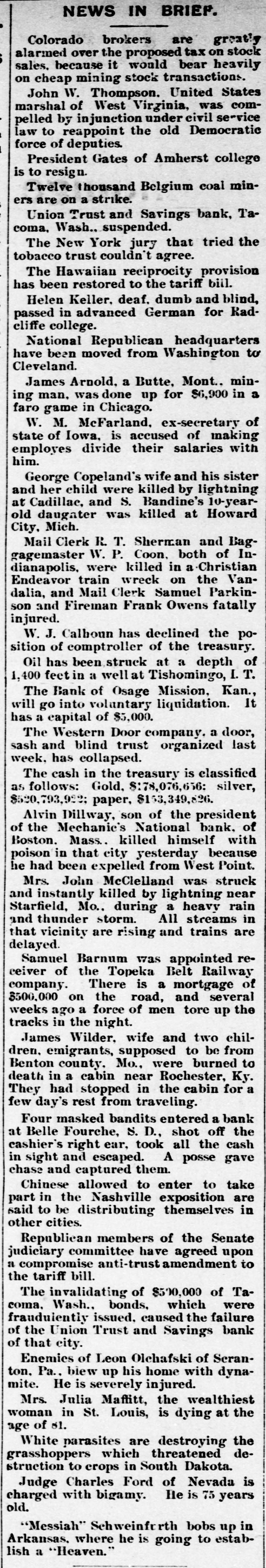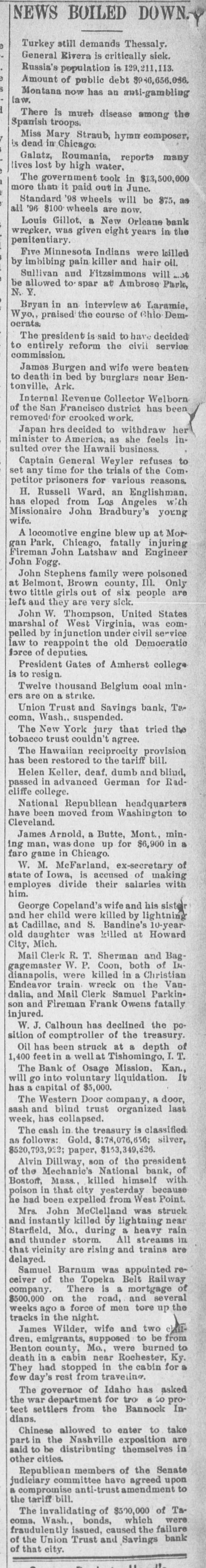 SNAP SHOTS AT HOMENEWS The City library will be closed all day Saturday. Tomorrow will be ladies' free day at Athletic park. Jack Newman will spend the Fourth of July in Horton. A portion of the base ball fence blew down yesterday. Fifty men are now employed on the Kansas avenue bridge. It is said that Harry Stoops' attorneys will at once apply for a pardon. Frank Keith left today for Port Arthur where he will start a drug store. Mr. and Mrs. W. E. Cowan at 1318 Polk, are the parents of a son, Clarence Jethro Cowan. Judge Foster has appointed George W. Clark United States court commissioner in place of John Mileham. Judge Hazen is devoting his time to disposing of the motions and small matters on the district court docket. The supreme court will convene next Tuesday. There will be no session of the court during August and September. The Bank of Osage Mission, or St. Pauls, has gone into voluntary liquidation. William May was president and the bank had a capital stock of $5,000. Samuel Barnum has been appointed receiver of the Topeka Belt line by Judge Foster. This is the abandoned railroad built to Martin's hill. Someone left a box containing 75 baby caps on Police Matron Thorpe's doorstep yesterday for distribution among the poor. Who left the box is not known. During the hall storm the telephone cable on Kansas avenue was damaged. Yes. terday the repair was made, and last night more wires were struck by lightning. William Gunther, late of the Swift & Holliday Drug company, will open a drug store in the new building at the corner of Sixth and Jackson within the next week. The large plate glass cracked during the recent hail storm in the office of Quinton & Quinton in the Columbian building blew in during the storm last evening. Mr. and Mrs. T. P. Culley have taken the Swedenborgian church parsonage at the corner of Sixth and Harrison streets, and will start housekeeping the first of next week. H. M. Spradley, a colored man, was arrested yesterday by the police charged with stealing a set of harness from the shoe merchant, Joe Watts, at his barn, 1020 Quincy street. Mr. A. Bird, proprietor of the St. Joseph Canning company is in the city today establishing the plant of the Topeka Canning company. The factory will be in operation July 15. The wind which accompanied the rain storm yesterday afternoon broke down the iron awning frame in front of W. S. Kale's grocery, 612 Kansas avenue. The plate glass window was blown in. Michael Shase, a North Topeka character, was arrested yesterday at the Union Pacific depot as he was about to fall under the wheels of a moving train. The charge of drunkenness was placed against him. Private Secretary Little is the only man in the state house who wears duck trousers. He is carrying on a campaign of education among the Populists. Some of them still wear suspenders with their belts. Mrs. J. G. Wood will read a paper on "Memory and Emotion as Subjects of Hypnotism" at the Nickel Plate school house, corner of Third and Buchanan streets, tonight. There will be no admission charged. Indications are that the Holiness campmeeting to be held at the fair grounds beginning July 6 will be largely attended. Rev. Isaiah Reid of Chicago, who will have charge of it, is said to be a pulpit orator of note. Mr. P. I. Bonebrake wishes it understood that he alone, and not ex-Governor Thomas A. Osborn, (whom he says he ignominiously defeated) was the victor in the "Aunt Sally" contest at Garfield park last Saturday afternoon. Chief Steele yesterday received a letter from a woman in St. Joseph who claims to be W. R. Wright's wife. Wright is in the county jail charged with stealing a team from Farmer Peter Snyder. He also ran away with Peter Snyder's daughter. A. P. Benson will furnish ice to the state house offices at 25 cents per 100 according to a contract made with the executive council yesterday. G. G. Boardman will haul the coal used at the building from the cars at the rate of 18 cents per ton. Owing to an unreliable report printed in a Kansas City paper the state auditor is flooded with letters demanding payment on Price raid claims. There were no appropriations for that purpose by the last legislature and there is no money to pay the claims and probably never will be. The first of the Rock Island excursion trains to the Holton races was run yesterday, and about 40 Topeka people attended the opening
