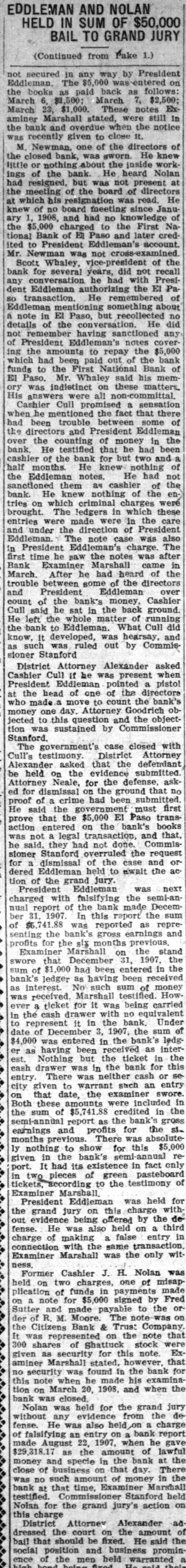 # EDDLEMAN AND NOLAN # HELD IN SUM OF $50,000 # BAIL TO GRAND JURY (Continued from fake 1.) not secured in any way by President Eddleman, The $5,000 was entered on the books as paid back as follows: March 6, $1,500; March 7, $2,500; March 23, $1,000. These notes Ex- aminer Marshall stated, were still in the bank and overdue when the notice was recently given to close it. M. Newman, one of the directors of the closed bank, was sworn. He knew little or nothing about the inside work- ings of the bank. He heard Nolan had resigned, but was not present at the meeting of the board of directors at which his resignation was read. He knew of no board meeting since Janu- ary 1, 1908, and had no knowledge of the $5,000 charged to the First Na- tional Bank of El Paso and later cred- ited to President Eddleman's account. Mr. Newman was not cross-examined. Scott Whaley, vice-president of the bank for several years, did not recall any conversation he had with Presi- dent Eddleman authorizing the El Pa- so transaction. He remembered of Eddleman mentioning something about a note in El Paso, but recollected no details of the conversation. He did not remember having sanctioned any of President Eddleman's notes cover- ing the amounts to repay the $5,000 which had been paid out of the bank funds to the First National Bank of El Paso. Mr. Whaley said his mem- ory was indistinct on these matters. His answers were all non-committal. Cashier Cull promised a sensation when he mentioned the fact that there had been trouble between some of the directors and President Eddleman over the counting of money in the bank. He testified that he had been cashier of the bank for but two and a half months. He knew nothing of the Eddleman notes. He had not sanctioned them as cashier of the bank. He knew nothing of the en- tries on which criminal charges were brought. The ledgers in which these entries were made were in the care and under the direction of President Eddleman. The note case was also in President Eddleman's charge. The first time he saw the notes was after Bank Examiner Marshall came in March. After he had heard of the trouble between some of the directors and President Eddleman over count of the bank's money, Cashier Cull said he sat in the back ground. He left the whole matter of running the bank to Eddleman. What Cull did know, it developed, was hearsay, and as such was ruled out by Commis- sioner Stanford District Attorney Alexander asked Cashier Cull if he was present when President Eddleman pointed a pistol at the head of one of the directors who made a move to count the bank's money one day. Attorney Goodrich ob- jected to this question and the object- tion was sustained by Commissioner Stanford. The government's case closed with Cull's testimony. District Attorney Alexander asked that the defendant be held on the evidence submitted. Attorney Neale, for the defense, ask- ed for dismissal on the ground that no proof of a crime had been submitted. He said the government must first prove that the $5,000 El Paso trans- action entered on the bank's books was not a legal transaction, and that, he said, they had not done. Commis- sioner Stanford overruled the request for a dismissal of the case and or- dered Eddleman held to await the ac- tion of the grand jury. President Eddleman was next charged with falsifying the semi-an- nual report of the bank made Decem- ber 31, 1907. In this report the sum of $5,741.88 was reported as repre- senting the bank's gross earnings and profits for the six months previous. Examiner Marshall on the stand swore that December 31, 1907, the sum of $1,000 had been entered in the bank's ledger as having been received as interest. No such sum of money was received, Marshall testified. How- ever a ticket for it was being carried in the cash drawer with no equivalent to represent it in the bank. Under date of December 3, 1907, the sum of $4,000 was entered in the bank's ledg- er as having been received as inter- est. Nothing but the ticket in the cash drawer was in the bank for this entry. There was neither cash or se- curity given to warrant such an entry on that date, the examiner swore. Both these amounts were included in the sum of $5,741.88 credited in the semi-annual report as the bank's gross earnings and profits for the six months previous. There was absolute- ly nothing to show for this $5,000 given in the bank's semi-annual re- port. It had its existence in fact only in two pieces of green pasteboard tickets, according to the testimony of Examiner Marshall, President Eddleman was held for the grand jury on this charge with- out evidence being offered by the de- fense. He was also held on a third charge of making a false entry in connection with the same transaction. Examiner Marshall was the only wit- ness. Former Cashier J. H. Nolan was held on two charges, one of misap- plication of funds in payments made on a note for $5,000 signed by Fred Sutter and made payable to the or- der of R. M. Moore. The note was on the Citizens Bank & Trust Company. It was represented on the note that 300 shares of Shattuck stock were given as security for this note. Ex- aminer Marshall stated, however, that no security was found in the bank for this note when he made his examina- tion on March 20, 1908, and when the bank was closed. Nolan was held for the grand jury without any evidence from the de- fense. He was also held on a charge of falsifying an entry on a bank report made August 22, 1907, when he gave $29,318.17 as the amount of lawful money and specie in the bank at the close of business on that day. There was no such amount of money in the bank at that time, Examiner Marshall testified. Commissioner Stanford held Nolan for the grand jury's action on this charge District Attorney Alexander ad- dressed the court on the amount of bail that should be fixed. He said the social position and business promin- ence of the men held warranted a high bond. He said thola