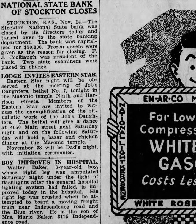 NATIONAL STATE BANK OF STOCKTON CLOSES STOCKTON. KAS., Nov. 14.-The Stockton National State bank was closed by its directors today and turned over to the state banking department. The bank was capitalized for $50,000. Frozen assets were given as the reason for closing. F. Coolbaugh was president the bank. Two state examiners were placed in charge LODGE INVITES EASTERN STAR. Eastern Star night will be observed at the meeting of Job's Daughters, bethel No. 7. tonight in the Masonic temple, Ninth and Harrison streets. Members of the Eastern Star are invited to witness the exemplification of the ritualistic work of the Job's Daughters. The bethel will give a dance at 4050 Main street next Saturday night and on the following Saturday will hold bazar and chicken dinner at the Masonic temple November 28 will be Dad's night, with initiation ceremonies. BOY IMPROVES IN HOSPITAL Walter Baker, 6-year-old boy, whose right leg was amputated Saturday night under the light of flashlights after the general hospital lighting system had failed, is improved today in the hospital. His right leg was crushed when he attempted to board moving freight WHITE ROSE train near Independence road and the Blue river. He is the son of Mrs. Marie Baker. 8115 Independence road.