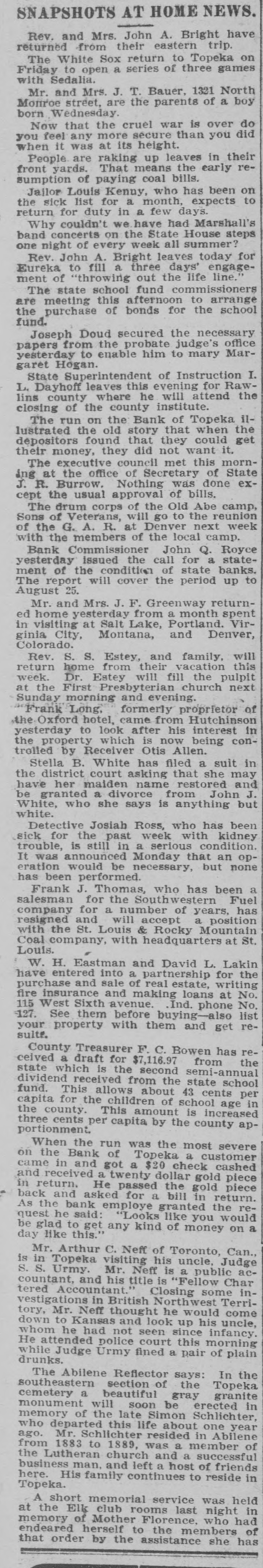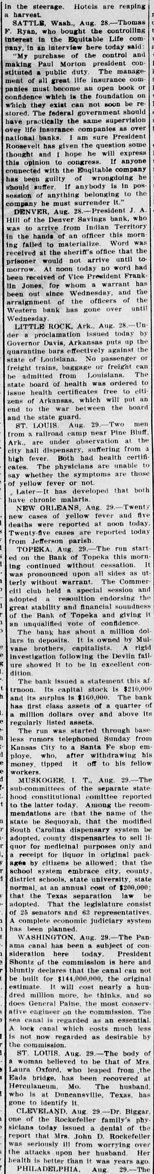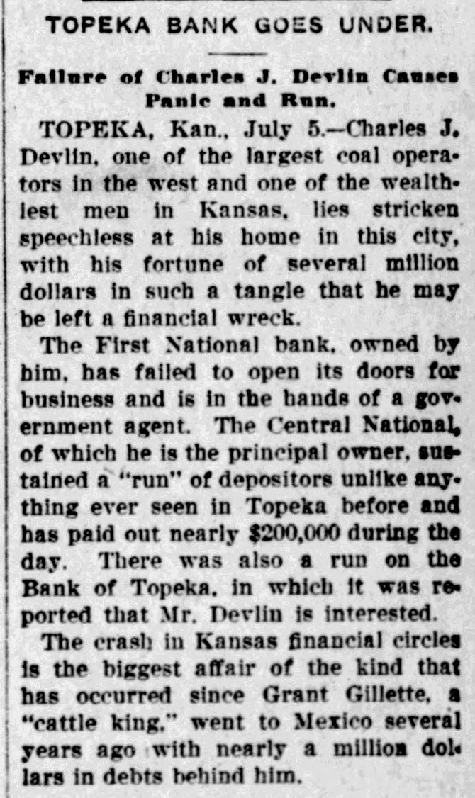 TOPEKA BANK SHUTS DOOR LARGE LOANS TO ONE MAN. C. J. Devlin, One of the Wealthiest Men in Kansas City, Involved. Topeka, Kan., July 3.-The First National Bank of Topeka, of which C. J. Devlin is the principal stockholder, failed to open its doors to-day. The government officials are making an examination of the bank's affairs, but gave out no statement to-day. On the door of the bank appeared this notice: This bank is closed by orders. The Controller of the Currency has been communicated with and will send an examiner, who will make a statement. W. H. ROSSINGTON, Vice-President. No definite statement was obtainable to-day regarding the condition of the First National Bank, controlled by Charles J. Devlin, a wealthy coal mine owner, which closed its doors this morning. Colonel W. H. Rossington, vice-president of the bank. locked the institution's books in the vault to await the arrival of J. T. Bradley, national bank examiner, whom the Controller had appointed receiver of the failed bank. Colonel Rossington would only say: "The bank's trouble has not been caused by dishonesty on the part of any one, but by lending too largely to one borrower. There has been no stealing." The borrower, it is said, is Mr. Devlin, and the bank is said to hold the capitalist's paper to the amount of $1,000,000. Mr. Devlin, whose sudden illness brought about the tangle in the big coal minrailroad valued, at close to $7,000,000. is still under care ing and properties, it the is estimated, from of a physician, and no statement can be obtained him. All that came from his home to-day was that coal had over in life insurance the bank stricken nearly $700,000 operator turned and about to the the same amount in Topeka real estate. Business associates of Mr. Devlin expressed their opinion that if properly handled this would allow the bank to pay out. Aside from the temporary flurry that the failure of the First National Bank caused on the other banks of the city, the most interesting phase of the situation was the statement of the State Treasurer, T. T. Kelly, that the bank held $547,000 of the State's funds. Mr. Devlin was one of the Mr. Kelly's bondsmen. Following the announcement of the failure, a lively but not disastrous run was started on the Central National Bank. Other runs of a lesser degree were started on the State Savings Bank, the Bank of Topeka and on the Merchants' National Bank. At none of these banks, however, was the demand for withdrawals great. Following the closing of the First National Bank there was a slight run on the Central National Bank, in which Mr. Devlin also is a large stockholder, and there were small runs later in the day on the Merchants' National Bank, the Bank of Topeka and the State Savings Bank. At each of these institutions all depositors who requested their money were paid and confidence was expressed in the ability to meet any demands of the depositors. Cash to the amount of $300,000 was deposited in the Central National to offset the run. J. W. Gleed stated that $700,000 worth of real estate -$300,000 unencumbered Topeka property, the other $400,000 in coal lands in Southeastern Kansas-had been turned in by Mr. Devlin, together with $700,000 life insurance. Mr. Gleed asserted that the Central National was in a perfectly solvent condition. He further stated that nothing more would be done with the Missouri organization of the Devlin property until after the report of the Controller here. In the First National Bank the State of Kansas has over $500,000 in deposits, the city of Topeka. $39,000, and the county of Shawnee about $30,000. Mr. Devlin, who has been under the care of a physician, was unable to leave his home to-day. He was up and around, however. He was in the best of spirits, and in reply to questions, said that he expected to be able to go to the bank in another week.