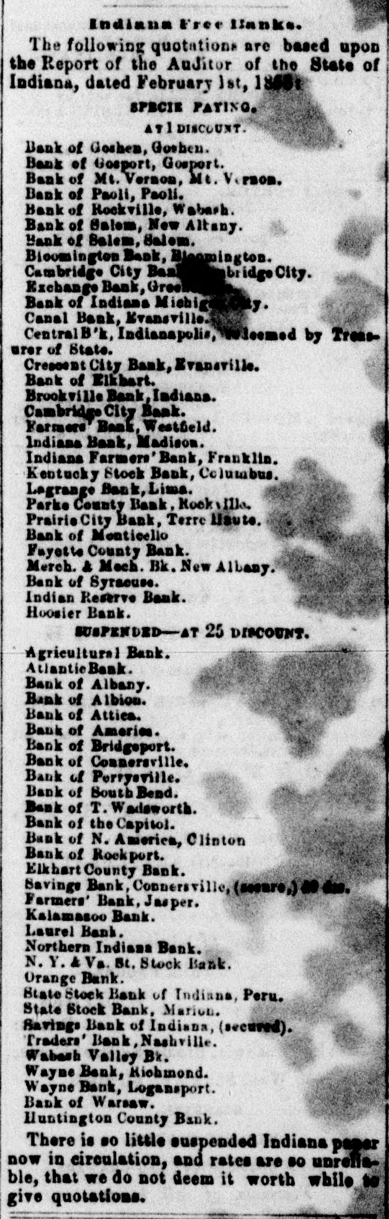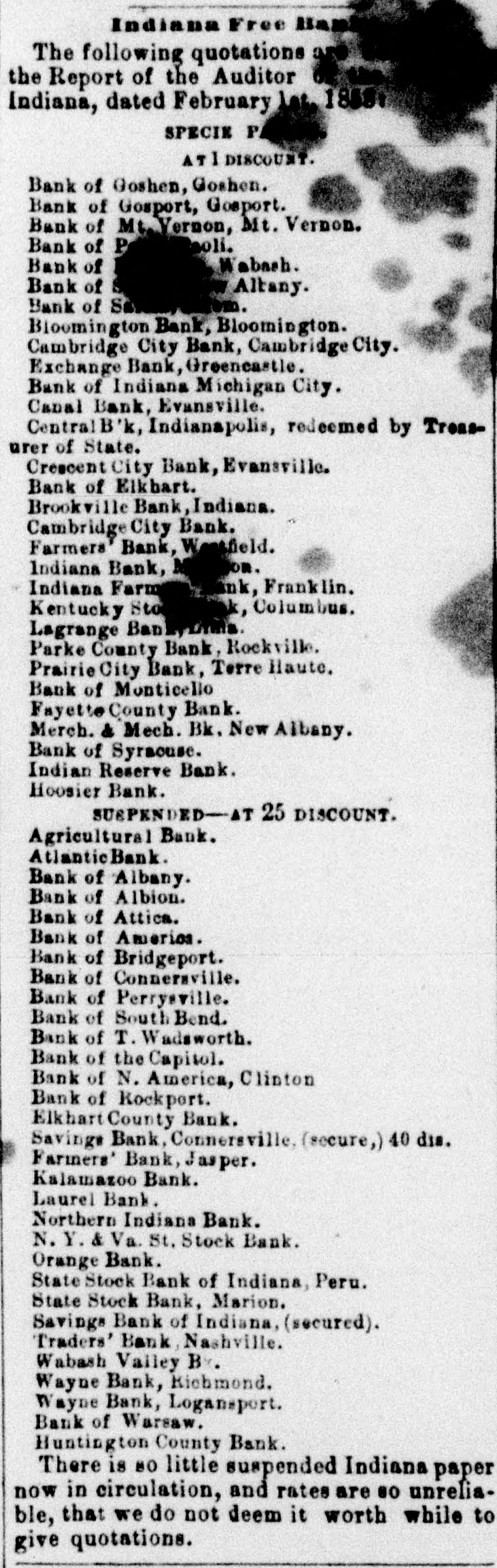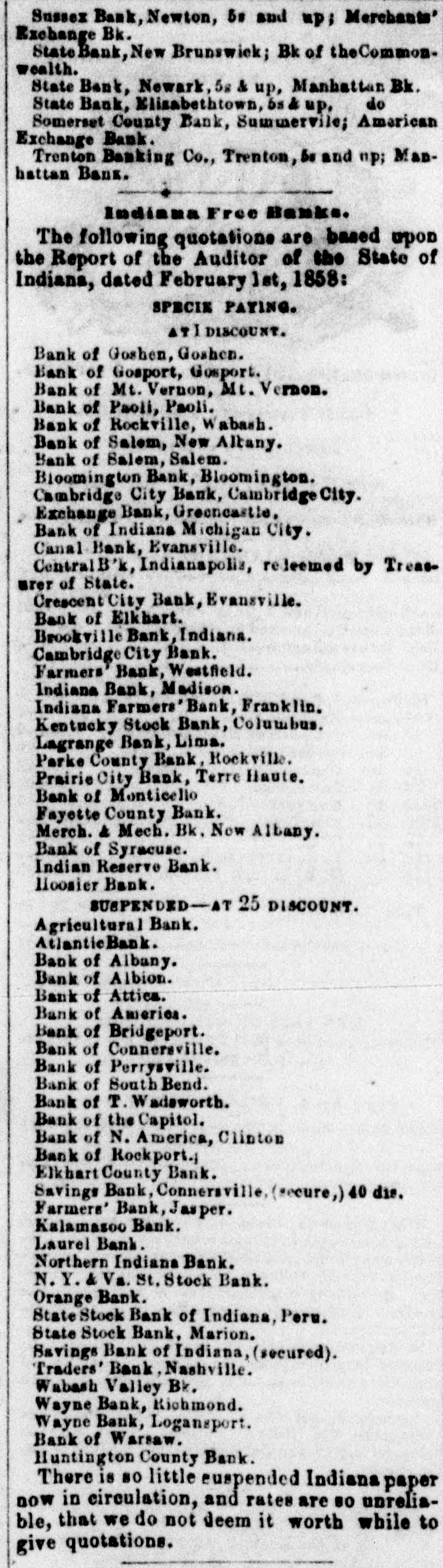 Indiana Free Bal The following quotations a the Report of the Auditor Indiana, dated February let. 1858: SPECIE P ATI DISCOUNT. Bank of Goshen, Goshen. Bank of Gosport, Gosport. Bank of Mt, Vernon, Mt. Vernon. Bank of P oli. Wabash. Bank of a Bank of Altany. Bank of So Bioomington Bank, Bloomington. Cambridge City Bank, Cambridge City. Exchange Bank, Greeneastle. Bank of Indiana Michigan City. Canal Bank, Evansville. Central B'k, Indianapolis, redeemed by Treasurer of State. Crescent City Bank, Evansville. Bank of Elkbart. Brookville Bank, Indiana. Cambridge City Bank. Farmers Bank, W field. on. M Indiana Bank, Indiana Farm ink, Franklin. k, Columbus. Kentucky Sto Lagrange BankyLisha. Parke County Bank, Rockville. Prairie City Bank, Terre Haute. Bank of Monticello Fayette County Bank. Merch. & Mech. Bk. New Albany. Bank of Syracuse. Indian Reserve Bank. Hoosier Bank. SUSPENDED-AT 25 DISCOUNT. Agricultural Bank. Atlantic Bank. Bank of Albany. Bank of Albion. Bank of Attica. Bank of America. Bank of Bridgeport. Bank of Connersville. Bank of Perrysville. Bank of South Bend. Bank of T. Wadsworth. Bank of the Capitol. Bank of N. America, Clinton Bank of Rockport. Elkhart County Bank. Savings Bank, Connersville, (secure,) 40 dis. Farmers' Bank, Jasper. Kalamazoo Bank. Laurel Bank. Northern Indiana Bank. N. Y. & Va. St. Stock Bank. Orange Bank. State Stock Bank of Indiana, Peru. State Stock Bank, Marion. Savings Bank of Indiana, (secured). Traders' Bank, Nashville. Wabash Valley By. Wayne Bank, Richmond. Wayne Bank, Logansport. Bank of Warsaw. Huntington County Bank. There is 80 little suspended Indiana paper now in circulation, and rates are 80 unreliable, that we do not deem it worth while to give quotations.