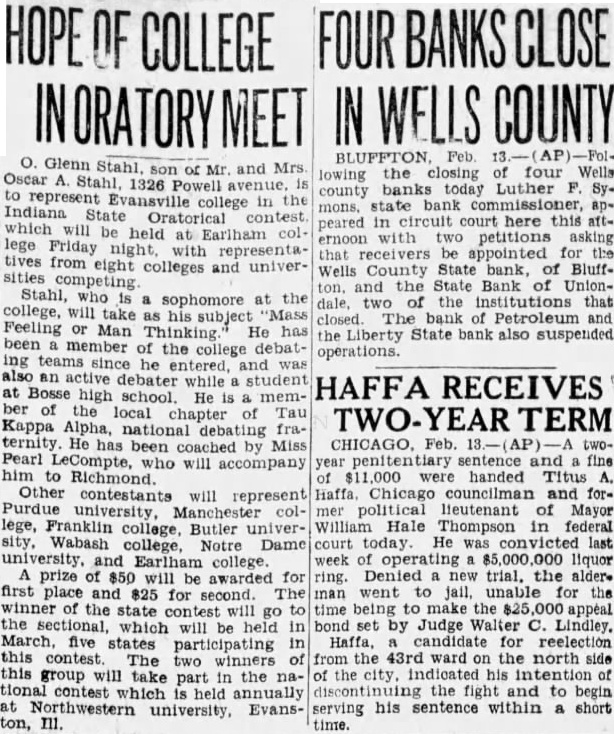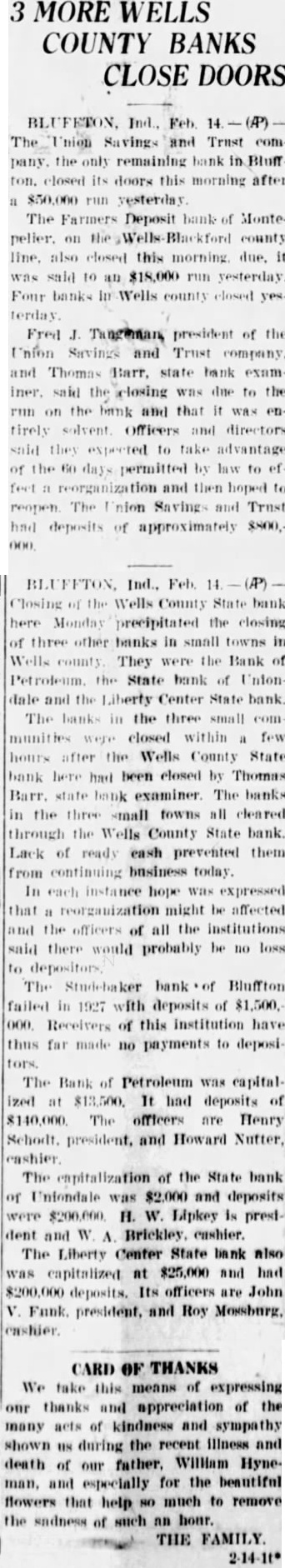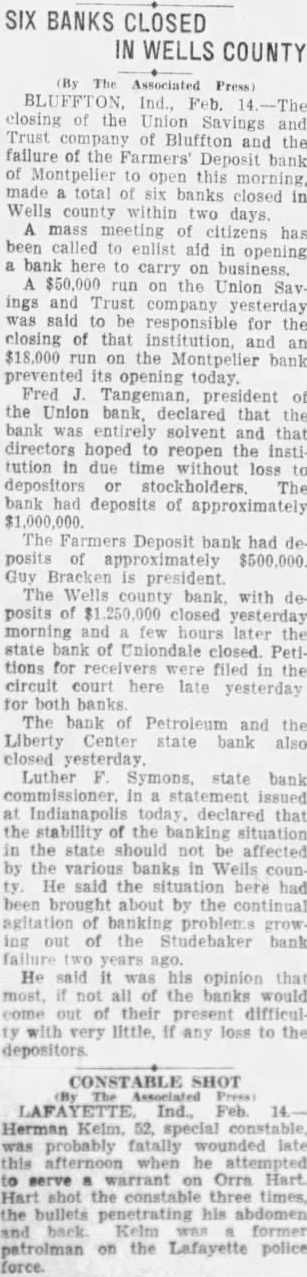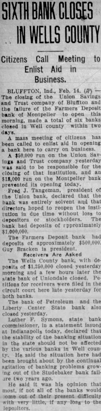 SEVEN BANK FAILURES SHAKE FINANCIAL CIRCLES OF Federal Examiner Finds Alleged Shortage of $100,000 in Accounts of Cashier of Hope Institution and Arrests Are Expected-Six Suspensions Due to Panicky Depositors. INDIANAPOLIS, Ind., Feb. epidemic of bank crashes which reached a total of seven in the last twentyfour hours. today rocked Indiana banking circles. Six of the bank suspensions were due to mad panic that started at Bluffton in Wells The county. seventh bank closing was blamed on GENERAL BANKING IN an alleged $100,000 defalcation by cashier. INDIANA IS HOPEFUL With the mad Ind., Feb. 14. frenzy commenting today spreading from Wells county upon the closing seven Ind iana banks since sible adjoining counties, every pos. yesterday effort was made state morning total deposits banking officials and by bankLuther Symmons, ers the affected districts state banking commissioner, public fear. said: mass meetings were general banking situabeing resorted towns tion hopeful enlist citizens to help their should be by local banks the conditions in Wells county. "RUNS" NOT JUSTIFIED. seems to have lost his sense Thomas Barr, state banking Indiana Artists' who has hurried Bluffton declared upon arriving there looking over Works Will Be the situation. "The runs most banks have been without justification. Exhibited Here to comment on the possible further spread Hoosier Salon Closes in Chipanic paralyzed business Wells cago and Pictures Will Be Virtually the entire force of the Brought to Purdue Univer- state department into the field today to sity February 22. help endangered banks stem the frenzy that has been spreading Feb. Bluffton all directions. portrait August Goth, Indianapall lay parpainted by his daughter, in Wells The banks county Marie Goth, won the Harry 30 Nye special prize $200 the and 60 day nótices on withdrawpicture possessing the most als. The panic at Bluffton had its inception the shattered banking institutions resulting from losses incurred the there on March the State bank, one of the oldest Indiana. Ralph president this bank, shot and killed himself after the bank was closed ONE BANK REOPENS. run Wells County bank Bluffton bank which deposits $1, 250,000 yesterday ing. followed by runs the Union Savings Trust company Bluffton and on other banks in the county Before day over four other banks had down, the Poneto closing half day When the Union Savings Trust of Bluffton failed open doors today, the panic spread from county to Blackford and forced the Deposit bank at Montpelier Meanwhile board of directhe National bank Hope in Bartholomew county, the bank closed after Utt, federal bank examiner found an alleged shortage the of Cashier W. LIST OF CLOSED BANKS. The seven banks closed diana since yesterday morning and their deposits follow: State bank of Bluffton, Union Savings and Trust company Bluffton, $400,000. Uniondale State bank of Uniondale Center State bank of Liberty Bank of Petroleum at Petroleum, Farmers Deposit bank of Montpelier, National Bank of Hope, $400,000.