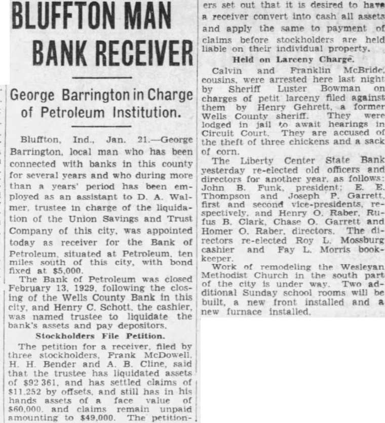 BLUFFTON MAN BANK RECEIVER George Barrington in Charge of Petroleum Institution. Bluffton, Ind., Jan. 21.-George Barrington. local man who has been connected with banks in this county for several years and who during more than years' period has been employed an assistant to D. Walmer. trustee in charge of the liquidation of the Union Savings and Trust Company of this city, was appointed today as receiver for the Bank of Petroleum. situated at Petroleum. ten this city, with bond fixed $5,000 Petroleum was closed February 13. 1929 following the closing of the Wells County Bank in this city and Henry C. Schott the cashier, was named trustee to liquidate the bank's assets and pay depositors. Stockholders File Petition. The petition for filed by H. Bender and Cline, said that the trustee has liquidated assets and has settled claims of by and still has in his hands assets face value and claims remain unpaid amounting to $49,000 The petition- ers set out that it is desired to have receiver convert into cash all assets and apply the same to payment of claims before stockholders are held liable their individual property. Held on Larceny Charge. Calvin and Franklin McBride. arrested last night by Sheriff Luster Bowman charges of petit larceny filed against them by Henry Gehrett. former Wells County sheriff. They were lodged in jail to await hearings Circuit Court They are accused the theft of three chickens and sack of corn. The Liberty Center State Bank yesterday re-elected old officers and directors for another year. as follows: John Funk, Thompson and Joseph Garrett, first and and Henry Raber fus B. Chase Garrett and Homer O. Raber. directors. The rectors Roy Mossburg cashier and Fay L. Morris bookkeeper. Work of remodeling the Wesleyan Methodist Church in the south of the city under way Two additional Sunday school rooms will be built, new front installed and a new furnace installed
