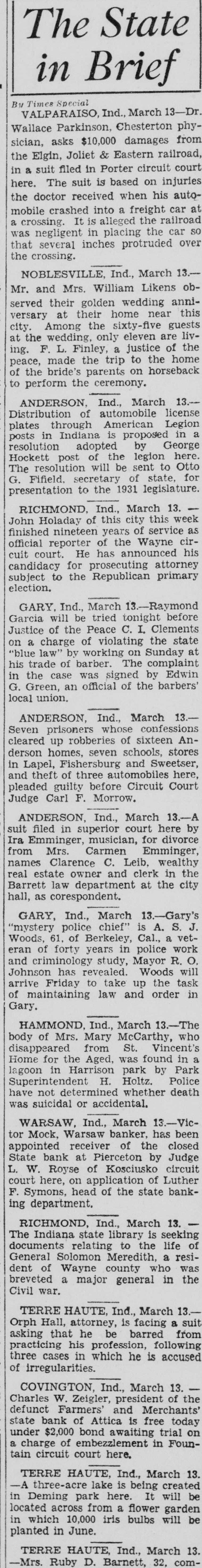 The State in Brief By Times Special VALPARAISO, Ind., March 13-Dr. Wallace Parkinson, Chesterton physician, asks $10,000 damages from the Elgin, Joliet & Eastern railroad, in a suit filed in Porter circuit court here. The suit is based on injuries the doctor received when his automobile crashed into a freight car at a crossing. It is alleged the railroad was negligent in placing the car so that several inches protruded over the crossing. NOBLESVILLE, Ind., March 13.Mr. and Mrs. William Likens observed their golden wedding anniversary at their home near this city. Among the sixty-five guests at the wedding, only eleven are living. F. L. Finley, a justice of the peace, made the trip to the home of the bride's parents on horseback to perform the ceremony. ANDERSON, Ind., March 13.-Distribution of automobile license plates through American Legion posts in Indiana is proposed in a resolution adopted by George Hockett post of the legion here. The resolution will be sent to Otto G. Fifield. secretary of state, for presentation to the 1931 legislature. RICHMOND, Ind., March 13. John Holaday of this city this week finished nineteen years of service as official reporter of the Wayne circuit court. He has announced his candidacy for prosecuting attorney subject to the Republican primary election. GARY. Ind., March 13.-Raymond Garcia will be tried tonight before Justice of the Peace C. I. Clements on a charge of violating the state "blue law" by working on Sunday at his trade of barber. The complaint in the case was signed by Edwin G. Green, an official of the barbers' local union. ANDERSON, Ind., March 13.Seven prisoners whose confessions cleared up robberies of sixteen Anderson homes, seven schools, stores in Lapel, Fishersburg and Sweetser, and theft of three automobiles here, pleaded guilty before Circuit Court Judge Carl F. Morrow. ANDERSON, Ind., March 13.-A suit filed in superior court here by Ira Emminger, musician, for divorce from Mrs. Carmen Emminger, names Clarence C. Leib, wealthy real estate owner and clerk in the Barrett law department at the city hall, as corespondent. GARY, Ind., March 13.-Gary's "mystery police chief" is A. S. J. Woods, 61, of Berkeley, Cal., a veteran of forty years in police work and criminology study, Mayor R. O. Johnson has revealed. Woods will arrive Friday to take up the task of maintaining law and order in Gary. HAMMOND, Ind., March 13.-The body of Mrs. Mary McCarthy, who disappeared from St. Vincent's Home for the Aged, was found in a lagoon in Harrison park by Park Superintendent H. Holtz. Police have not determined whether death was suicidal or accidental. WARSAW, Ind., March 13.-Victor Mock, Warsaw banker, has been appointed receiver of the closed State bank at Pierceton by Judge L. W. Royse of Kosciusko circuit court here, on application of Luther F. Symons, head of the state banking department. RICHMOND, Ind., March 13. The Indiana state library is seeking documents relating to the life of General Solomon Meredith, a resident of Wayne county who was breveted a major general in the Civil war. TERRE HAUTE, Ind., March 13.Orph Hall, attorney, is facing a suit asking that he be barred from practicing his profession, following three cases in which he is accused of irregularities. COVINGTON, Ind., March 13. Charles W. Zeigler, president of the defunct Farmers' and Merchants' state bank of Attica is free today under $2,000 bond awaiting trial on a charge of embezzlement in Fountain circuit court here. TERRE HAUTE, Ind., March 13. -A three-acre lake is being created in Deming park here. It will be located across from a flower garden in which 10,000 iris bulbs will be planted in June. TERRE HAUTE, Ind., March 13. -Mrs. Ruby D. Barnett, 32, com-