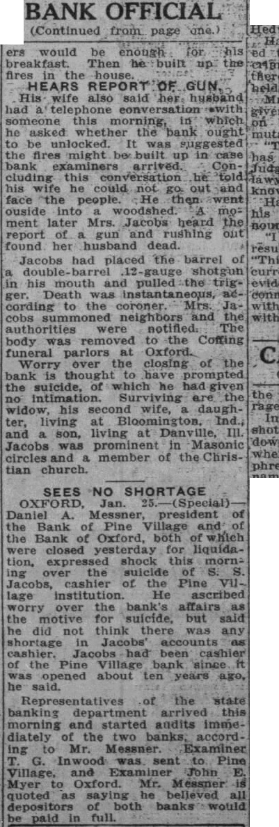 BANK OFFICIAL (Continued from page ers would be enough for ed Then he built the HEARS REPORT OF GUN. His wife said husband telephone someone this morning, in which he asked ought to be unlocked. It was the might built up in examiners cluding this his he could out and known face people. He then ouside ment Mrs Jacobs heard report of a gun rushing found her result Jacobs had placed the barrel double gauge in his mouth pulled the trig. ger. Death was instantaneous, cording the coroner Mrs. cobs neighbors and the with authorities were notified. The body removed to the Coffing funeral parlors at Oxford. Worry over the closing of the bank thought have prompted the suicide, of which he had given no intimation. Surviving the widow his wife, daugh ter, living at Bloomington, Ind. a son, living at Danville, III. dows Jacobs prominent in circles and member of the Christian SEES NO SHORTAGE OXFORD, Jan. -(Special) Daniel A. Messner, president of the Bank of Pine Village and Bank of Oxford, both of which closed yesterday for liquidaexpressed shock this the suicide of S. Jacobs, cashier of the Pine Vil. lage institution. He ascribed worry over the bank's affairs the motive for suicide, but said he did not think there was any shortage cashier. Jacobs had been cashier the Pine Village bank since ft was opened about ten years he said. of the state banking department arrived this morning and started audits imme diately the two banks, accord. ing Mr. Examiner G. was sent to Pine Village, Examiner John Myer to Oxford. Mr. Messner quoted as saying believed all depositors of both banks would be paid full.