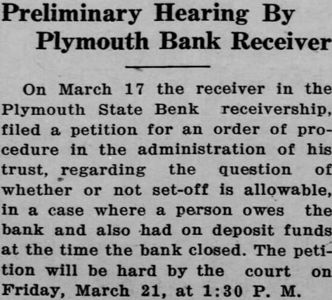 Preliminary Hearing By Plymouth Bank Receiver On March 17 the receiver in the Plymouth State Benk receivership, filed petition for an order of procedure in the administration of his trust, regarding the question of whether or not set-off is allowable, in case where person owes the bank and also had on deposit funds at the time the bank closed. The petition will be hard by the court on Friday, March 21, at 1:30