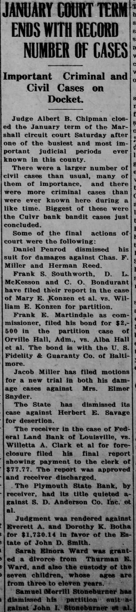 Important Criminal and Civil Cases on Docket. Judge Albert Chipman the January term of the Marshall circuit court Saturday after of the busiest and most portant judicial periods known in this county. There were larger number of civil cases than usual, many of them of importance, and there more criminal cases than were ever known here during like time. Biggest of these were the Culvr bank bandit cases just concluded. Some of the final actions of court were the following: Daniel Penrod dismissed his suit for damages against Chas. Miller and Herman Reed. Frank McKesson and Bondurant have filed their report in the case Mary Konzen et William Konzen for partition. Frank Martindale as missioner, filed his bond for 500 in the partition case of Orville Hall, Adm., VS. Alba Hall The bond with the Fidelity & Guaranty Co. of Baltimore. Jacob Miller has filed motions for new trial in both his damcases against Mrs. Elmer Snyder. The State has dismissed its against Herbert Savage for desertion. The receiver in the of Land Bank of Louisville, Willetta Clark for foreclosure filed his final report showing payment to the clerk $77.77. The report approved receiver discharged. The Plymouth State Bank, receiver, had its title quieted gainst Anderson Co. Judgment was rendered against Everett and Dorothy Botha $1,730.14 in favor of the of John Smith. Sarah Elnora Ward divorce from Thurman Ward, and also the custody children, whose from Samuel Merrill Stoneburner partition gainst John