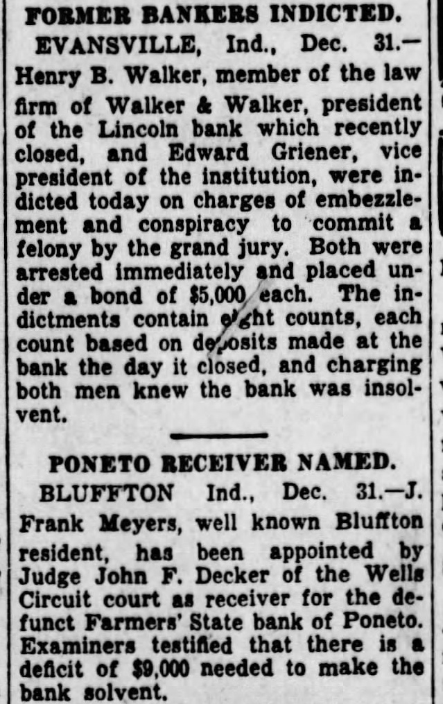 FORMER BANKERS INDICTED. EVANSVILLE, Ind., Dec. Henry B. Walker, member of the law firm of Walker Walker, president of the Lincoln bank which recently closed, and Edward Griener, vice president the institution, were dicted today charges of embezzlement and conspiracy commit felony by the grand jury. Both were arrested and placed der bond of $5,000 The eight count on deposits made at bank the day closed, charging both knew the bank was PONETO RECEIVER NAMED. BLUFFTON Ind., Dec. 31.-J. Frank Meyers, well known Bluffton resident, has been appointed Judge John Decker the Circuit court as receiver for the funct Farmers' State bank of Poneto. Examiners testified there deficit of needed to make the bank solvent.