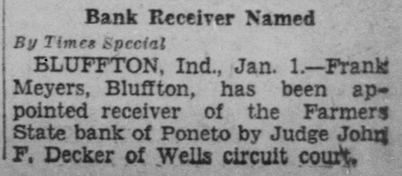 J. Frank Meyers ... was appointed receiver for the Farmers' State Bank of Poneto by Judge J. F. Decker at the conclusion of a hearing in the Wells Circuit Court ... The bank closed its doors on December 15 and C. R. Humston, an examiner from the state banking department, testified that an appraisal of the assets showed depreciation of $38,822 from the book valuation of the assets.