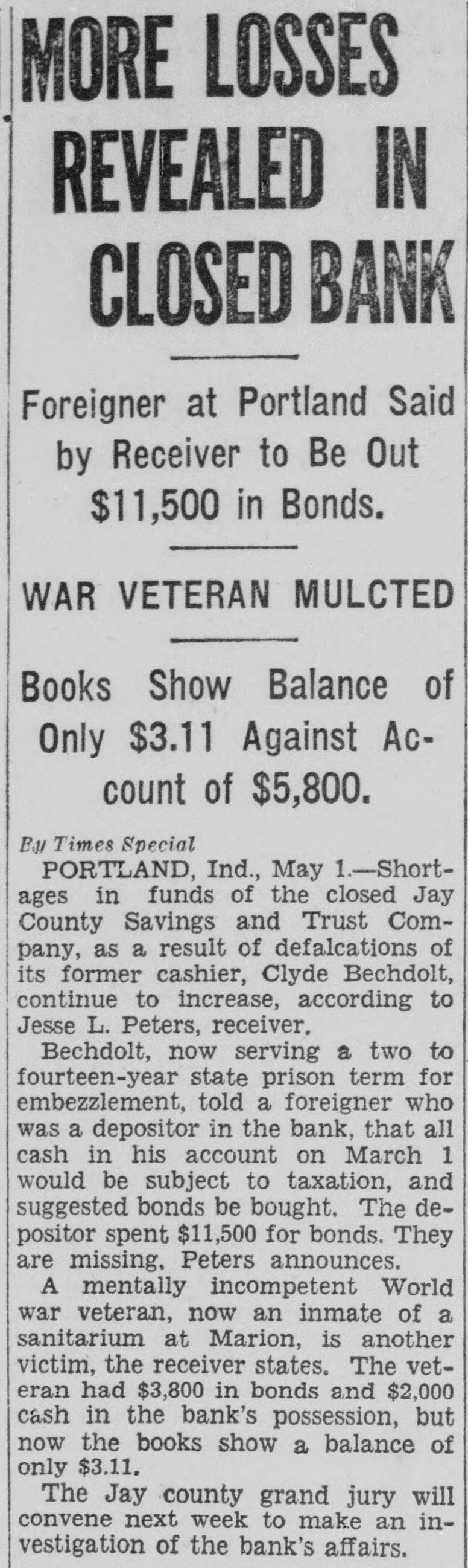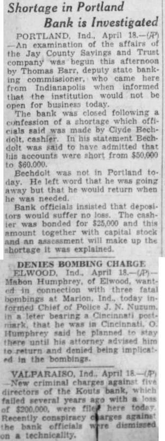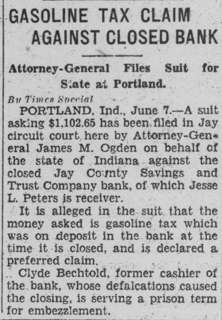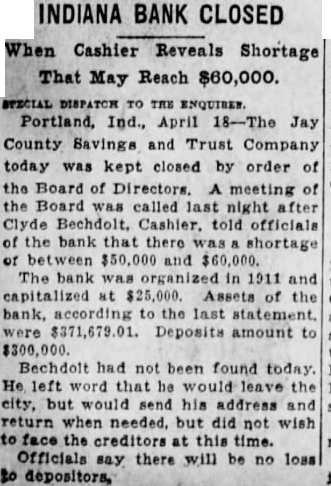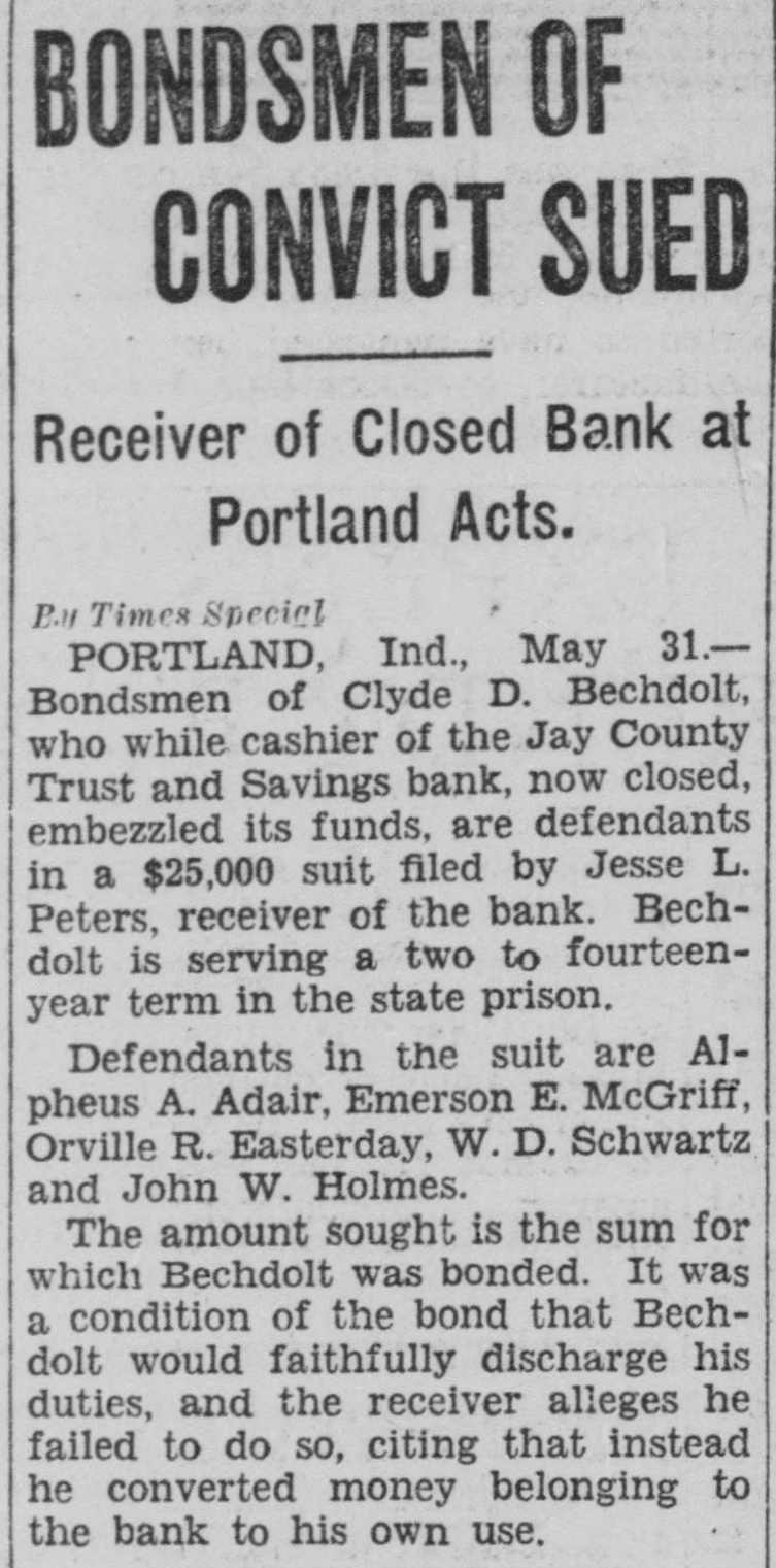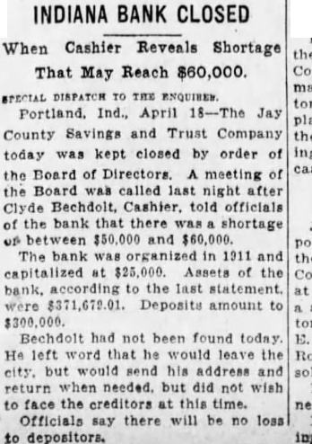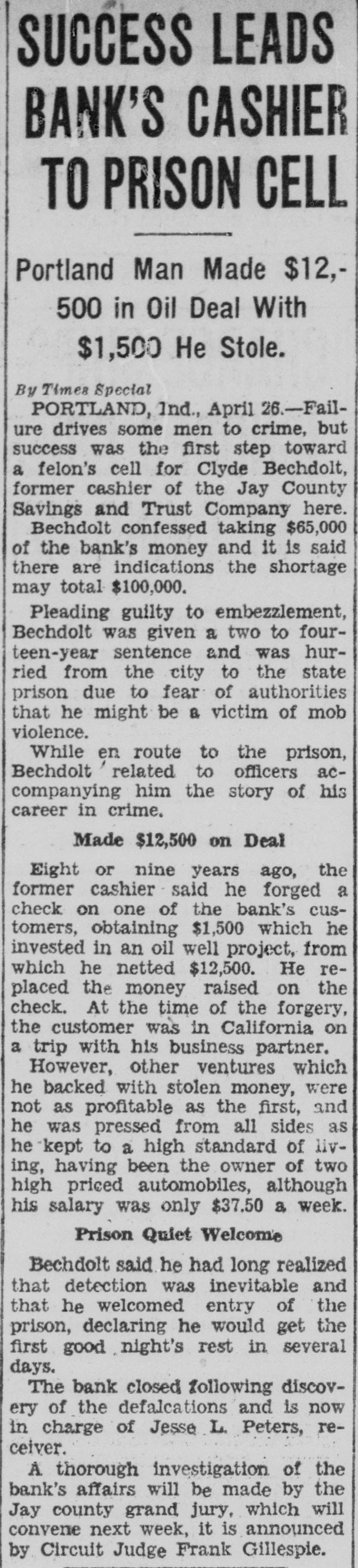SUCCESS LEADS BANK'S CASHIER TO PRISON CELL Portland Man Made $12,500 in Oil Deal With $1,500 He Stole. By Times Special PORTLAND, Ind., April 26.-Failure drives some men to crime, but success was the first step toward a felon's cell for Clyde Bechdolt, former cashier of the Jay County Savings and Trust Company here. Bechdolt confessed taking $65,000 of the bank's money and it is said there are indications the shortage may total $100,000. Pleading guilty to embezzlement, Bechdolt was given a two to fourteen-year sentence and was hurried from the city to the state prison due to fear of authorities that he might be a victim of mob violence. While en route to the prison, Bechdolt related to officers accompanying him the story of his career in crime. Made $12,500 on Deal Eight or nine years ago, the former cashier said he forged a check on one of the bank's customers, obtaining $1,500 which he invested in an oil well project, from which he netted $12,500. He replaced the money raised on the check. At the time of the forgery, the customer was in California on a trip with his business partner. However, other ventures which he backed with stolen money, were not as profitable as the first, and he was pressed from all sides as he kept to a high standard of living, having been the owner of two high priced automobiles, although his salary was only $37.50 a week. Prison Quiet Welcome Bechdolt said he had long realized that detection was inevitable and that he welcomed entry of the prison, declaring he would get the first good night's rest in several days. The bank closed following discovery of the defalcations and is now in charge of Jesse L. Peters, receiver. A thorough investigation of the bank's affairs will be made by the Jay county grand jury, which will convene next week, it is announced by Circuit Judge Frank Gillespie.