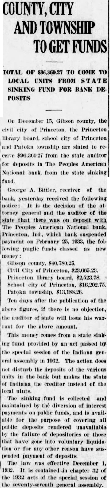 COUNTY, CITY AND TOWNSHIP GET FUNDS TOTAL OF $96,360.27 TO COME TO LOCAL UNITS FROM STATE SINKING FUND FOR BANK DEPOSITS On December 15. Gibson county, the civil city of Princeton, the Princeton library board. school city of Princeton and Patoka township are slated to receive $96,360.27 from the state auditor for deposits in The Peoples American National bank. from the state sinking fund. George A. Bittler, receiver of the bank. yesterday received the following notice: It is the decision of the attorney general and the auditor of the state that there_was on deposit with The Peoples American National bank. Princeton. Ind., which bank suspended payment on February 25, 1933, the following puglic funds classed as new money Civil City of Princeton, $23,665.23. Princeton library board. $2,523.78. School city of Princeton, $16,202.75. Patoka township, $13,188.26. Ten days after the publication of the above figures, if there is no objection, the auditor of state will issue his warrant for the above amount. This money comes from a state sinking fund provided by an act passed by the special session of the Indiana general assembly in 1932. The action does not disturb the deposits of the various units in the bank but makes the state of Indiana the creditor instead of the local uints. The sinking fund is collected and maintained by the diversion of interest payments on public funds, and is available for the purpose of covering all public deposits rendered unavailable by the failure of depositories or those that have gone into voluntary liquidation or for any other reason have suspended payment of deposits. The law was effective December 1, 1932. It is contained in chapter 32 of the 1932 acts of the special session of the seventy-seventh general assembly.