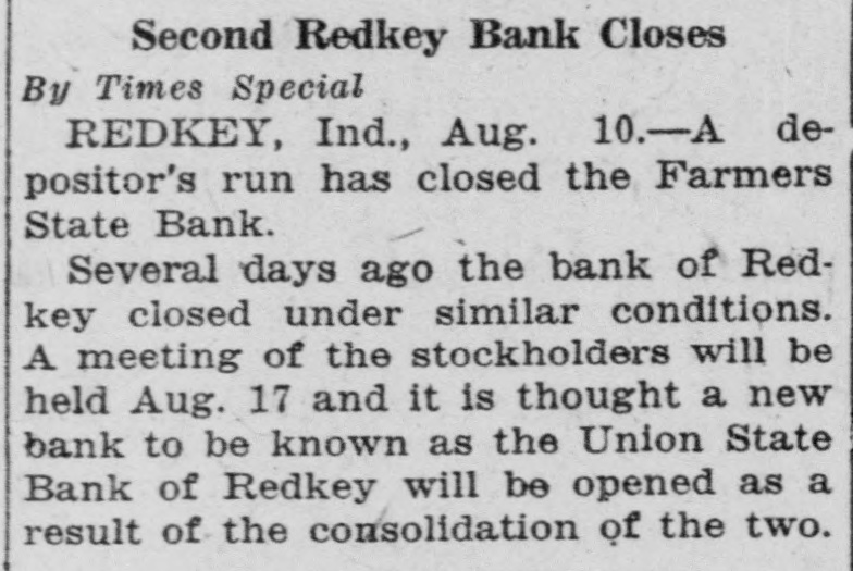 Second Redkey Bank Closes By Times Special REDKEY, Ind., Aug. 10.-A depositor's run has closed the Farmers State Bank. Several days ago the bank of Redkey closed under similar conditions. A meeting of the stockholders will be held Aug. 17 and it is thought a new bank to be known as the Union State Bank of Redkey will be opened as a result of the consolidation of the two.