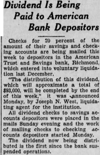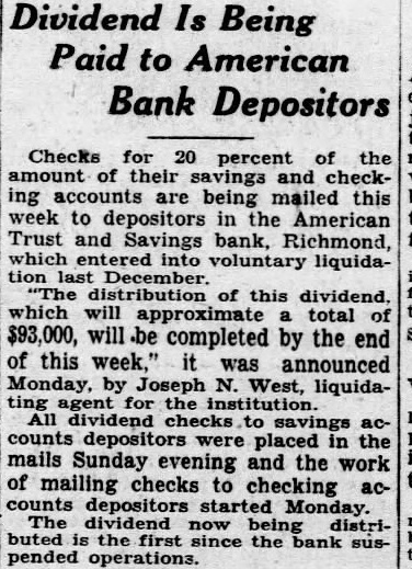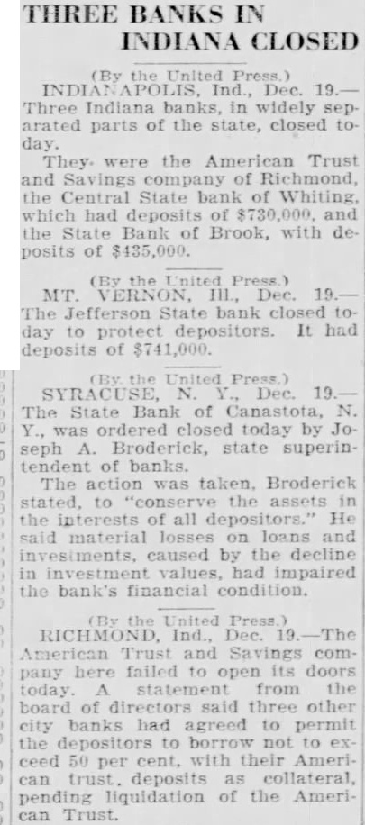 BLOODSTAINED CLOTHES FOUND IN WOODS NEAR KILBOURNE. ILL. Note Addressed to "Shelton" Recommended "Bearer. Jimmy Durkin." as a Cook. the HA VANA, Press. Dec. 19.-Bloodstained clothes. a letter and a traveling bag of exc ellent quality, found yesterday in the woodlands four miles southeast of Kilbourne, III., caused Mason County authorities to search the surrounding Illinois River bottom land in the belief that a murder had been committed. The letter was addressed to "Shelton," dated at St. Louis on Aug. 9, signed "Dud" and recommended "the bearer. Jimmy Durkin as a cook. The bloodstained clothing bore the laundry mark "J. D." The apparel apparently was working clothes. Other clothing found nearby included a cook's apron and cap, Automobile wheel tracks. where a car evidently had been turned around, also were found. The discovery was made by Sherman Lane, a trapper. St. Louisan Head of Seedmen. By the Associated Press. COLUMBIA. Mo., Dec. 19.-Ed F. Mangelsdorf of St. Louis has been elected president of the Missouri Seedmen's Association. Other officers chosen: Fred G. Ricketts, Springfield, vice president, and J. M. White, Kansas City, secretarytreasurer. Sunday Movie Vote Held Void. By the Associated Evanston voted for Sunday movies by a majority of 56 votes, but cannot have them, at least for some time. Judge Philip L. Sullivan has ruled. The Court upheld the Evanston Sunday business ordinance and reasoned that the referendum was not effective without action by the City Council. bank was solvent and gave frozen assets and a gradual withrawal of funds as the reason for closing. The bank, capitalized at $100,000, has liabilities of $1,094,225, officials said. Bank in North Carolina With $450,000 Deposits Closes. By the Associated LENOIR, N. C., Dec. 18.-The First National Bank of Lenoir did not open for business today. W. J. Lenoir is its president. The bank is capitalized at $50,000 and its officers said it had deposits of $450,000. Three Banks in Indiana, One With $610,000 Deposits, Close, By the Press. INDIANAPOLIS. Ind., Dec. 19.Three Indiana banks failed to open today, the State Banking Department was notified. They are: The American Trust and Savings Bank of Richmond. capitalized at 100,000; the Central State Bank of Whiting, capitalized at $100,000, and the State Bank of Brook, capitàlized at $55,000. At Richmond it was said the bank was closed to protect depositors and stockholders. The bank had experienced several days of heavy withdrawals. It had deposits of $500,000. The Whiting bank had deposits of $610,000, and deposits in the State Bank of Brook totaled $585,000.