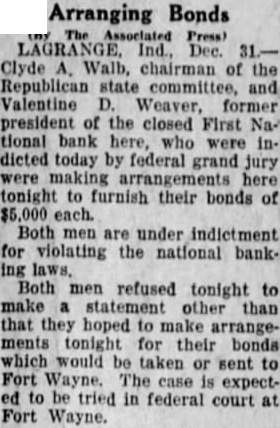 Arranging Bonds Clyde Walb, chairman of the Republican state committee, and Valentine Weaver, former president the closed First National bank here, were indicted today by federal grand jury were making tonight to furnish their bonds of each. Both men under indictment for violating the national banklaws. Both men refused tonight to statement other that they hoped arrangements tonight for their bonds which be taken sent to Fort expecttried in federal court at Fort Wayne.
