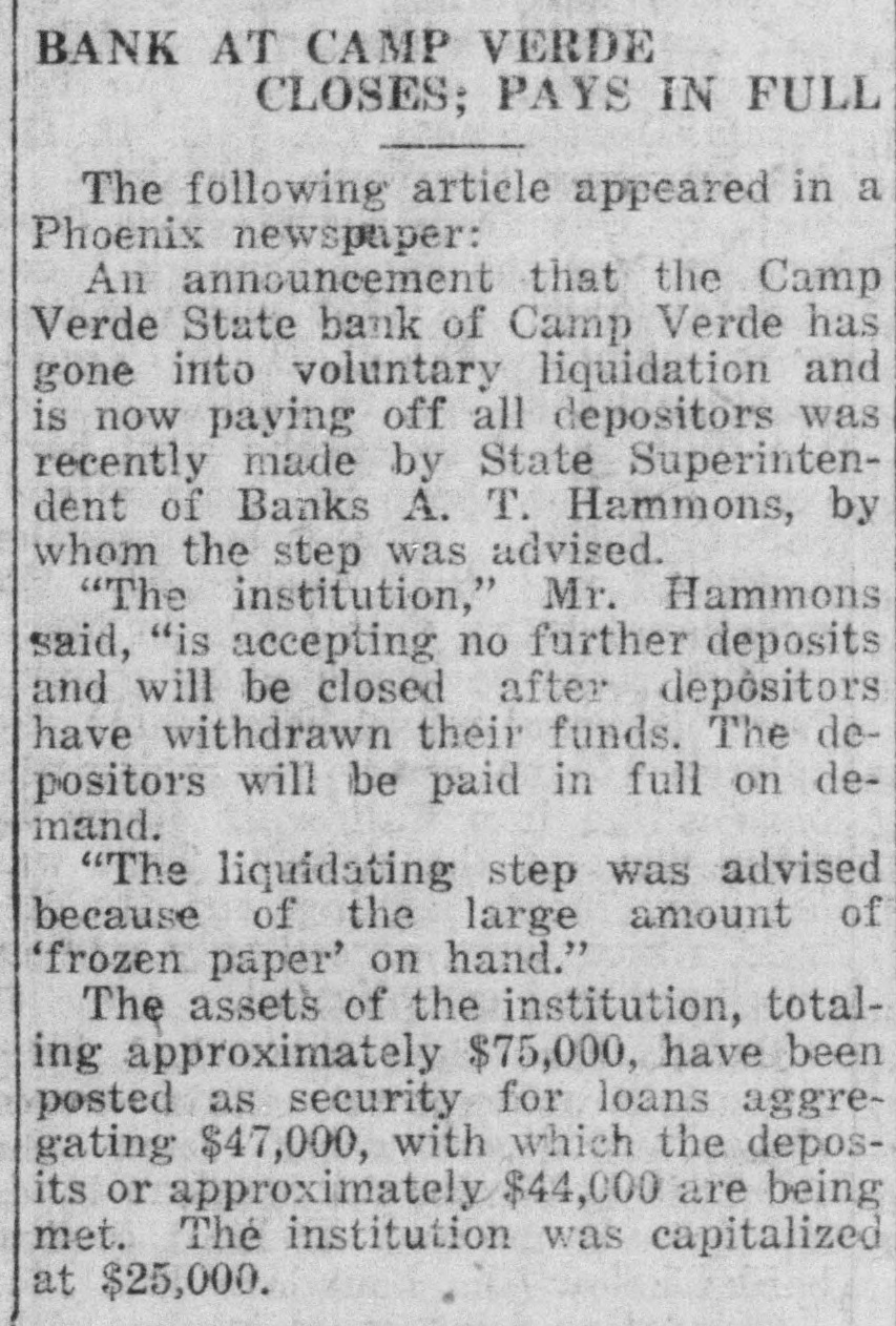 BANK AT CAMP VERDE CLOSES; PAYS IN FULL The following article appeared in a Phoenix newspaper: An announcement that the Camp Verde State bank of Camp Verde has gone into voluntary liquidation and is now paying off all depositors was recently made by State Superintendent of Banks A. T. Hammons, by whom the step was advised. "The institution," Mr. Hammons said, "is accepting no further deposits and will be closed after depositors have withdrawn their funds. The depositors will be paid in full on demand. "The liquidating step was advised because of the large amount of 'frozen paper' on hand." The assets of the institution, totaling approximately $75,000, have been posted as security for loans aggregating $47,000, with which the deposits or approximately $44,000 are being met. Thé institution was capitalized at $25,000.
