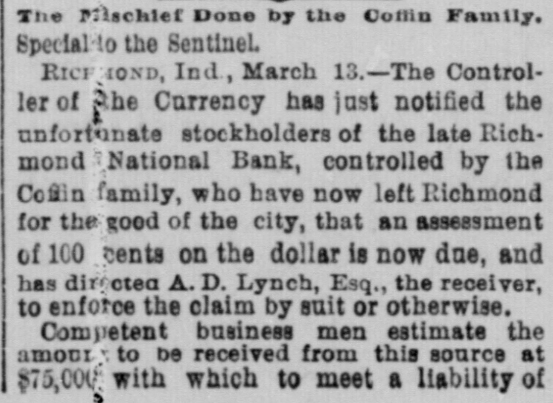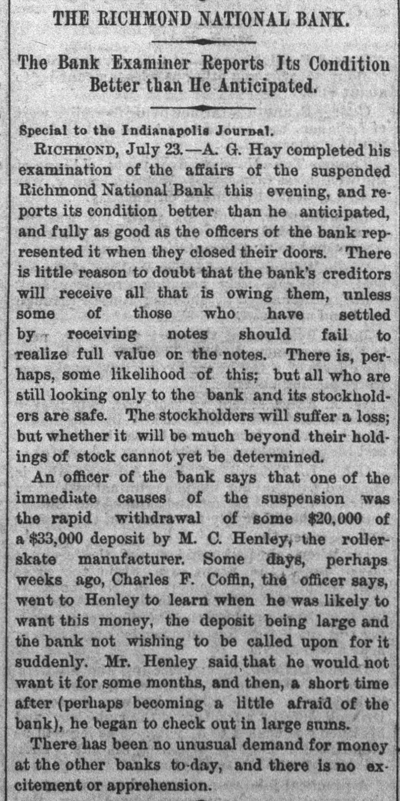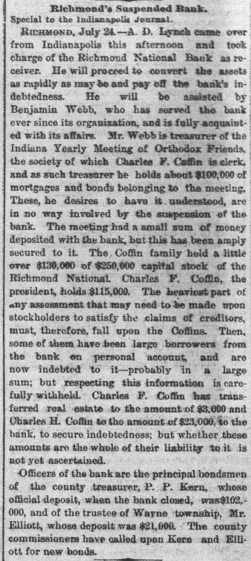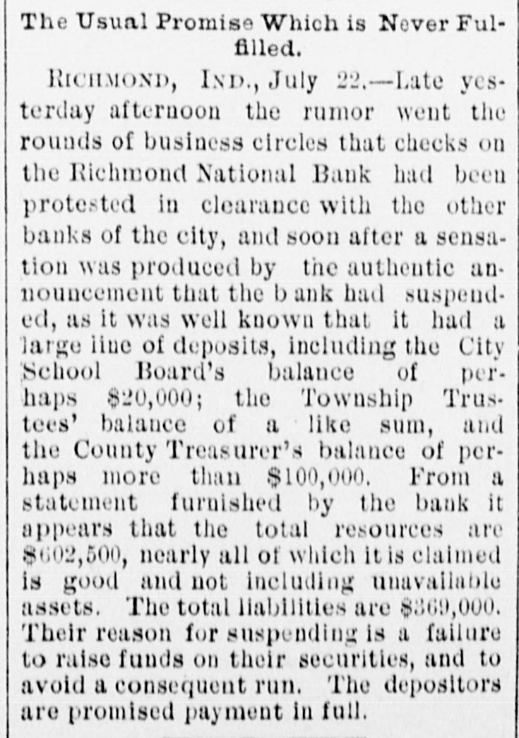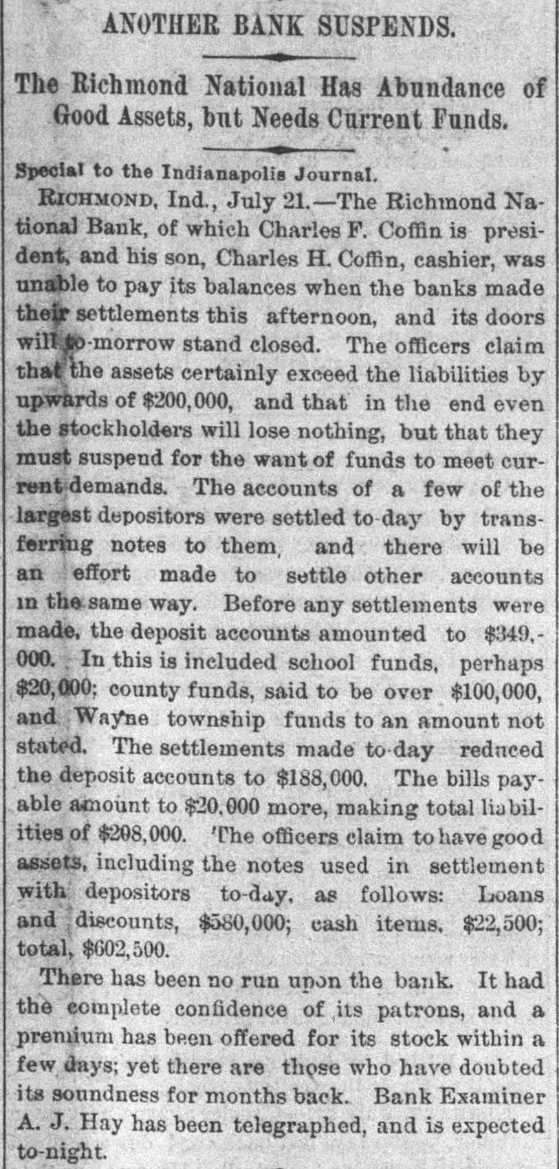 ANOTHER BANK SUSPENDS. The Richmond National Has Abundance of Good Assets, but Needs Current Funds. Special to the Indianapolis Journal. RICHMOND, Ind., July 21.-The - Richmond National Bank, of which Charles F. Coffin is president, and his son, Charles H. Coffin, cashier, was unable to pay its balances when the banks made their settlements this afternoon, and its doors will to-morrow stand closed. The officers claim that the assets certainly exceed the liabilities by upwards of $200,000, and that in the end even the stockholders will lose nothing, but that they must suspend for the want of funds to meet current demands. The accounts of a few of the largest depositors were settled to-day by transferring notes to them, and there will be an effort made to settle other accounts in the same way. Before any settlements were made, the deposit accounts amounted to $349,000. In this is included school funds, perhaps $20,000; county funds, said to be over $100,000, and Wayne township funds to an amount not stated. The settlements made to-day reduced the deposit accounts to $188,000. The bills payable amount to $20,000 more, making total lia bilities of $208,000. The officers claim to have good assets, including the notes used in settlement with depositors to-day, as follows: Loans and discounts, $580,000; cash items. $22,500; total, $602,500. There has been no run unon the bank. It had the complete confidence of its patrons, and a premium has been offered for its stock within a few days; yet there are those who have doubted its soundness for months back. Bank Examiner A. J. Hay has been telegraphed, and is expected to-night.