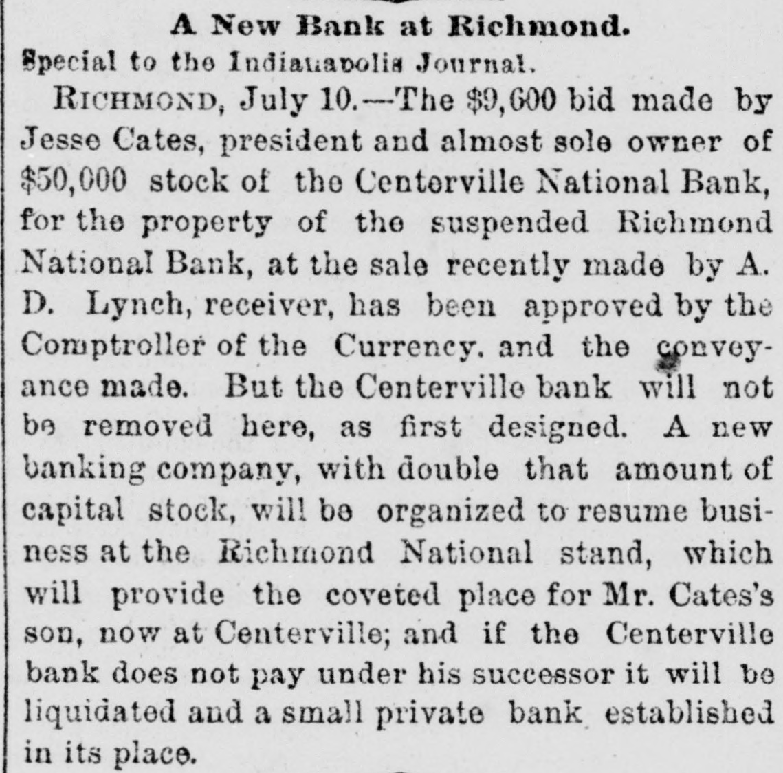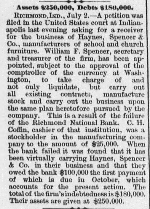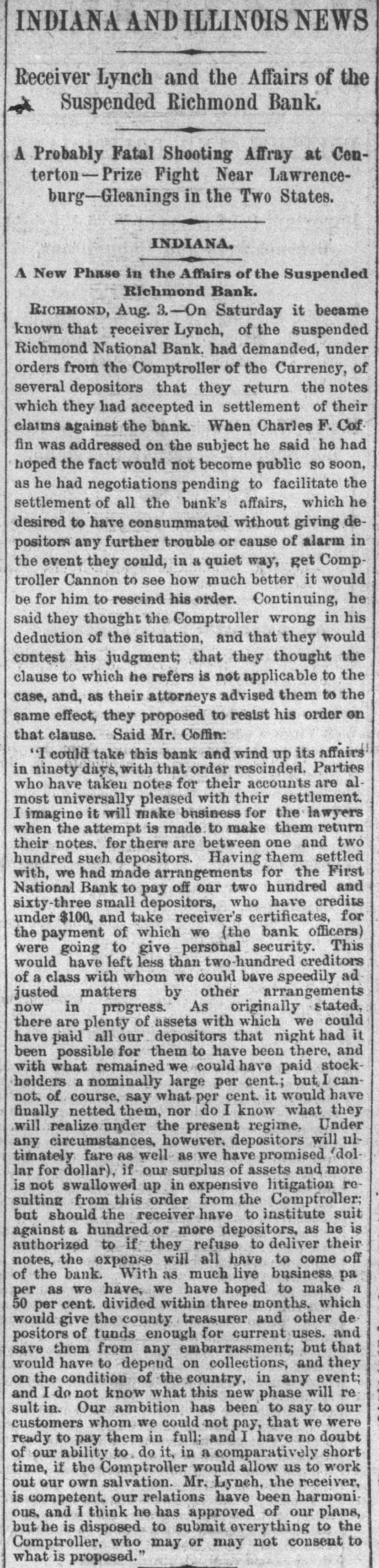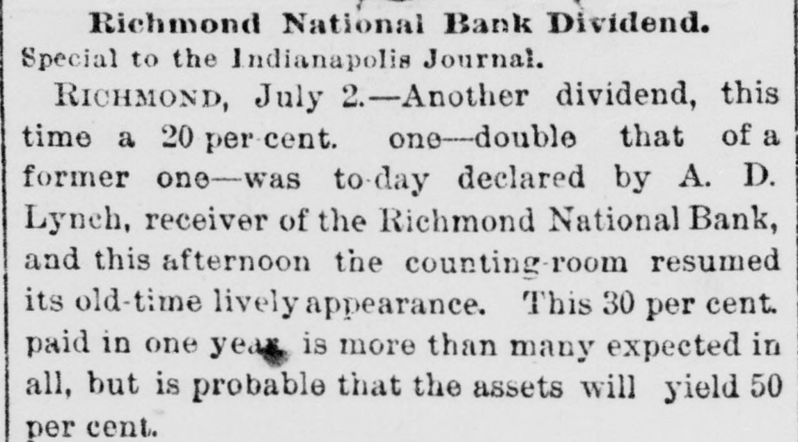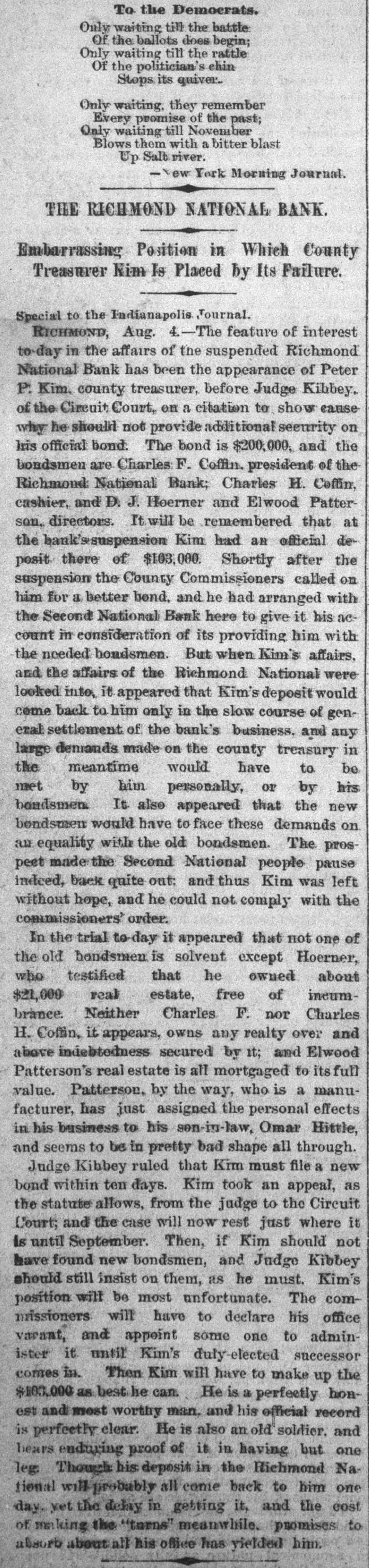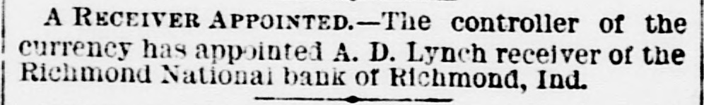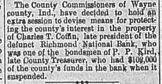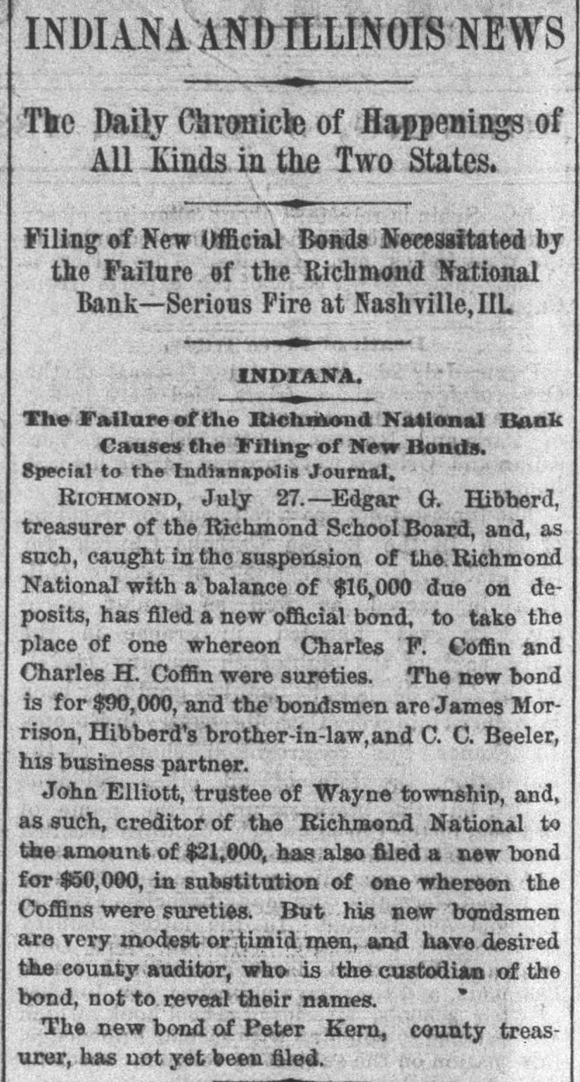 ANOTHER BANK SUSPENDS. The Richmond National Has Abundance of Good Assets, but Needs Current Funds. Special to the Indianapolis Journal. RICHMOND, Ind., July 21.-The - Richmond National Bank, of which Charles F. Coffin is president, and his son, Charles H. Coffin, cashier, was unable to pay its balances when the banks made their settlements this afternoon, and its doors will to-morrow stand closed. The officers claim that the assets certainly exceed the liabilities by upwards of $200,000, and that in the end even the stockholders will lose nothing, but that they must suspend for the want of funds to meet current demands. The accounts of a few of the largest depositors were settled to-day by transferring notes to them, and there will be an effort made to settle other accounts in the same way. Before any settlements were made, the deposit accounts amounted to $349,000. In this is included school funds, perhaps $20,000; county funds, said to be over $100,000, and Wayne township funds to an amount not stated. The settlements made to-day reduced the deposit accounts to $188,000. The bills payable amount to $20,000 more, making total lia bilities of $208,000. The officers claim to have good assets, including the notes used in settlement with depositors to-day, as follows: Loans and discounts, $580,000; cash items. $22,500; total, $602,500. There has been no run unon the bank. It had the complete confidence of its patrons, and a premium has been offered for its stock within a few days; yet there are those who have doubted its soundness for months back. Bank Examiner A. J. Hay has been telegraphed, and is expected to-night.