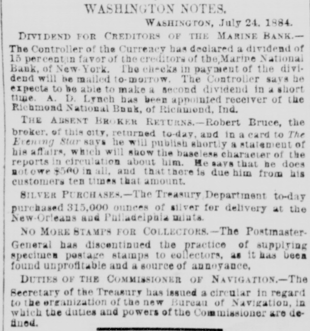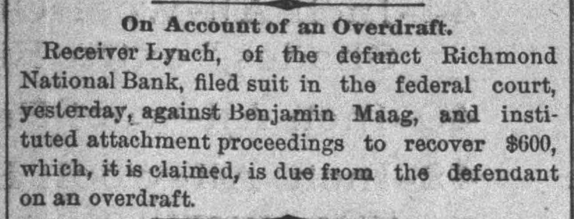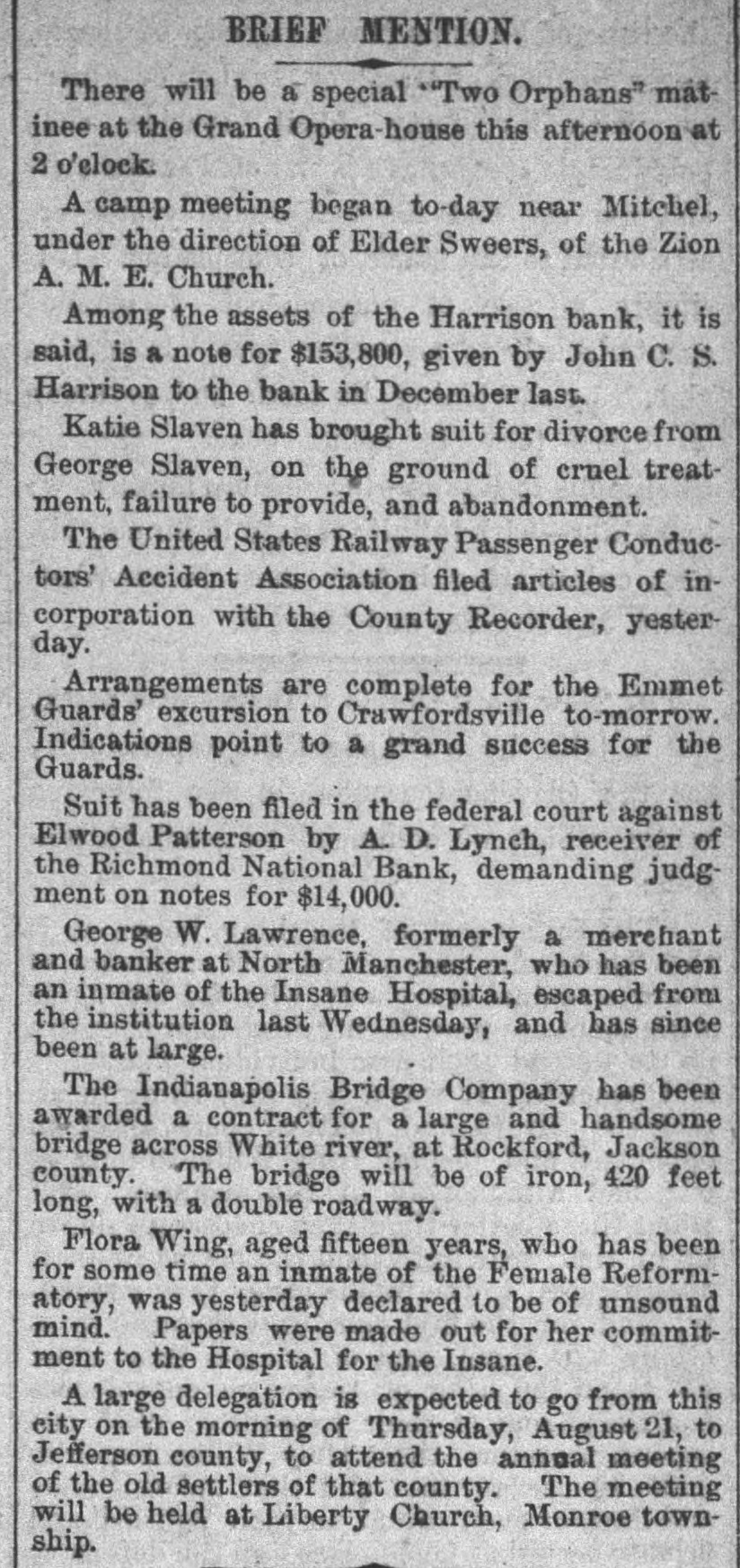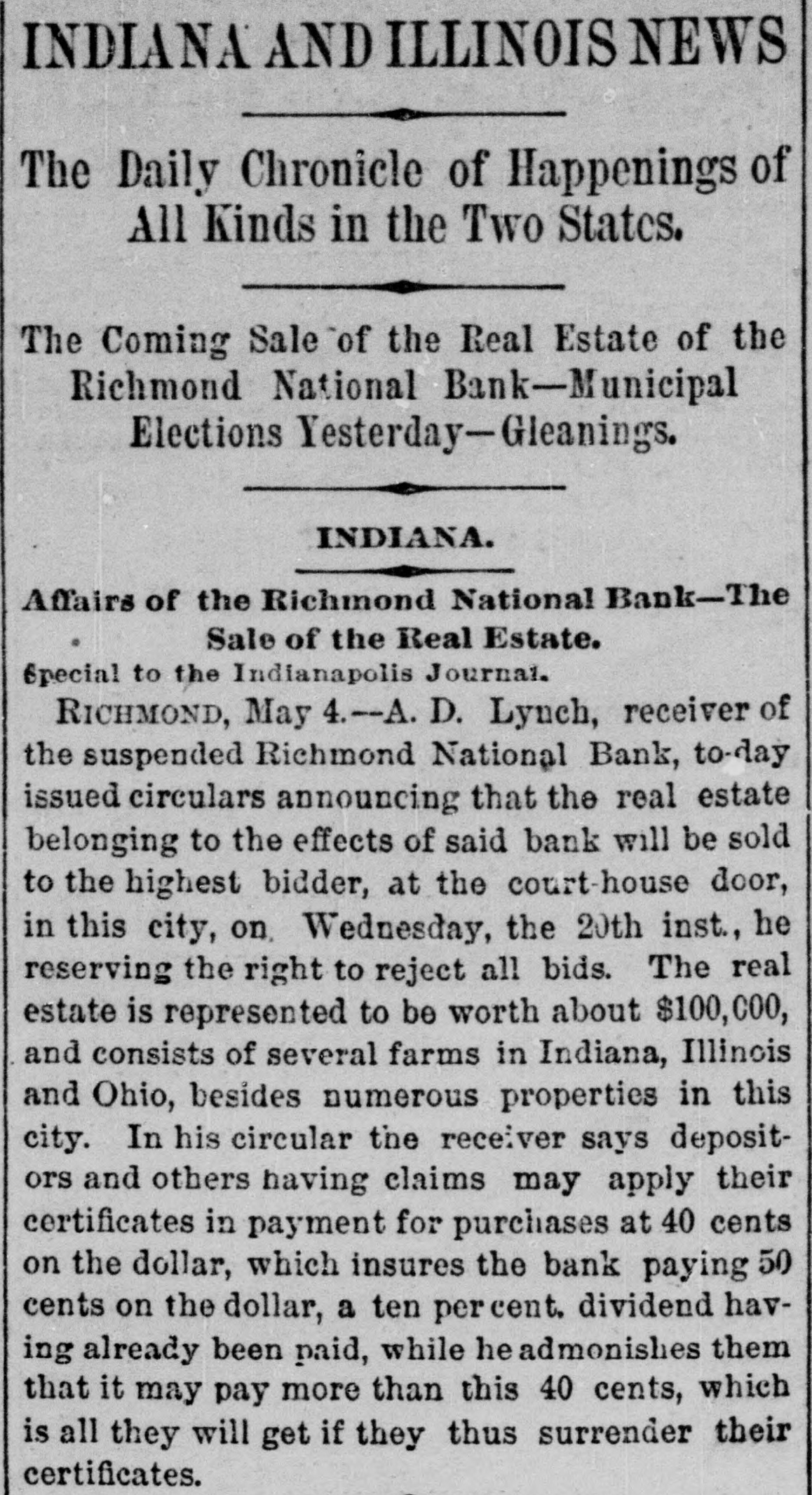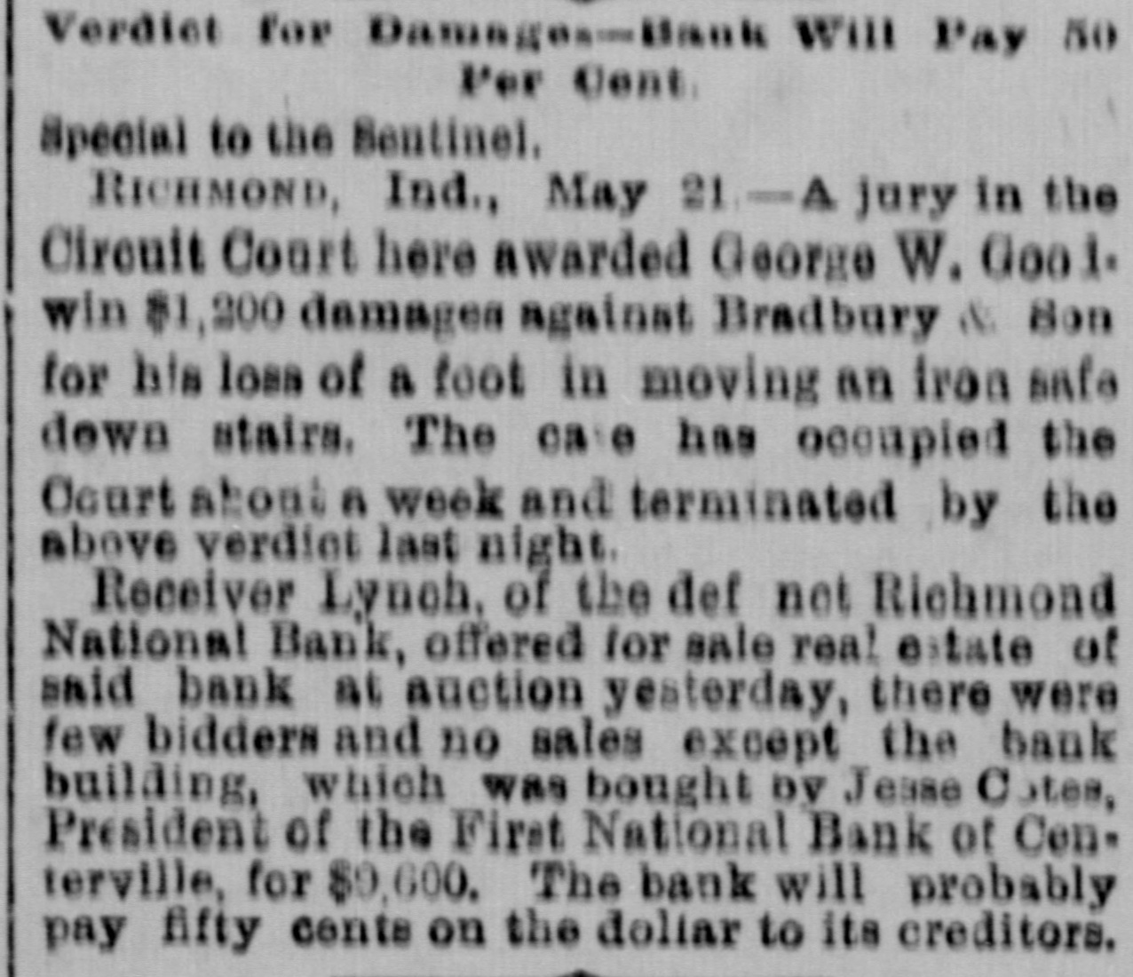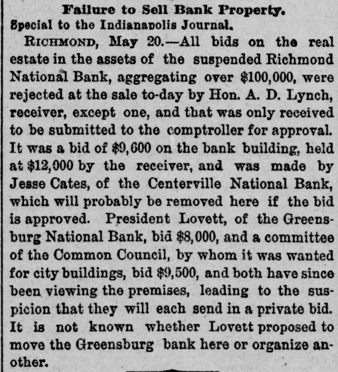 ANOTHER BANK SUSPENDS. The Richmond National Has Abundance of Good Assets, but Needs Current Funds. Special to the Indianapolis Journal. RICHMOND, Ind., July 21.-The - Richmond National Bank, of which Charles F. Coffin is president, and his son, Charles H. Coffin, cashier, was unable to pay its balances when the banks made their settlements this afternoon, and its doors will to-morrow stand closed. The officers claim that the assets certainly exceed the liabilities by upwards of $200,000, and that in the end even the stockholders will lose nothing, but that they must suspend for the want of funds to meet current demands. The accounts of a few of the largest depositors were settled to-day by transferring notes to them, and there will be an effort made to settle other accounts in the same way. Before any settlements were made, the deposit accounts amounted to $349,000. In this is included school funds, perhaps $20,000; county funds, said to be over $100,000, and Wayne township funds to an amount not stated. The settlements made to-day reduced the deposit accounts to $188,000. The bills payable amount to $20,000 more, making total lia bilities of $208,000. The officers claim to have good assets, including the notes used in settlement with depositors to-day, as follows: Loans and discounts, $580,000; cash items. $22,500; total, $602,500. There has been no run unon the bank. It had the complete confidence of its patrons, and a premium has been offered for its stock within a few days; yet there are those who have doubted its soundness for months back. Bank Examiner A. J. Hay has been telegraphed, and is expected to-night.
