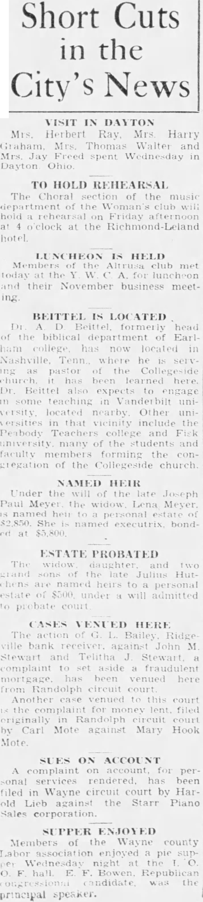Short Cuts in the City's News VISIT IN DAYTON Mrs. Herbert Ray Mrs. Harry Grabam, Mrs. Thomas Walter and Mrs. Jay Freed spent Wednesday in Dayton Ohio. TO HOLD REHEARSAL The Choral of the music department of the Woman club hold rehearsal on Friday afternoon o'clock at the Richmond-Leland hotel LUNCHEON IS HELD met today W luncheon and their November business meeting BEITTEL IS LOC ATED Dr Beittel formerly head of the biblical department of Earlham college has now located in ing as pastor of the Collegeside has been learned here Dr Beittel to engage m some teaching in Vanderbilt university located nearby Other universities in that vicinity include Perbody Teachers and Fisk university many of the students and faculty members forming the congregation of the Collegeside church NAMED HEIR Under the the late Joseph Paul Meyer the widow Lena Meyer $2,850. She named executrix bond ESTATE PROBATED The and two grand sons of the late Julius Hutchens are named heirs to personal estate of $500 under will admitted to probate court CASES VENUED HERE action Bailey Ridge ville bank receiver. against John M Stewart and Telitha Stewart complaint to set aside fraudulent mortgage has been venued here from Randolph circuit court Another venued to this court the complaint for money lent filed originally in Randolph circuit court by Carl Mote against Mary Hook Mote SUES ON ACCOUNT A complaint account, for per sonal services rendered, has been filed in Wayne circuit court by Harold Lieb against the Starr Piano Sales corporation. SUPPER ENJOYED Members of the Wayne county Labor association enjoyed pie Wednesday night at candidate was the principal speaker.