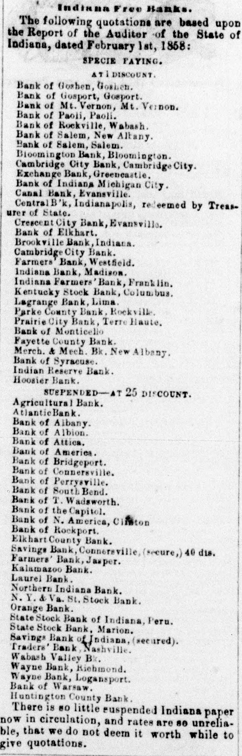 Indiana Free Banks. The following quotations are based upon the Report of the Auditor of the State of Indiana, dated February 1st, 1858: SPECIE PAYING. Atl DISCOUNT. Bank of Goshen, Goshen. Bank of Gosport, Gosport. Bank of Mt. Vernon, Mt. Vernon. Mani of Paeli, Paoli. of Rockville, Wabash. Bank of Salem, New Albany. Bank of Salem, Salem. Bloomington Bank, Bioomington. Cambridge City Bank, CambridgeCity, Exchange Bank, Greeneastle. Bank of Indiana Michigan City. Canal Bank, Hvamoville. CentralB'k, Indianapolis, redeemed urer of State. Crescent City Bank, Evansville. Bank of Kikhart. Brookville Bank, Indiana. CambridgeCity Bank. Farmers' Bank, Westfield. Indiana Bank, Madison. Indiana Farmers' Bank, Franklin. Kentucky Stock Bank, Columbus. Lagrange Bank, Lima. Parke County Bank. Rockville. Prairie City Bank, Terre llaute. Bank of Monticello Fayette County Bank. Merch. & Mech. Bk, New Albany. Bank of Syracuse. Indian Reserve Bank. Hooster Bank. SUSPENDED-AT 25 DISCOUNT. Agricultural Bank. AtlanticBank. Bank of Albany. Bank of Albion. Bank of Attica. Bank of America. Bank of Bridgeport. Bank of Commeraville. Bank of Perrysville. Bank of SouthBead. Bank of T. Wadsworth. Bank of the Capitol. Bank of N. America, Clinton Bank of Rockport. Elk) County Bank. Sav Bank, Connersville, (secure,) 40 dis. Fart re' Bank, Jasper. Kati ik. Lat No isna Bank. N. Stock Bank. Or State of Indiana, Peru. State ik, Marion. Havings Bank of Indiana, (seeured). Traders' Bank, Nashville. Wabash Valley Bk. Wayne Bank, Michmond. Wayne Bank, Logansport. Bank of Warraw. Huntington County Bank. There is #0 little suspended Indiana paper now in circulation, and rates are so unreliable, that we do not deem it worth while to give quotations.