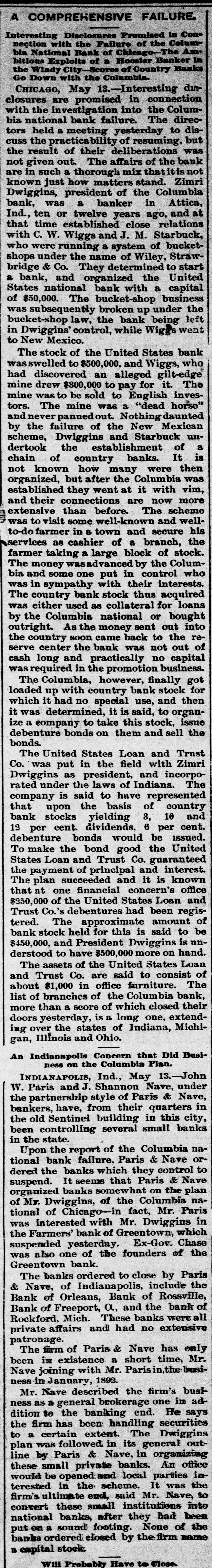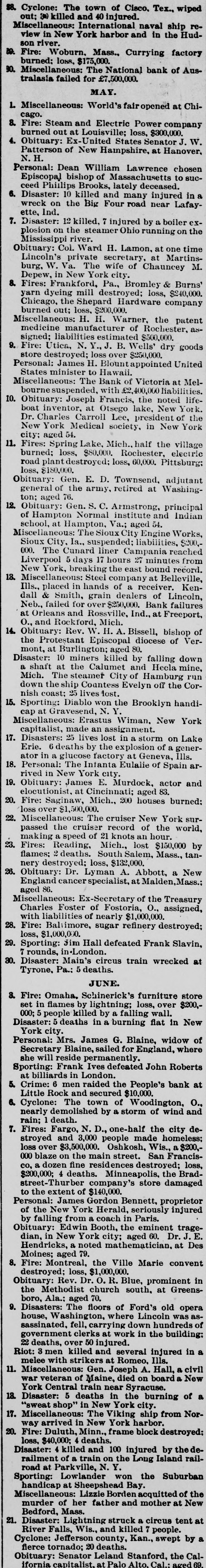 28. Cyclone: The town of Cisco, Tex., wiped out; 3) killed and 40 injured. Miscellaneous: International naval ship review in New York harbor and in the Hudson river. to. Fire: Woburn. Mass., Currying factory burned; loss, $175,000. 90. Miscellaneous: The National bank of Australasia failed for £7,500,000. MAY. 1. Miscellaneous: World's airopened at Chicago. 8. Fire: Steam and Electric Power company burned out at Louisville; loss, $300,000. 4. Obituary: Ex-United States Senator J. W. Patterson of New Hampshire, at Hanover, N.H. Personal: Dean William Lawrence chosen Episcopal bishop of Massachusetts to succeed Phillips Brooks, lately deceased. 6. Disaster: 10 killed and many injured in a wreck on the Big Four road near Lafayette, Ind. 7. Disaster: 12 killed, 7 injured by a boiler explosion on the steamer Ohio running on the Mississippi river. Obituary: Col. Ward H. Lamon, at one time Lincoln's private secretary, at Martinsburg, W. Va. The wife of Chauncey M. Depew, in New York city. 8. Fires: Frankford, Pa., Bromley & Burns' yarn dyeing mill destroyed; loss, $240,000. Chicago, the Shepard Hardware company burned out; loss, $200,000. Miscellaneous: H. H. Warner, the patent medicine manufacturer of Rochester, assigned; liabilities estimated $500,000. 9. Fire: Utica, N. Y.,J. B. Wells' dry goods store destroyed; loss over $250,000. Personal: James H. Blount appointed United States minister to Hawaii. Miscellaneous: The Bank of Victoria at Melbournesuspended, with 10. Obituary: Joseph Francis, the noted lifeboat inventor, at Otsego lake, New York. Dr. Charles Carroll Lee, president of the New York Medical society, in New York city: aged 54. 11. Fires: Spring Lake, Mich., half the village burned; loss, $80,000. Rochester, electric road plant destroyed: loss, 60,000. Pittsburg: loss, $180,000. Obituary: Gen. E. D. Townsend, adjutant general of the army, retired at Washington; aged 76. 12. Obituary: Gen. S. C. Armstrong, principal of Hampton Normal institute and Indian school, at Hampton, Va.; aged 54. Miscellaneous: The Sioux City Engine Works, Sioux City, Ia., suspended; liabilities, $200,000. The Cunard liner Campania reached Liverpool 5 days 17 hours 27 minutes from New York, breaking the east bound record. 13. Miscellaneous: Steel company at Belleville, Ills., placed in hands of a receiver. Kendall & Smith, grain dealers of Lincoln, Neb., failed for over $250,000. Bank failures at Orleans and Rossville, Ind., at Freeport, O., and Rockford, Mich. 14. Obituary: Rev. W. H. A. Bissell, bishop of the Protestant Episcopal diocese of Vermont, at Burlington; aged 80. Disaster: 10 miners killed by falling down a shaft at the Calumet and Hecla mine, Mich. The steamer City of Hamburg run down theship Countess Evelyn off the Cornish coast; 25 lives lost. 15. Sporting: Diablo won the Brooklyn handicap at Gravesend, N. Y. Miscellaneous: Erastus Wiman, New York capitalist, made an assignment. 17. Disasters: 25 lives lost in a storm on Lake Erie. 6 deaths by the explosion of a generator in a glucose factory at Geneva, Ills. 18. Personal: The Intanta Eulalie of Spain arrived in New York city. 19. Obituary: James E. Murdock, actor and elocutionist, at Cincinnati; aged 83. 20. Fire: Saginaw, Mich., 200 houses burned: loss over $1,500,000. 22. Miscellaneous: The cruiser New York surpassed the cruiser record of the world, making a speed of 21 knots an hour. 23. Fires: Reading, Mich., lost $150,000 by flames; 2 deaths. South Salem, Mass., tannery destroyed; loss, $132,000. 26. Obituary: Dr. Lyman A. Abbott, a New England cancerspecialist, at Malden,Mass.; aged 86. Miscellaneous: Ex-Secretary of the Treasury Charles Foster of Fostoria, O., assigned, with liabilities of nearly $1,000,000. 28. Fire: Balimore, sugar refinery destroyed; loss, $1,000,000. 29. Sporting: Jim Hall defeated Frank Slavin, 7 rounds, inLondon. 30. Disaster: Main's circus train wrecked at Tyrone. Pa.: 5 deaths. JUNE. 8. Fire: Omaha. Schinerick's furniture store set in flames by lightning; loss, over $200,000; 5 people killed by a falling wall. Disaster: 5 deaths in a burning flat in New York city. Personal: Mrs. James G. Blaine, widow of Secretary Blaine, sailed for England, where she will reside permanently. Sporting: Frank Ives defeated John Roberts at billiards in London. 5. Crime: 6 men raided the People's bank at Little Rock and secured $10,000. 6. Cyclone: The town of Woodington, O., nearly demolished by a storm of wind and rain; death. 7. Fires: Fargo, N. D., one-half the city destroyed and 3,000 people made homeless; loss over $3,500,000. Oshkosh, Wis., $200,000 blaze on the main street. San Francisco, a dozen fine residences destroyed; loss, $200,000; 4 deaths. Minneapolis, the Bradstreet-Thurber company's store damaged to the extent of $140,000. Personal: James Gordon Bennett, proprietor of the New York Herald, seriously injured by falling from a coach in Paris. Obituary: Edwin Booth, the eminent tragedian, in New York city; aged 60. Dr. J. E. Hendricks, a noted mathematician, at Des Moines; aged 79. 8. Fire: Montreal, the Ville Marie convent destroyed; loss, $1,000,000. Obituary: Rev. Dr. O. R. Blue, prominent in the Methodist church south, at Greensboro, Ala.: aged 70. 9. Disasters: The floors of Ford's old opera house, Washington, where Lincoln was assassinated, fell, carrying down hundreds of government clerks at work in the building: 22 deaths, over 50 injured. Riot: 3 men killed and several injured in a melee with strikers at Romeo, Ills. 11. Miscellaneous: Gen. Joseph A. Hall, a civil war veteran of Maine, died on board a New York Central train near Syracuse. 18. Disaster: 5 deaths in the burning of a "sweat shop" in New York city. 17. Miscellaneous: The Viking ship from Norway arrived in New York harbor. 20. Fire: Duluth, Minn., frame block destroyed: loss, $40,000; deaths. Disaster: 4 killed and 100 injured by the derailment of a train on the Long Island railroad at Parkville, N.Y. the Suburban Sporting: Lowlander won hand