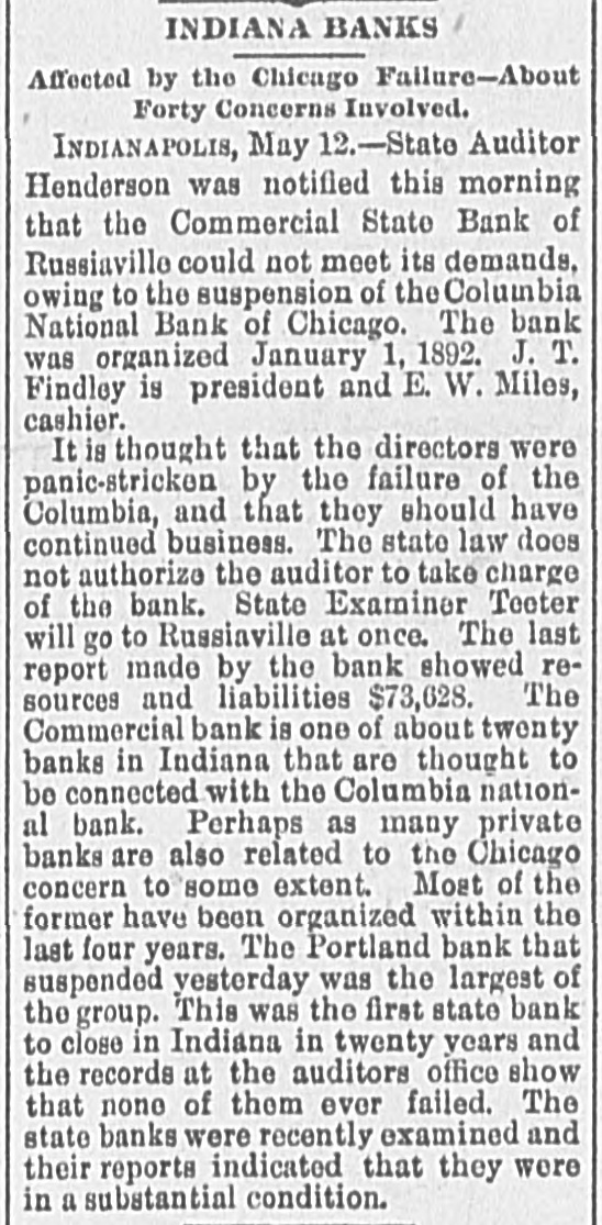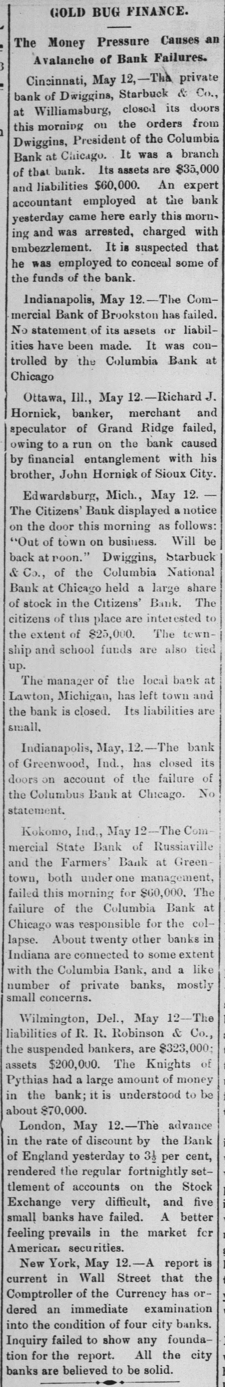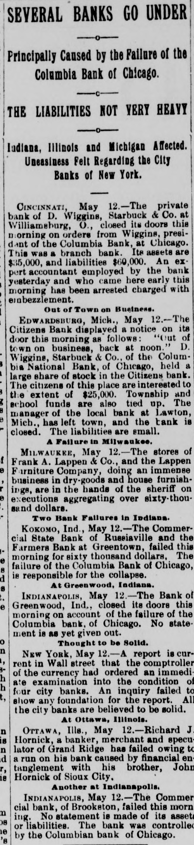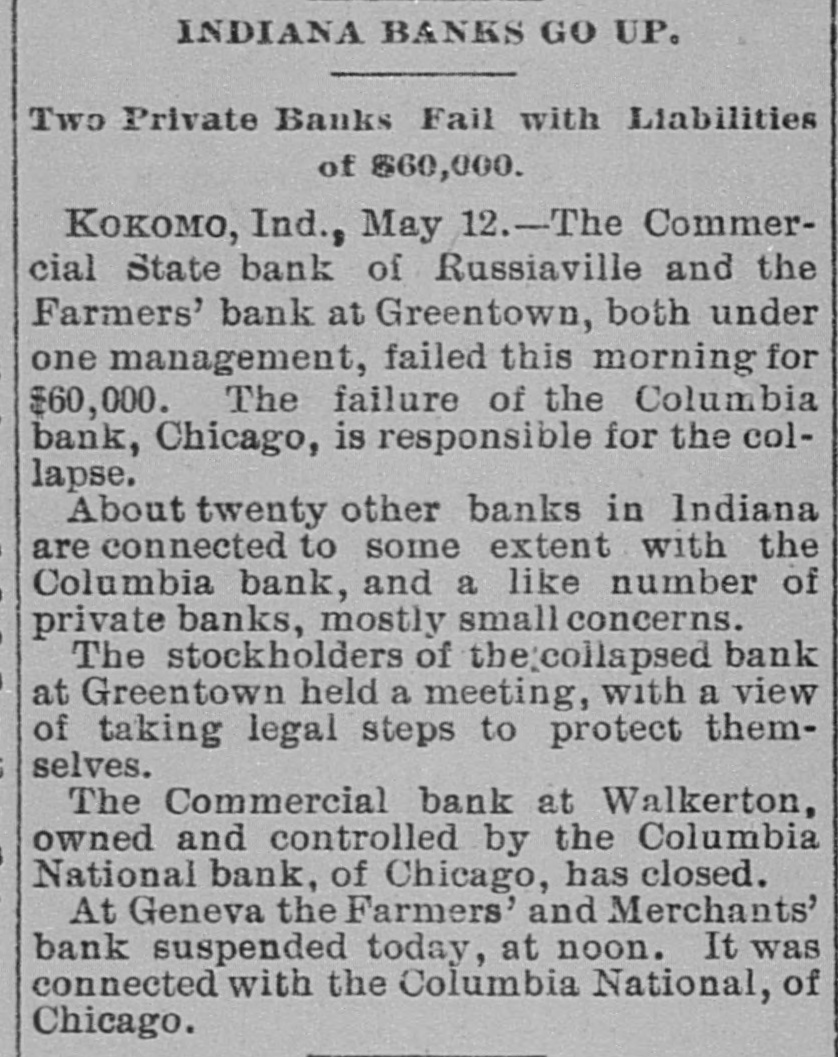 MANY BANK FAILURES. Panic Stricken Bankers in Indiana Country Towns. DRAGGED DOWN BY THE COLUMBIA. The Panic Spreads to Michigan and Ohio Banks, and Several Suspensions Are Added to the List in These States-Pecullar Methods of the Columbia Bank. May 13.-The failure of the a Columbia CHICAGO, National bank has disclosed of shystering without a parallel and in system American banking. The president to of the Columbia is shown have manager organized about fifty small concerns and insignificant points in Indiana of at all of which were correspondents likely Ohio, broken bank, and it is scarcely the the that of them will survive. But litany were at places where there was be banks business the moral effect is likely to The tle serious than the actual business losses. in Columbia more had very little chiefly Chicago, and such as it had was were with customers who, like the bank, the without commercial standing. Hence business was not felt in reputable other failure and had it occurred at any half circles, time it would have been forgotten in an hour. PORTLAND, Ind., May 13.-A courier the Dunkirk announces the failure of confrom Dunkirk bank, which is owned and by Dwiggins, Starbuck & Co., filed of trolled Chicago. Attachments were at once to and deputy sheriff left immediately The a all the available property. the levy on has failed for at least $75,000, and bank may reach $100,000. The firm con- of trolling amount this bank owns a number and these are reported to havegone enothers, to the wall. The Geneva bank of their terprise also has failed. INDIANAPOLIS, Ind. May 13.-State Audi- ComHenderson was notified that the could tor mercial State bank, of Russiaville, its demands. The Commercial in not meet is one of about twenty banks Indiana bank that are thought to be connected as with the Columbia National. Perhaps to the private banks are also related many Chicago concern to some extent. Reports show other small places in the state banks. that from a panic has seized the smaller county, bank at Brookston, White (o statesuspended The yesterday afternoon. made. It of its condition has been ment controlled by the Columbia National. was banks of the Columbia Nationalstring said to The Moreystown and Greenwood are liabilities at have also failed, the latter with amounting to $60,000. The Moreystown bank is of considerable importance, having a capital addition of $75,000. to the above the following bank, In are reported: Citizens' suspensions Ind. Bank of Spiceland, SpiceHebron, Ind.; Monroeville bank, Monroeville, Ind., land, Commercial bank, Norristown, these Ind.; Citizens' bank, Knox, Ind. All of were and branches of the Columbia National Chicago. INDIANAPOLIS, May B.-The directors that the Capital National bank claim and of has been no loss on discounts, dollar. there not a department has lost a that bank, they say, is more than solvent. The will ask the examiner to permit They resumption after an examination. FORT WAYNE, Ind., May 13, -News Mer- of suspension of the Farmers' and reached chants' the bank at Geneva, Ind., has the here. It was the oldest institution of kind in the town. CINCINNATI, O., May 13. -The private & firm of Dwiggins, Starbuck failed. banking at Williamsburgh, O., has of the Co., failure is due to the failure Mr. The Columbia bank, of Chicago, of which is was cashier. About $8,000 the Dwiggins the Williamsburg bank from will due Columbia, all of which, it is thought, Williamslost. The postmaster at be ordered the arrest, for alleged burgh, embezzlement, of Lawrence G. Good, cusexpert accountant. He was taken in tody. O., May 13.-The Farmers' CONVOY, of this place, has closed its doors, bank caused by its relations with the Columbia National. EDWARDSBURG, Mich., May 13. -The Cit- its bank, of this place, has closed izens' About $25,000 of local deposits, todoors. gether with township and school funds, Chiare re affected. It was a branch of the cago Columbia. RICHLAND, Mich., May 13. -The Union a branch of the Columbia National bank, bank, of Chicago, has closed its doors. Cashier Watts says that the depositors will be paid in full and the bank running again in two or three days. CHARLEVOIX, Mich., May 13.-W. P. & Co., bankers, doing business unBrown the name of the Bank of Charlevoix, Kane. have der made an assignment to R. W. PAW PAW, Mich., May 13. Great excitement prevails at Lawton. The managers the in of a local bank there did not open town stitution yesterday, having left Thursday night. Citizens have about$18,000 deposited in the bank. LAWTON, Mich., May 13.-The American It of this city has closed its doors. bank controlled by the Columbia National business bank is of Chicago. Nearly every in the city is involved, besides depositors. many farmers man and others who were The deposits amount to about $30,000. SAN JOSE, Cal., May -The liabilities to the Santa Clara bank are now stated by of $300,000. Assurances had been given the be officers of the bank that the depositors would be paid in full