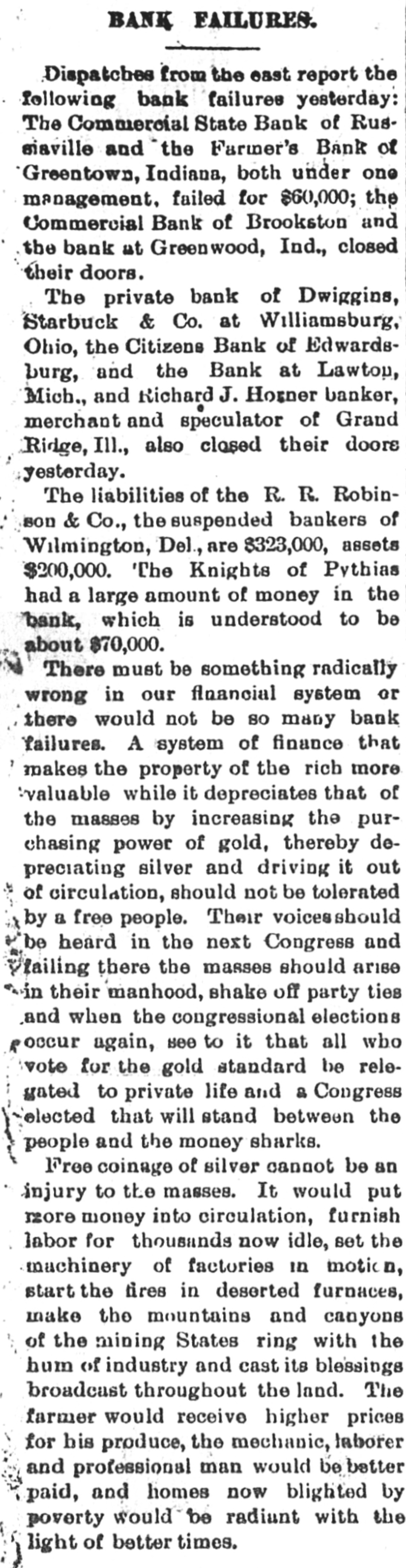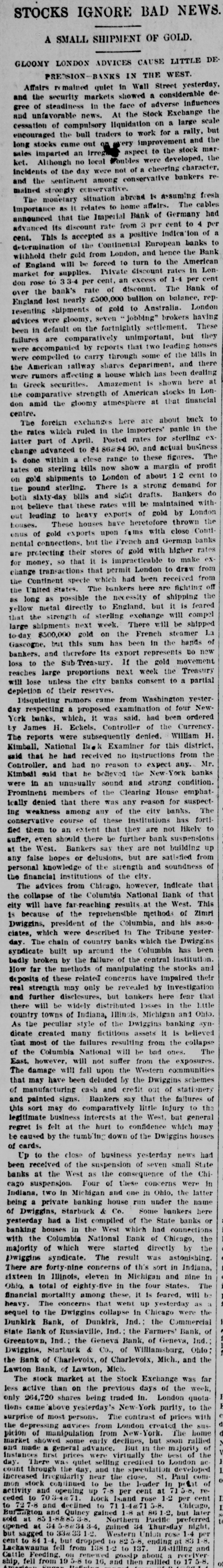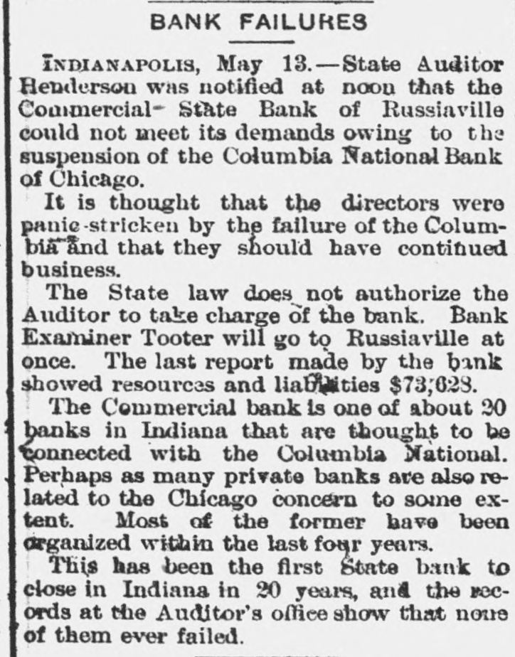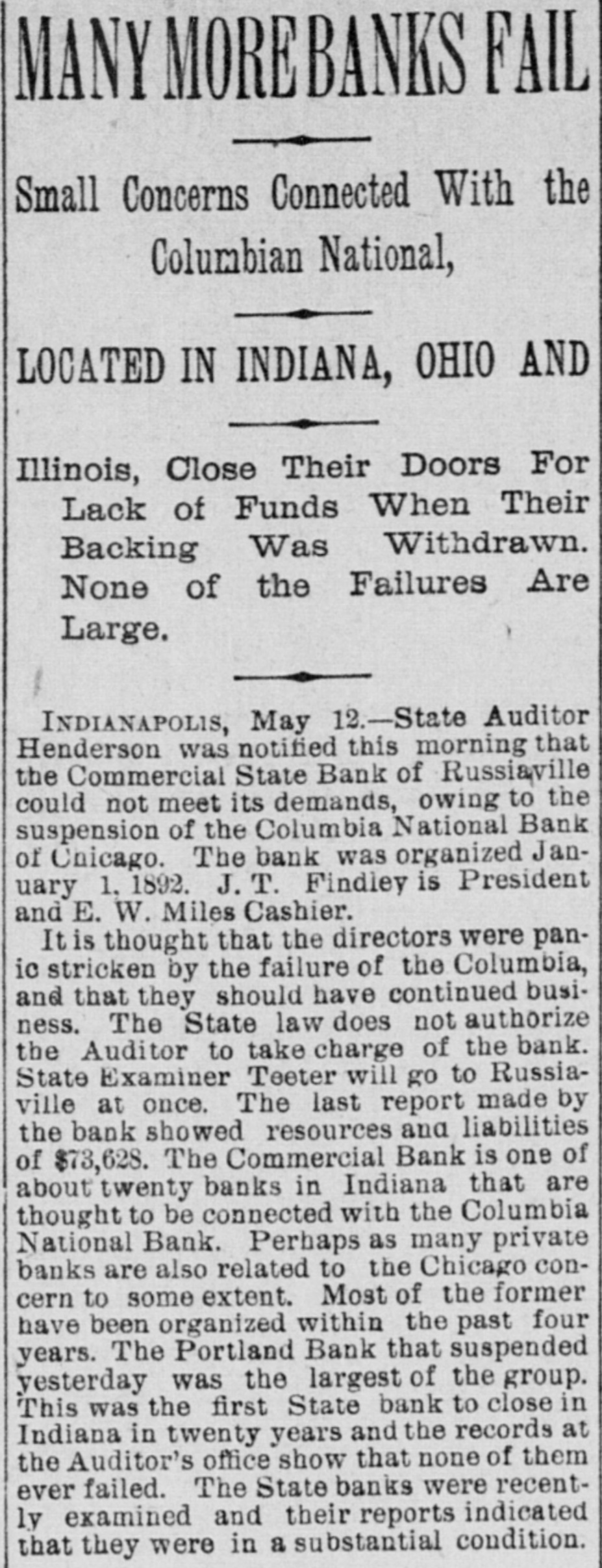 MANY BANK FAILURES. Panic Stricken Bankers in Indiana Country Towns. DRAGGED DOWN BY THE COLUMBIA. The Panic Spreads to Michigan and Ohio Banks, and Several Suspensions Are Added to the List in These States-Pecullar Methods of the Columbia Bank. May 13.-The failure of the a Columbia CHICAGO, National bank has disclosed of shystering without a parallel and in system American banking. The president to of the Columbia is shown have manager organized about fifty small concerns and insignificant points in Indiana of at all of which were correspondents likely Ohio, broken bank, and it is scarcely the the that of them will survive. But litany were at places where there was be banks business the moral effect is likely to The tle serious than the actual business losses. in Columbia more had very little chiefly Chicago, and such as it had was were with customers who, like the bank, the without commercial standing. Hence business was not felt in reputable other failure and had it occurred at any half circles, time it would have been forgotten in an hour. PORTLAND, Ind., May 13.-A courier the Dunkirk announces the failure of confrom Dunkirk bank, which is owned and by Dwiggins, Starbuck & Co., filed of trolled Chicago. Attachments were at once to and deputy sheriff left immediately The a all the available property. the levy on has failed for at least $75,000, and bank may reach $100,000. The firm con- of trolling amount this bank owns a number and these are reported to havegone enothers, to the wall. The Geneva bank of their terprise also has failed. INDIANAPOLIS, Ind. May 13.-State Audi- ComHenderson was notified that the could tor mercial State bank, of Russiaville, its demands. The Commercial in not meet is one of about twenty banks Indiana bank that are thought to be connected as with the Columbia National. Perhaps to the private banks are also related many Chicago concern to some extent. Reports show other small places in the state banks. that from a panic has seized the smaller county, bank at Brookston, White (o statesuspended The yesterday afternoon. made. It of its condition has been ment controlled by the Columbia National. was banks of the Columbia Nationalstring said to The Moreystown and Greenwood are liabilities at have also failed, the latter with amounting to $60,000. The Moreystown bank is of considerable importance, having a capital addition of $75,000. to the above the following bank, In are reported: Citizens' suspensions Ind. Bank of Spiceland, SpiceHebron, Ind.; Monroeville bank, Monroeville, Ind., land, Commercial bank, Norristown, these Ind.; Citizens' bank, Knox, Ind. All of were and branches of the Columbia National Chicago. INDIANAPOLIS, May B.-The directors that the Capital National bank claim and of has been no loss on discounts, dollar. there not a department has lost a that bank, they say, is more than solvent. The will ask the examiner to permit They resumption after an examination. FORT WAYNE, Ind., May 13, -News Mer- of suspension of the Farmers' and reached chants' the bank at Geneva, Ind., has the here. It was the oldest institution of kind in the town. CINCINNATI, O., May 13. -The private & firm of Dwiggins, Starbuck failed. banking at Williamsburgh, O., has of the Co., failure is due to the failure Mr. The Columbia bank, of Chicago, of which is was cashier. About $8,000 the Dwiggins the Williamsburg bank from will due Columbia, all of which, it is thought, Williamslost. The postmaster at be ordered the arrest, for alleged burgh, embezzlement, of Lawrence G. Good, cusexpert accountant. He was taken in tody. O., May 13.-The Farmers' CONVOY, of this place, has closed its doors, bank caused by its relations with the Columbia National. EDWARDSBURG, Mich., May 13. -The Cit- its bank, of this place, has closed izens' About $25,000 of local deposits, todoors. gether with township and school funds, Chiare re affected. It was a branch of the cago Columbia. RICHLAND, Mich., May 13. -The Union a branch of the Columbia National bank, bank, of Chicago, has closed its doors. Cashier Watts says that the depositors will be paid in full and the bank running again in two or three days. CHARLEVOIX, Mich., May 13.-W. P. & Co., bankers, doing business unBrown the name of the Bank of Charlevoix, Kane. have der made an assignment to R. W. PAW PAW, Mich., May 13. Great excitement prevails at Lawton. The managers the in of a local bank there did not open town stitution yesterday, having left Thursday night. Citizens have about$18,000 deposited in the bank. LAWTON, Mich., May 13.-The American It of this city has closed its doors. bank controlled by the Columbia National business bank is of Chicago. Nearly every in the city is involved, besides depositors. many farmers man and others who were The deposits amount to about $30,000. SAN JOSE, Cal., May -The liabilities to the Santa Clara bank are now stated by of $300,000. Assurances had been given the be officers of the bank that the depositors would be paid in full